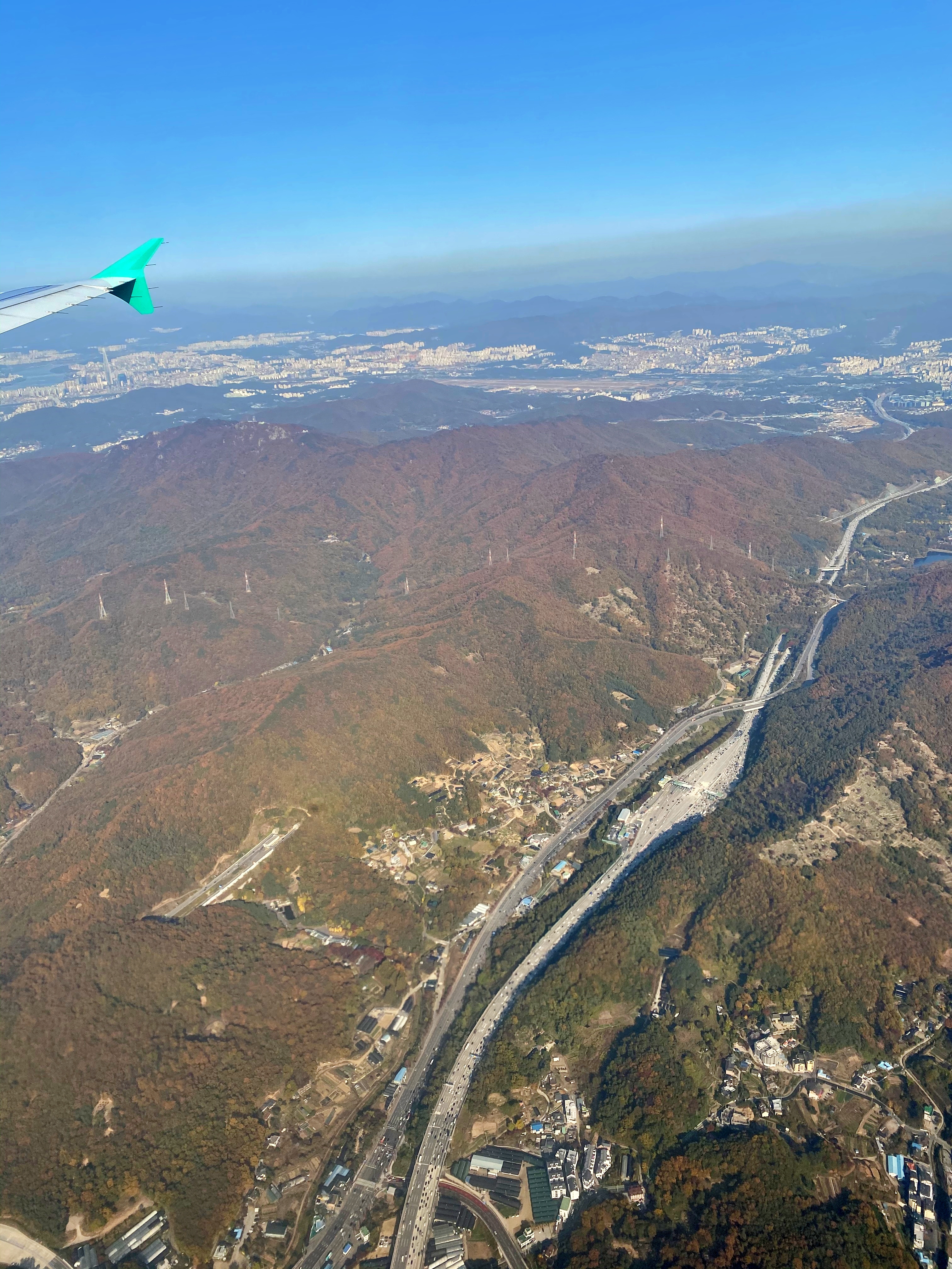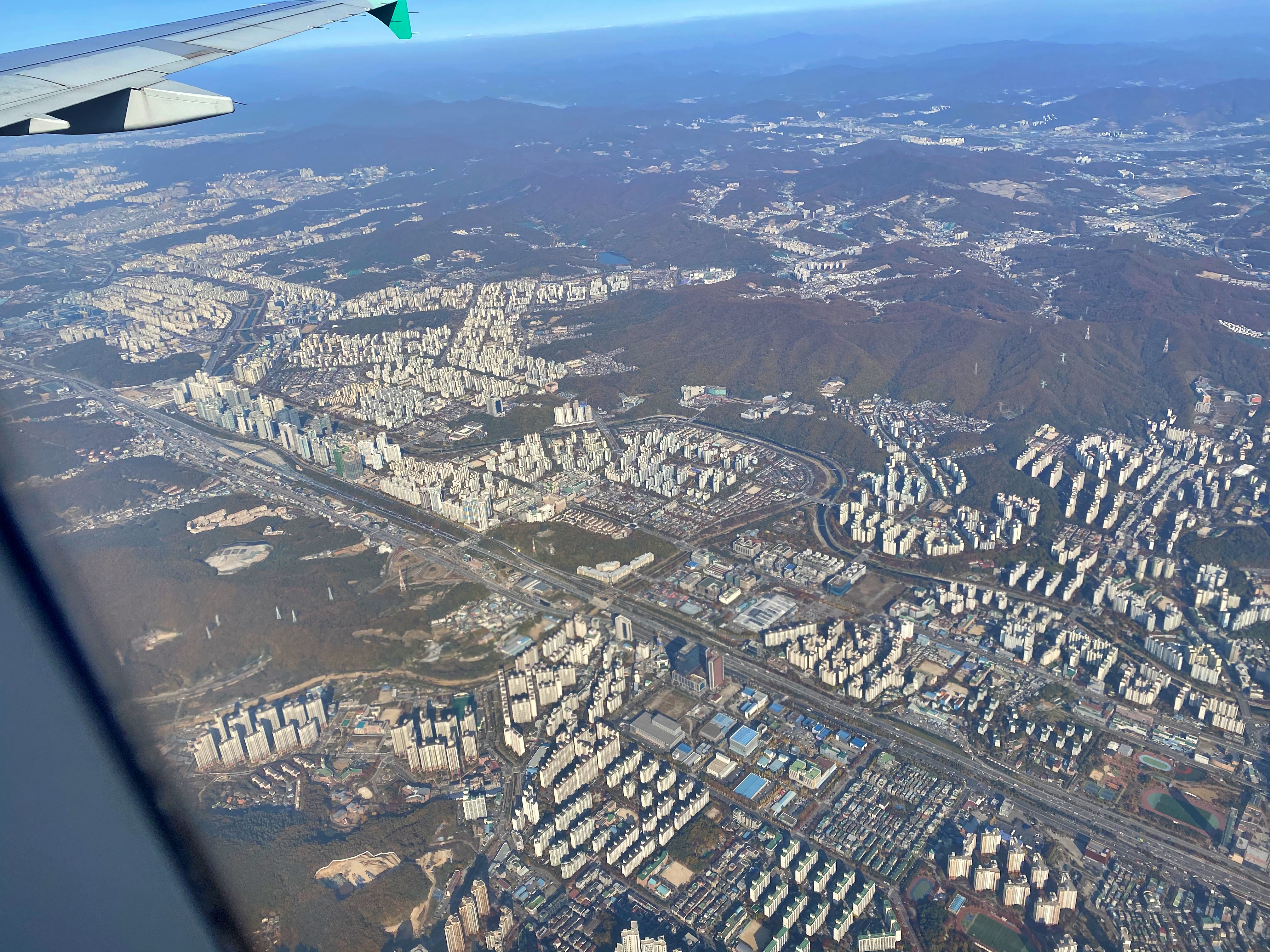 용인정도 오니 곧 우리 비행기는 착륙 할 예정이라는 안내방송이 나옵니다. 위 사진은 용인시 수지구 상공을 지나며 촬영한 사진입니다. 뭐 바로 아래 보이는 곳이 흔히 수지라 부르는 풍덕천동 일원이고, 우측 위로 보이는 곳이 죽전입니다. 쭉 뻗은 도로는 경부고속도로입니다. 차를 타고 가면 그래도 한참 가는 거리인데 사진 좌측으로 서울톨게이트가 보이고 분당신도시가 펼쳐져 있습니다.