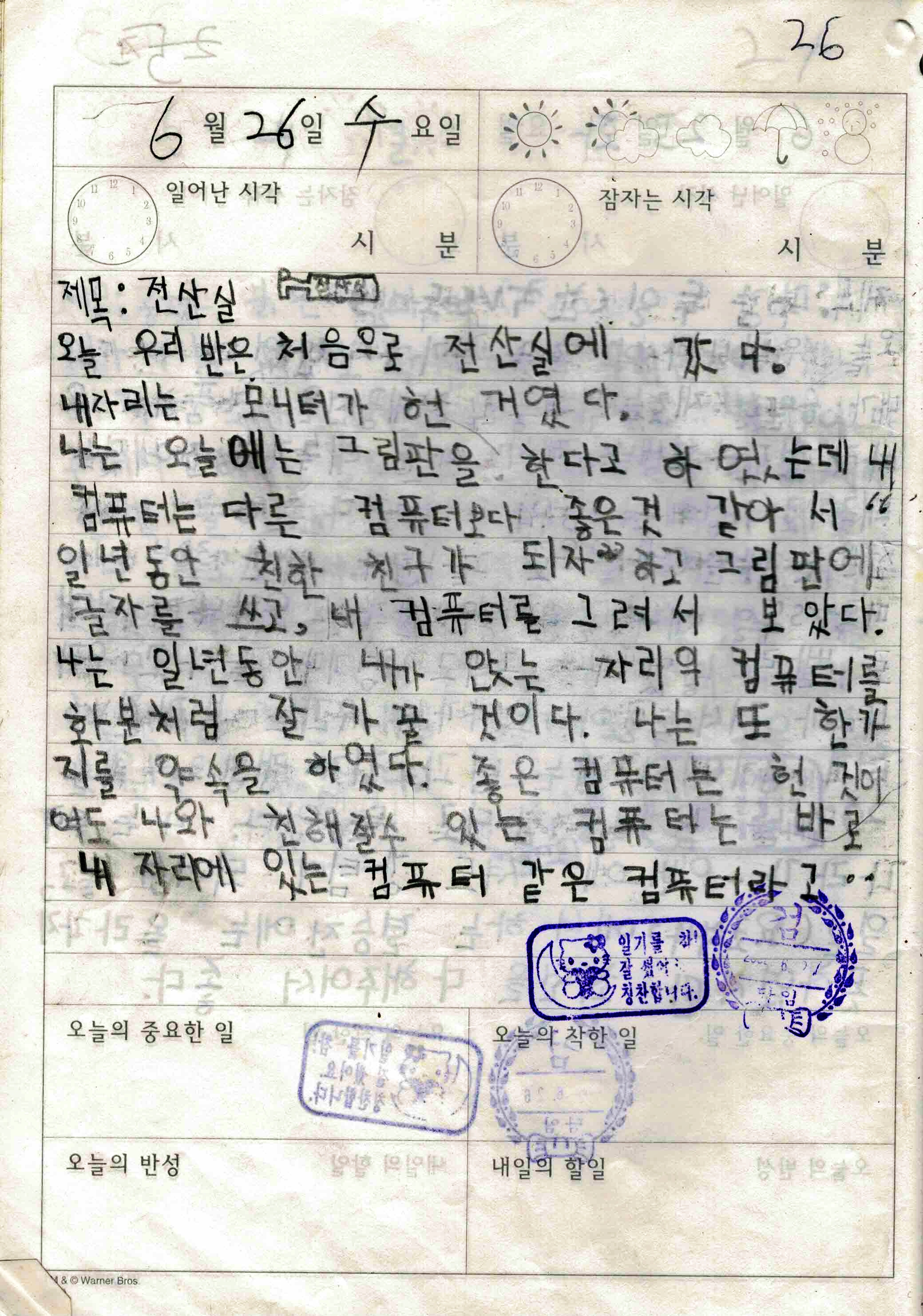 오랜만에 초딩일기를 가져왔습니다. 물론 지금은 딱히 초등학생들에게 컴퓨터 사용법과 관련된 교육을 하지 않아도 다들 잘 다룰 줄 알고 4차산업혁명 시대에 맞춰 초등학생들에게도 간단한 코딩교육과 마인크래프트를 활용한 교육이 이루어지고 있다고 합니다. 제가 초등학교에 다니던 시절만 하더라도 한참 초고속 인터넷 보급과 정보화 시대를 맞이하는 시기이다보니 방과후학습으로 따로 자극증과 관련된 수업을 수강하지 않는 이상 교과과정에서는 기본적인 컴퓨터 활용방법에 대한 교육이 전부였습니다.