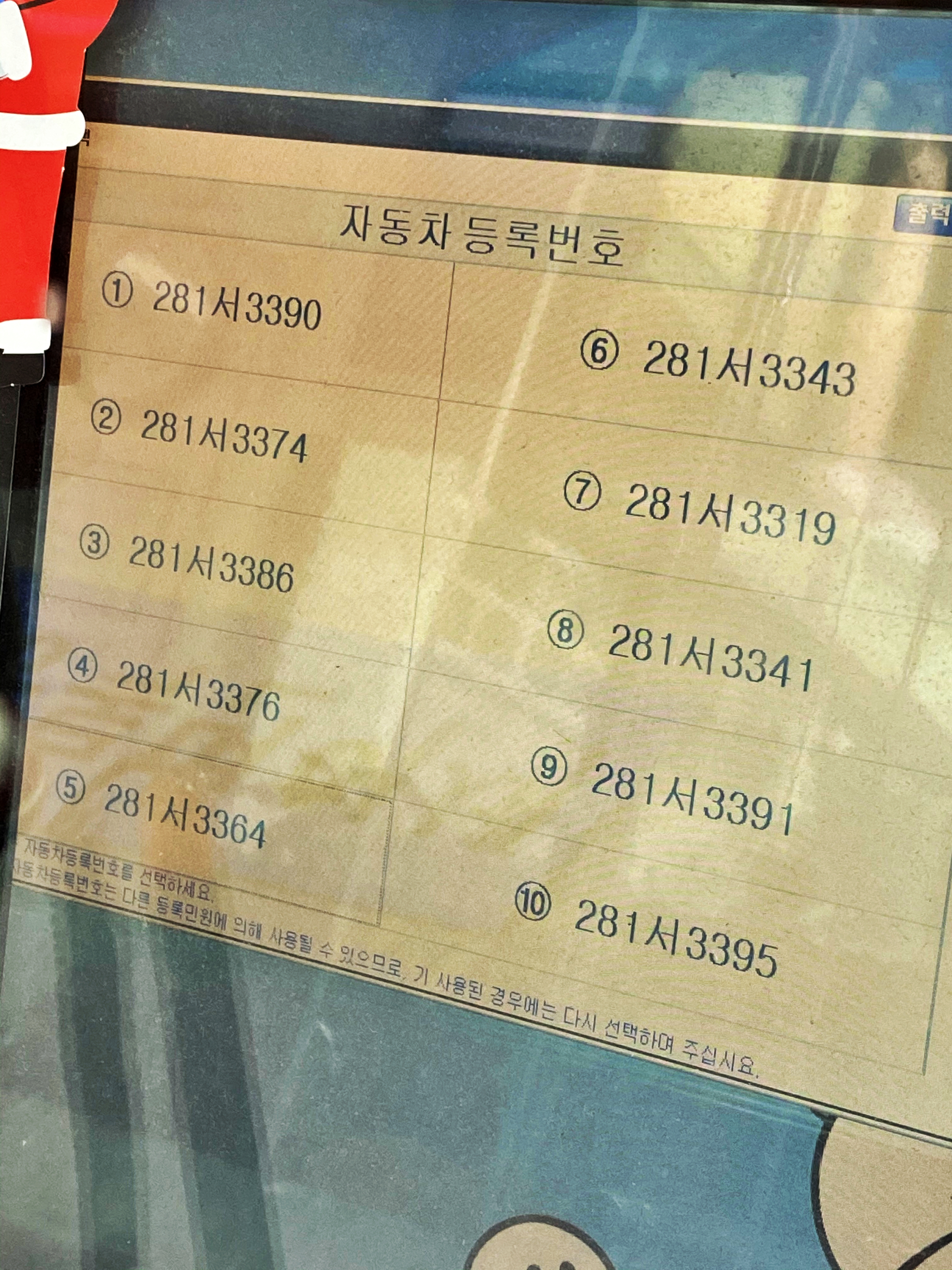 일단은 반사번호판을 부착하려는 목적으로 왔지만, 천공형에서 혹시 좋은 번호가 나올지 몰라 천공형부터 돌려주고 반사판을 돌려보기로 합니다. 천공형이 상대적으로 선택하는 사람이 적어 좋은 번호가 많다고 하는데 일단 부터 돌려달라 했지만 다 막번호라 패스. 반사판을 돌리니 쓸만한 번호가 하나 보이네요.