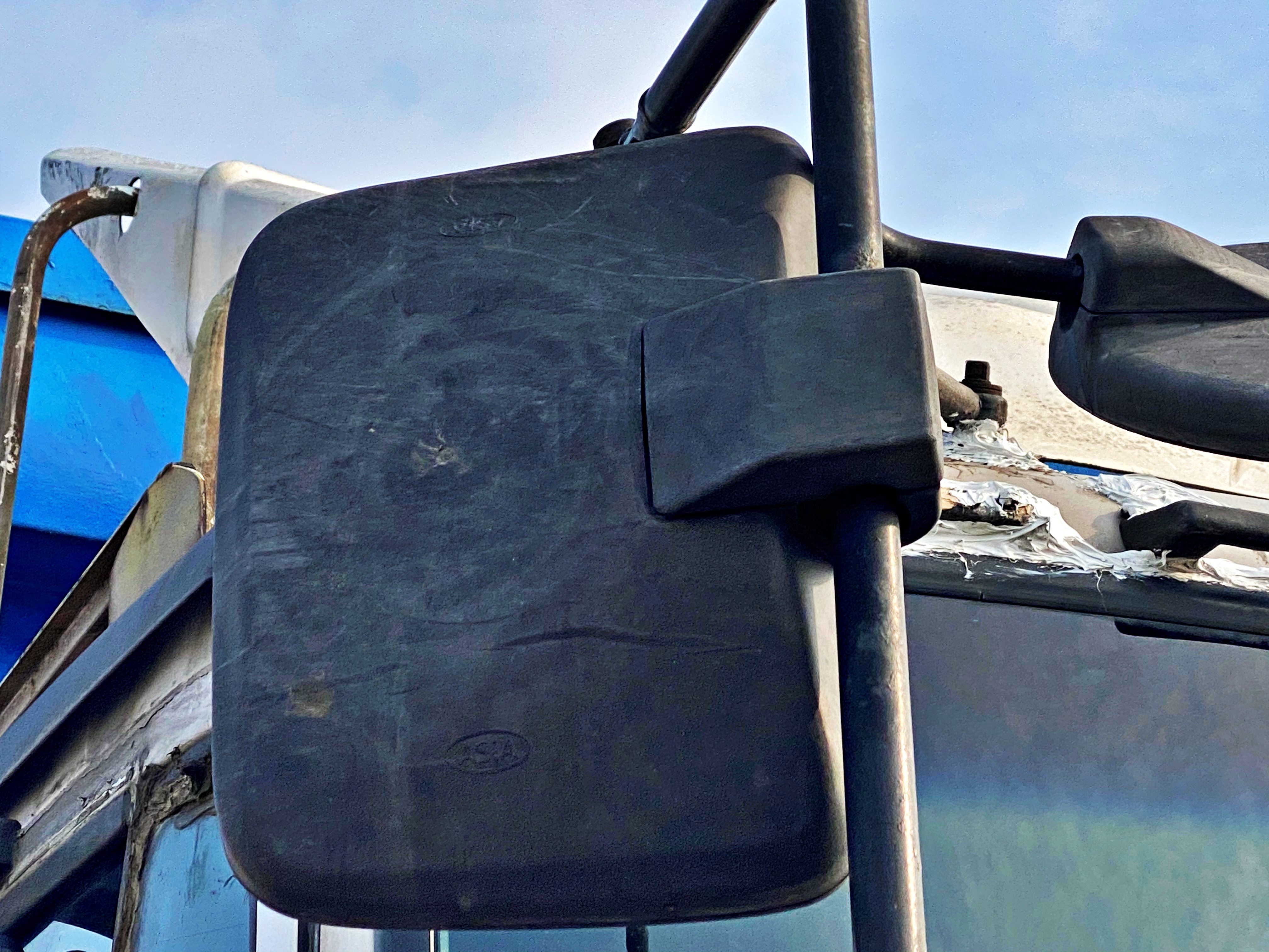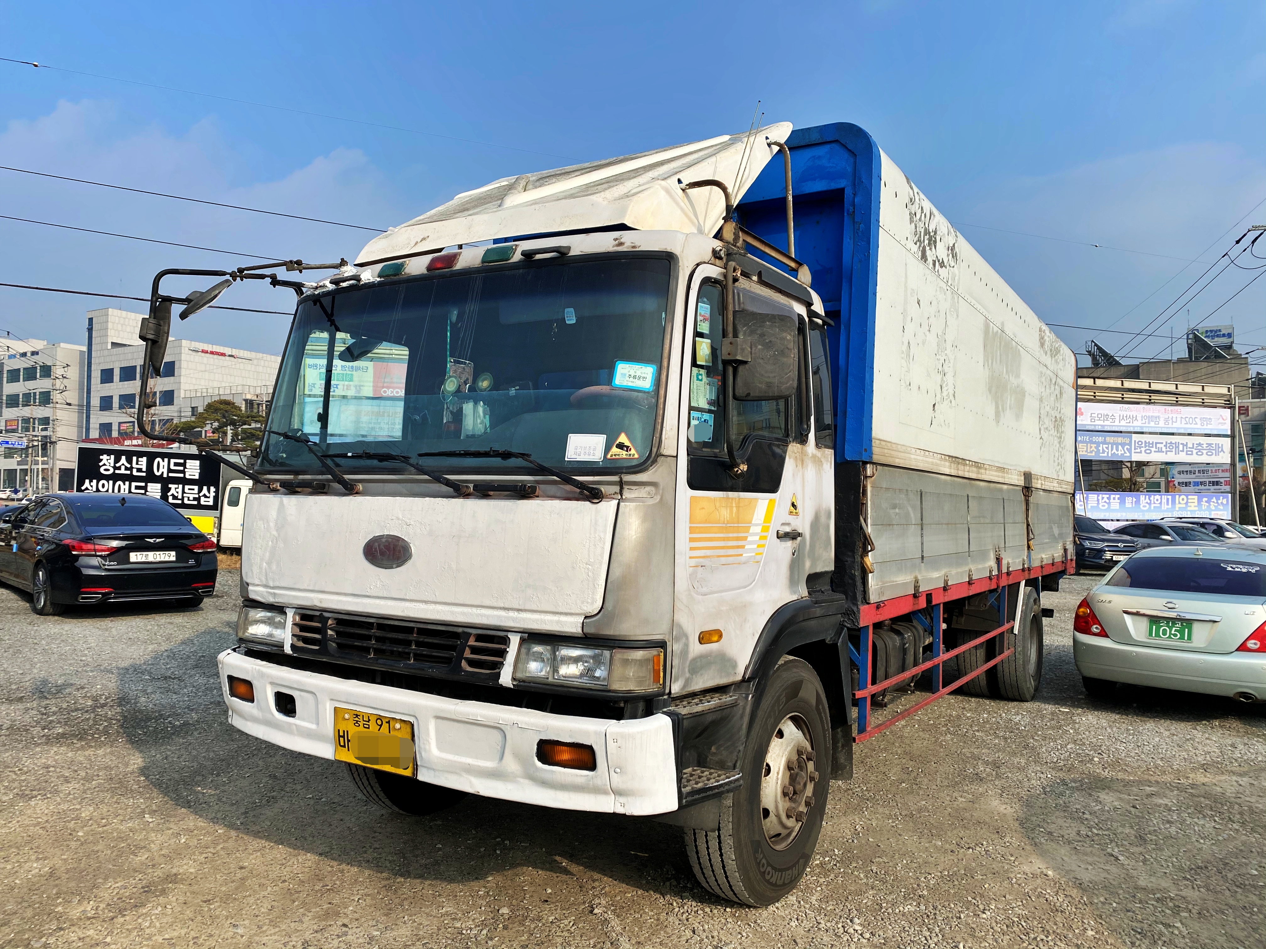 원부상으로는 4X2 카고모델입니다. 95년 10월에 등록된 '그랜토8.5톤카고트럭'으로 표시됩니다. 물론 당시에도 순정 윙바디 모델이 존재하기는 했지만, 카고트럭으로 굴리다가 이후 윙바디 적재함을 올린듯 보입니다. 전면부는 흰색 페인트로 덧칠이 된 상태. 유리창 위로 누수가 되는건지 실리콘을 도포해놓기도 했네요.