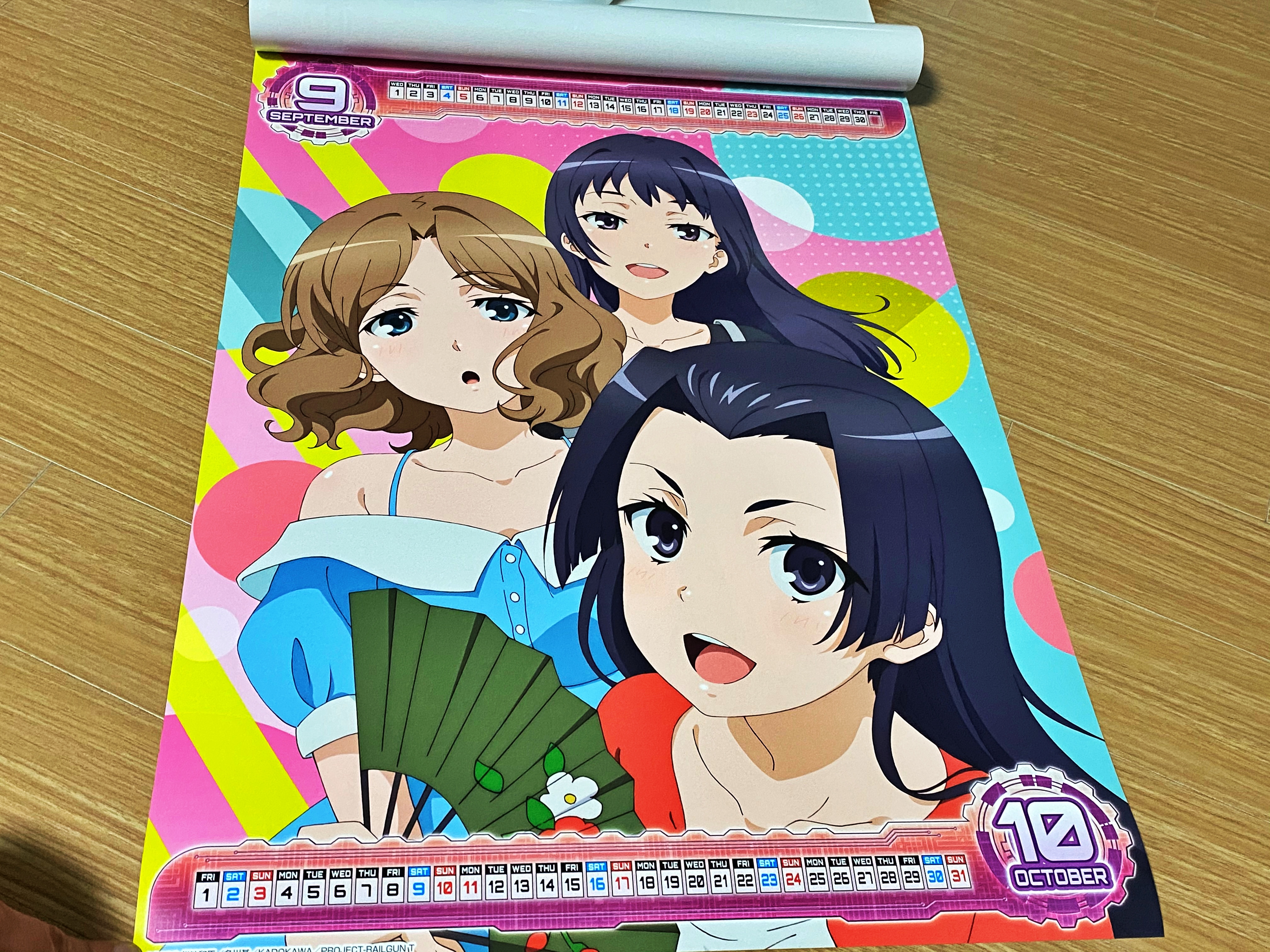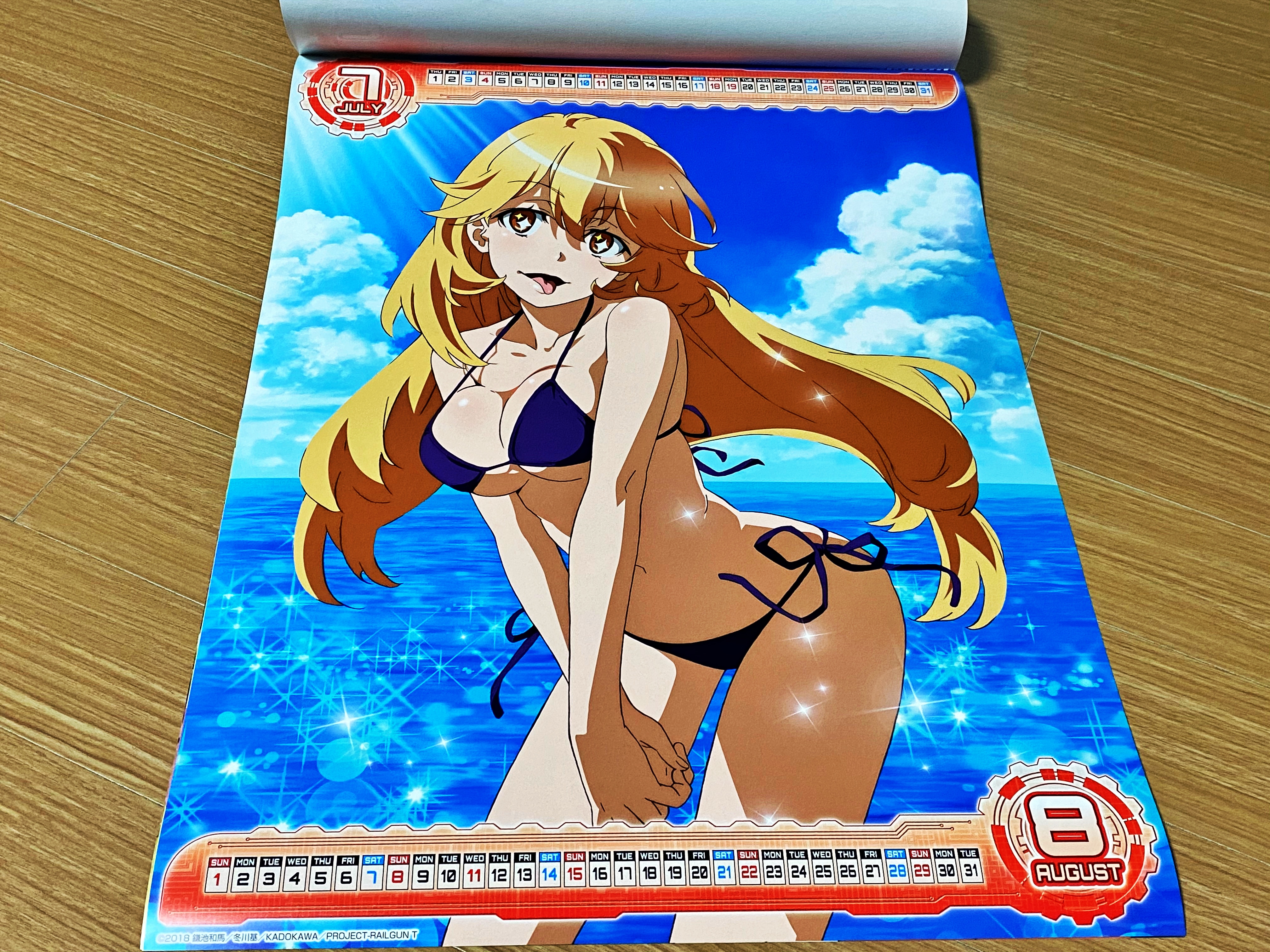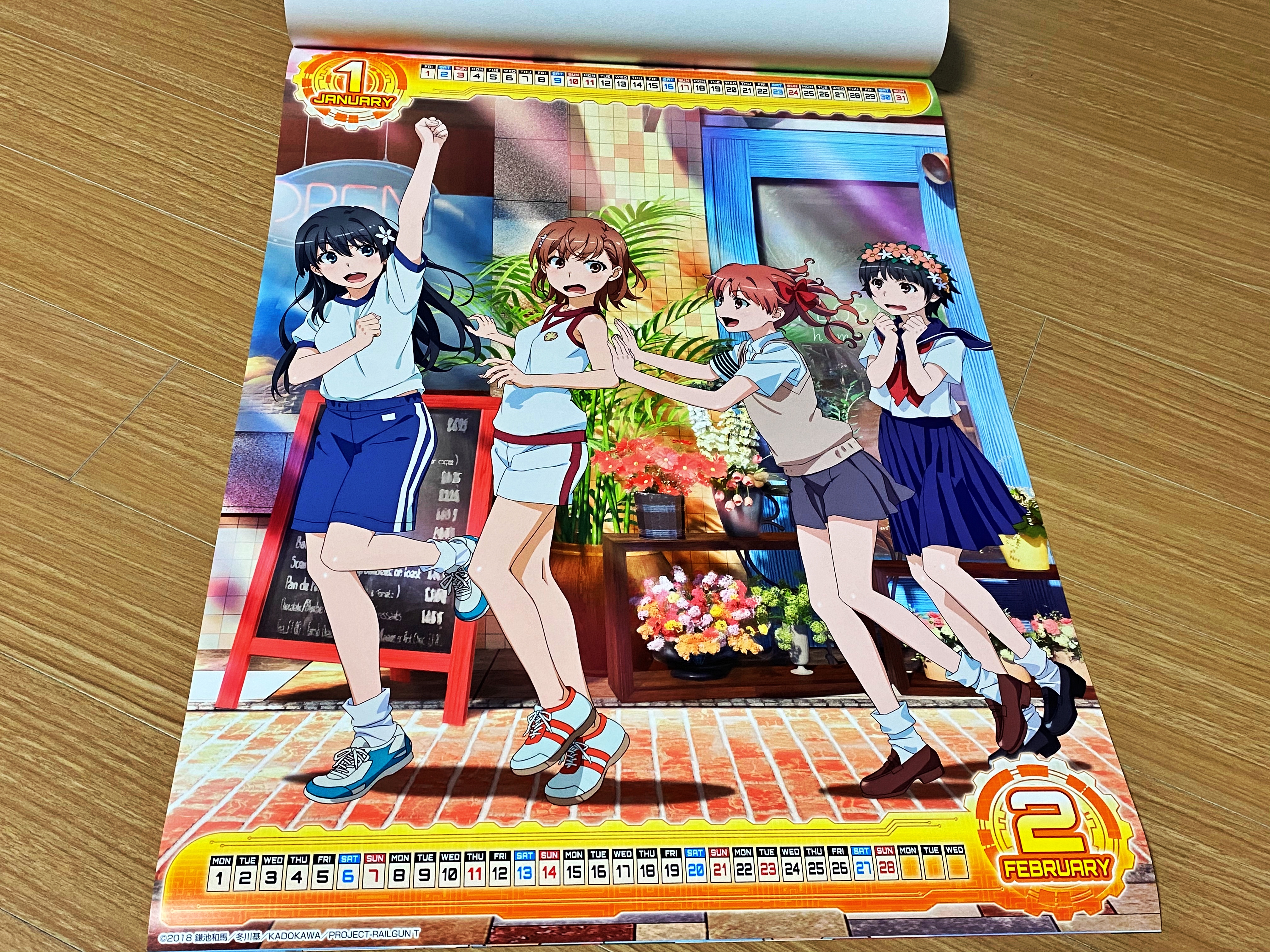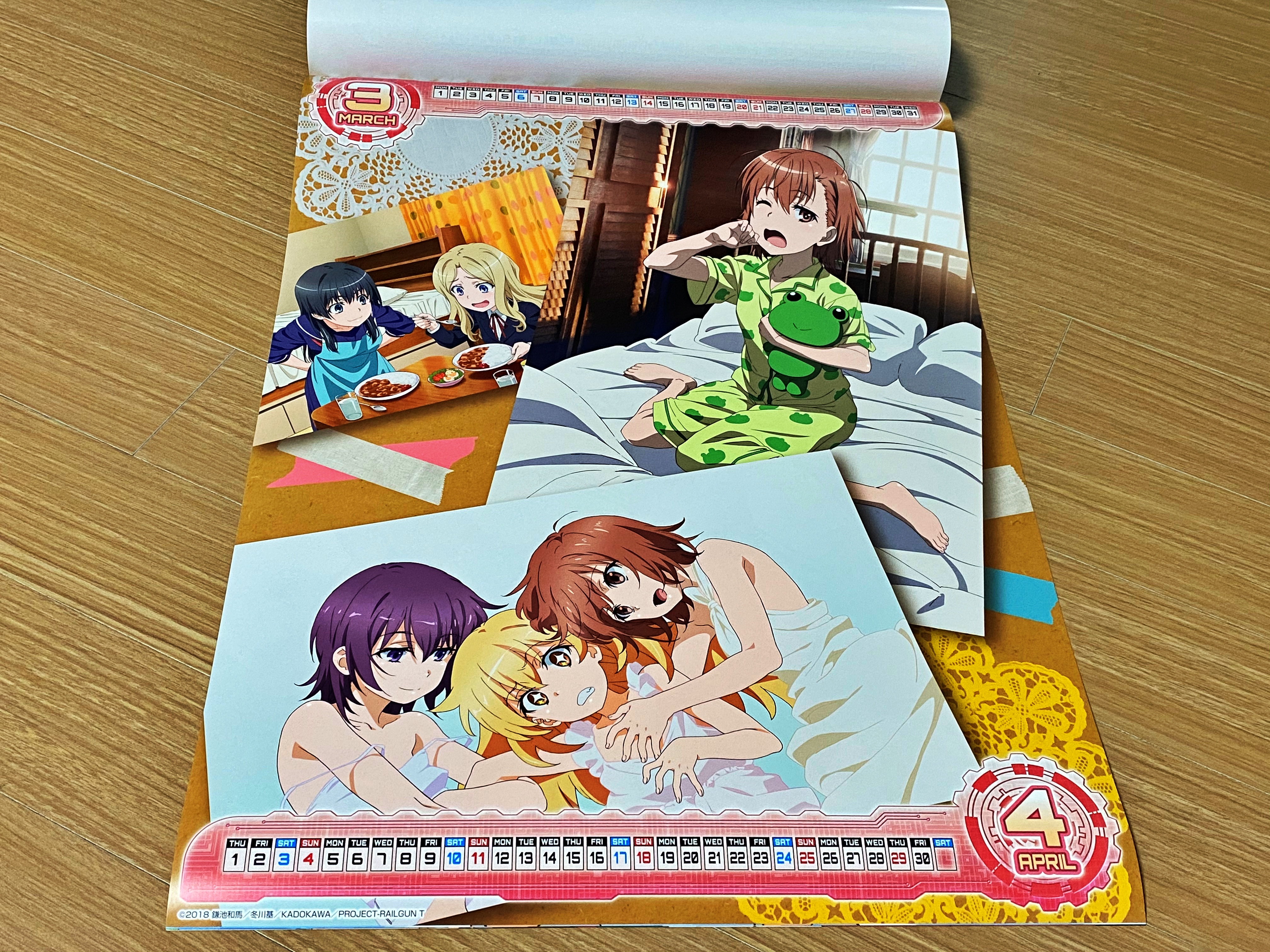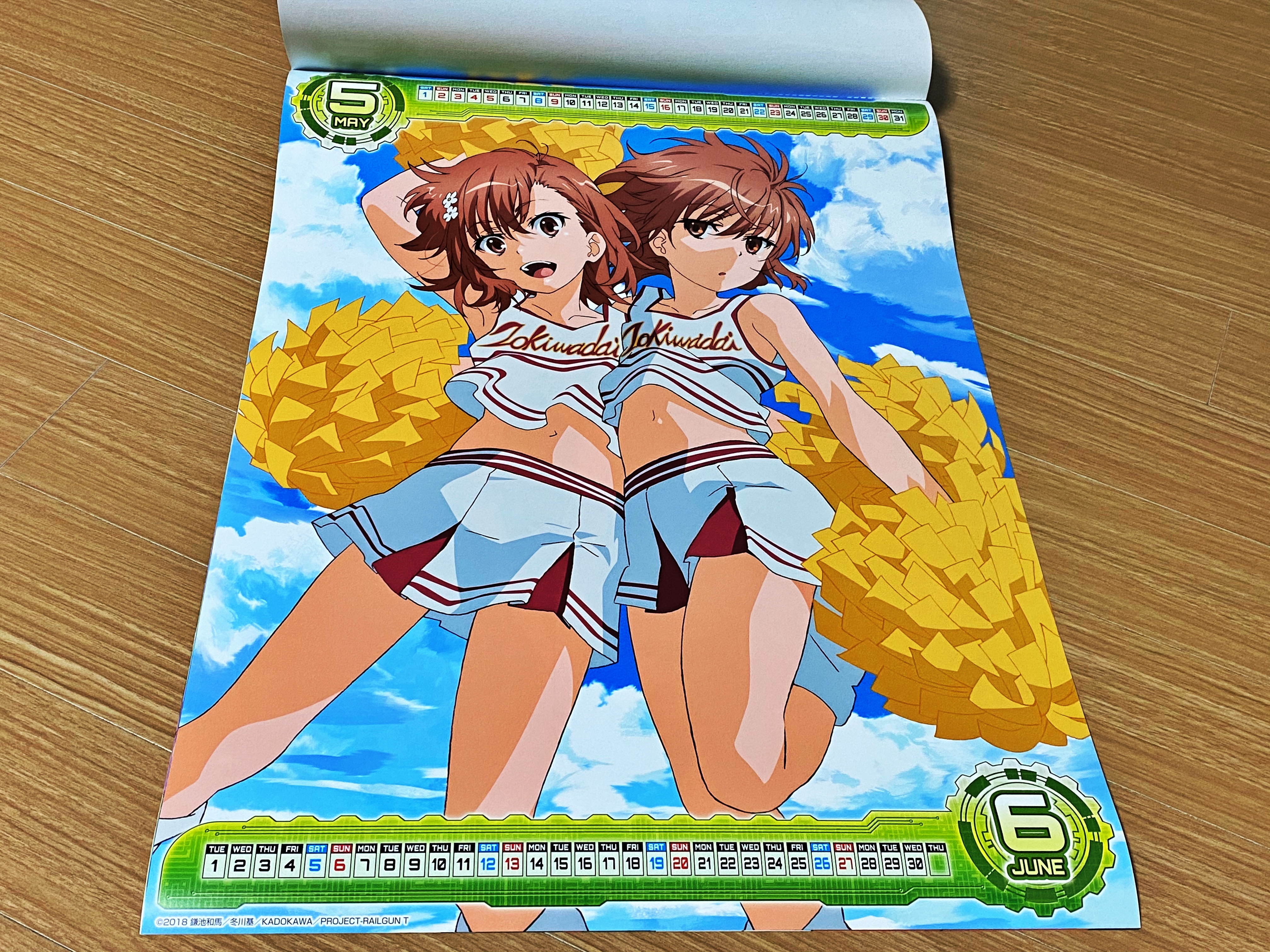 달력은 표지를 포함하여 일곱장으로 구성되어 있었습니다. 한 장에 두 달씩 표기되어 있네요. 날짜는 위아래로 작게 표시되어 있고 사실상 일러스트가 메인입니다. 마치 지난해부터는 불편러들에 의해 사라진 맥주회사 광고 달력과 비슷한 구성입니다. 쿠로코는 여러분도 자주 보셔서 아실테고, 우이하루나 사텐 역시 간간히 블로그에서 소개를 하다 보니 익숙하시리라 생각됩니다. 초전자포 3기가 대패성제를 다뤘기에 경기에 출전하는 사텐과 미코토를 응원하는 모습으로 보이네요.
