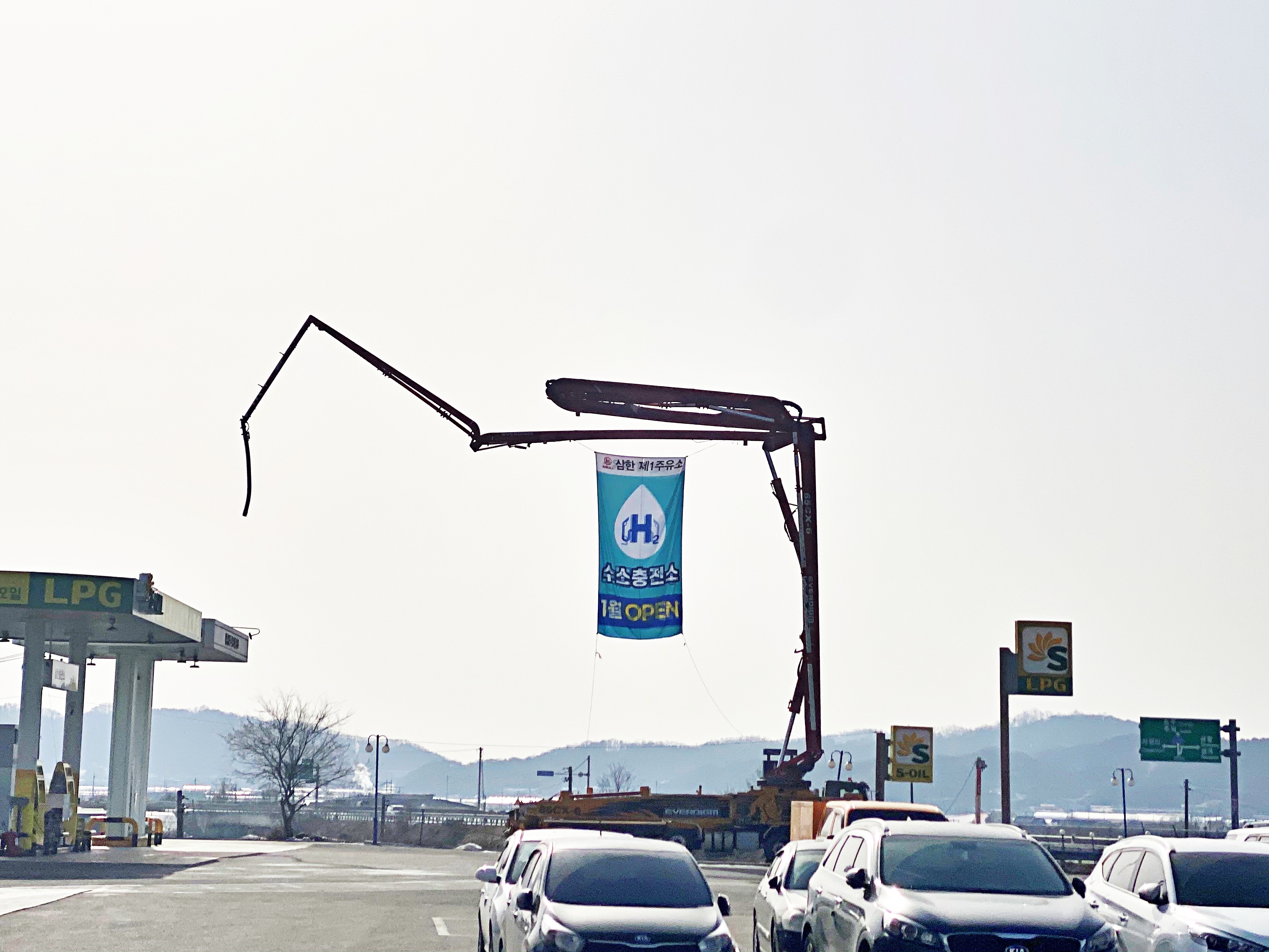 접혀있는 붐대를 더 펼쳐 올린다면 좀 더 높이 올릴 수 있겠지만, 저 높이에만 현수막을 걸어두어도 멀리서부터 수소충전소의 개업을 알리는 현수막의 식별이 가능했습니다. 보통은 애드벌룬을 띄우거나 액정이 달린 트럭을 대여하여 활용합니다만, 펌프카에 현수막을 걸은 모습은 처음 봤던지라 참신하게 느껴지더군요.