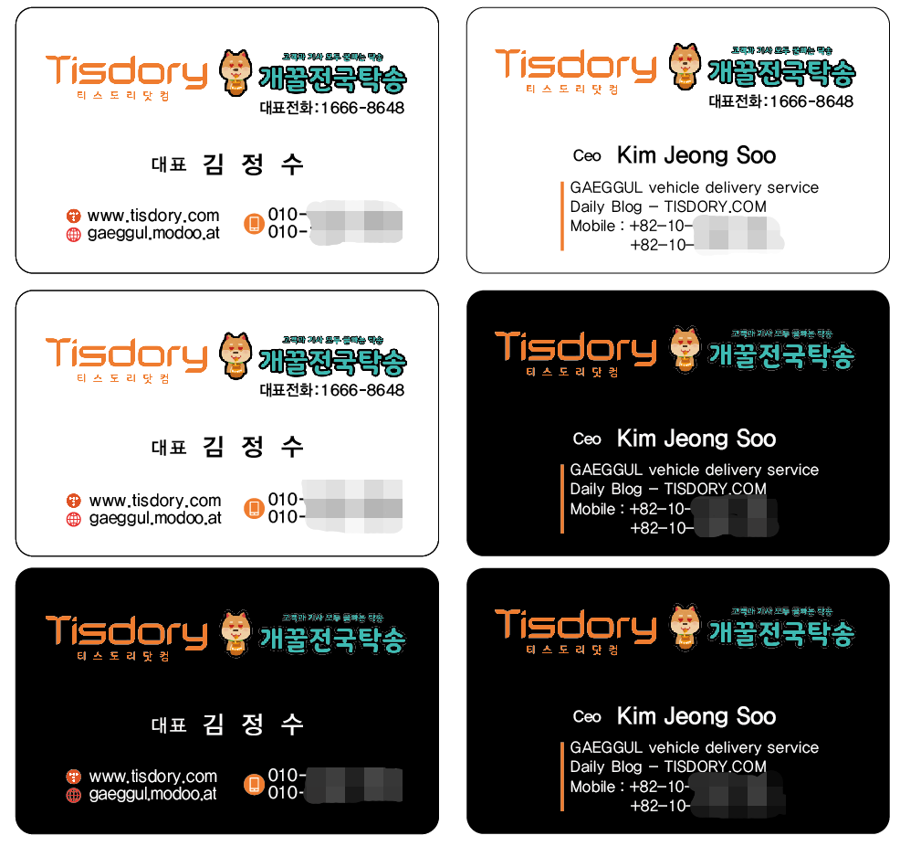 새로 제작한 개꿀탁송 로고와 함께 기존에 사용중인 티스도리닷컴 로고를 넣기로 합니다. 그렇게 대략적인 가이드라인을 잡아주고 필요한 이미지를 제작업체에 보냈습니다. 이번에는 방송통신대학교 동문이기도 하고 알고지낸지 좀 된 당진애 사장님께 디자인부터 출력까지 모두 의뢰했습니다.