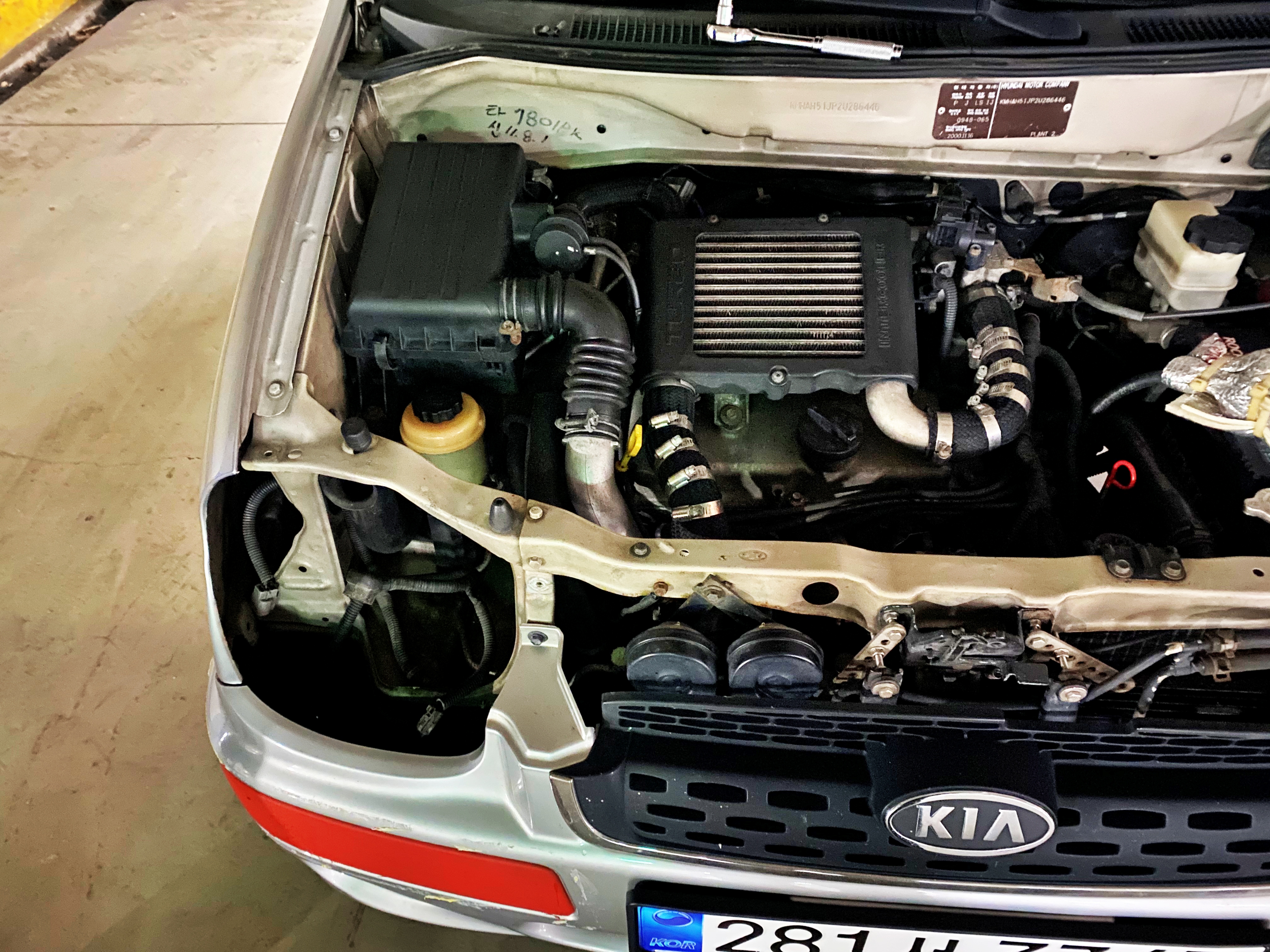 위로는인터쿨러 아래로는 터보차저가 자리잡고 있어 전반적으로 비좁아 보입니다. 에어크리너는 구형 베르나 1.3과 호환됩니다. 노멀 혹은 LPG 비스토는 에어크리너가 인터쿨러 자리에 있지만 비스토 터보의 에어크리너는 좌측 상단에 자리잡고 있습니다.