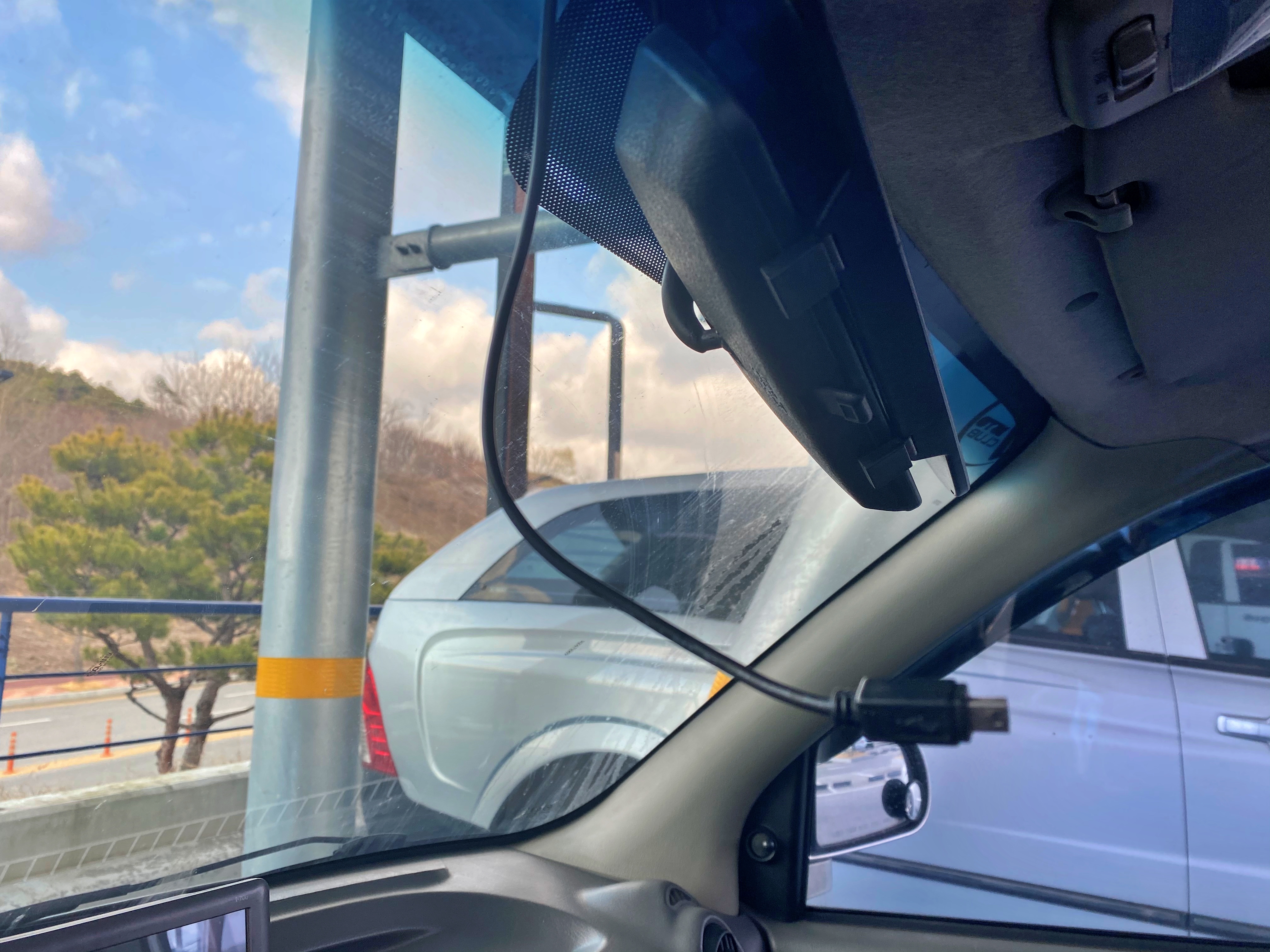 필러트림을 타고 올라와 천장재 사이 틈으로 해서 룸미러 아래로 블랙박스 배선을 빼줍니다.