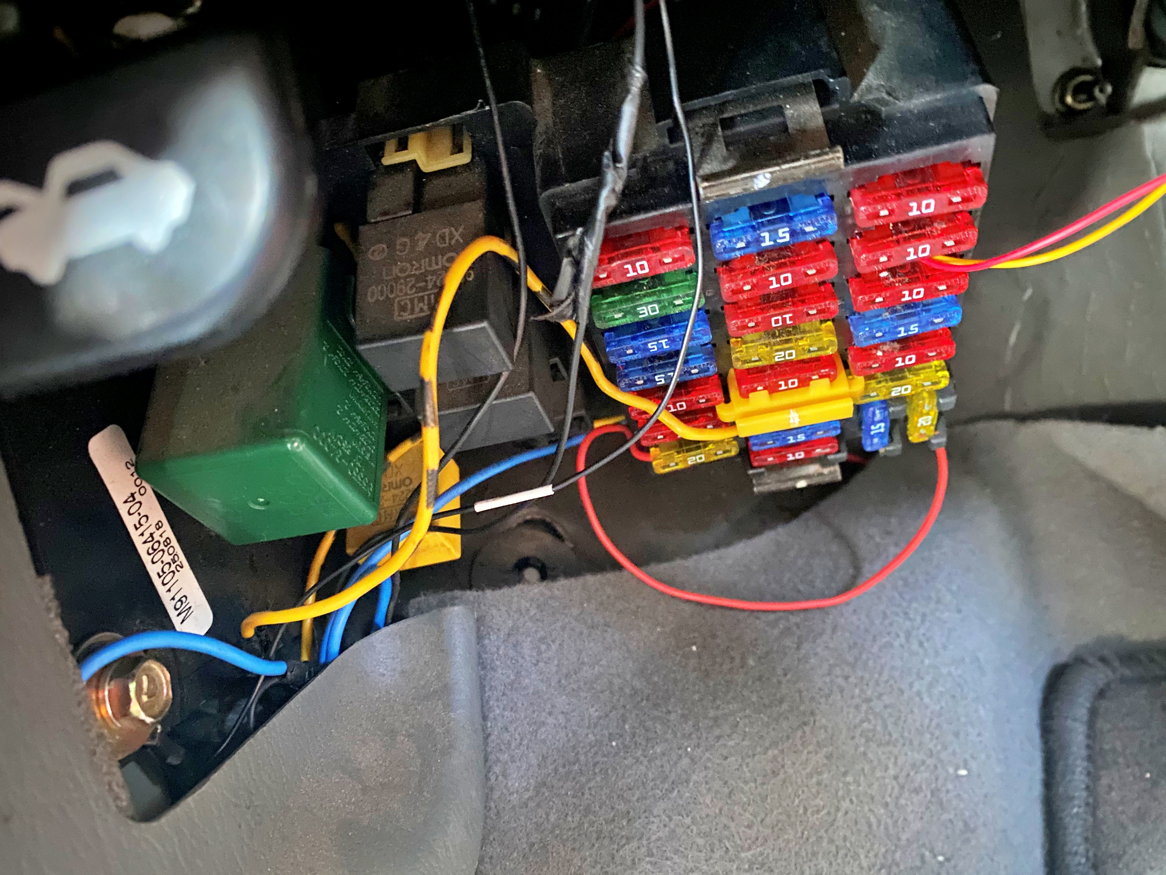 상시로는 사용할 생각이 없습니다. 검은 접지선은 이미 여러 접지용 배선이 물려있는 좌측 볼트를 풀어 물려줬습니다. 키를 돌려 차량의 전기장치를 작동시켜봅니다. 블랙박스도 전원이 들어오네요. 키를 다시 OFF로 돌리니 전원이 꺼집니다. 성공입니다.