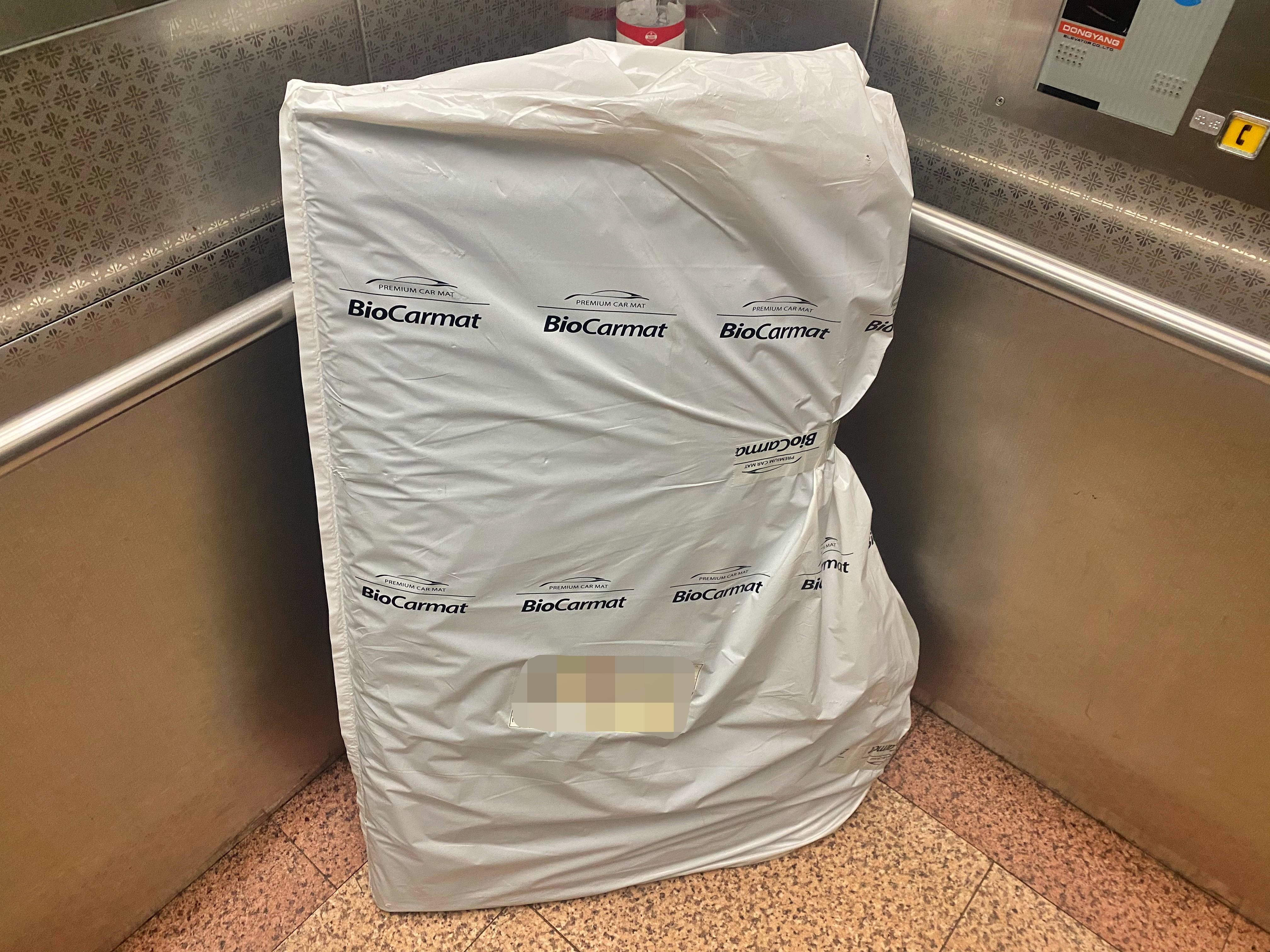 생각보다 얇고 가벼운 소재로 반이 접힌 상태로 도착했습니다. 배송을 위해 올라왔다가 장착을 위해 다시 엘리베이터를 타고 내려가고 있는 애매한 상황이네요.