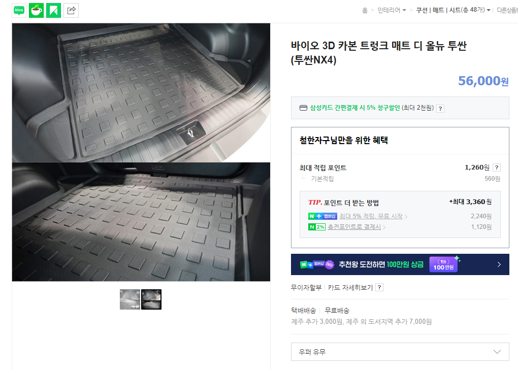 디 올 뉴 투싼(NX4)용 트렁크 매트라는 설명과 함께 5만 6천원이라는 가격에 판매 중입니다.