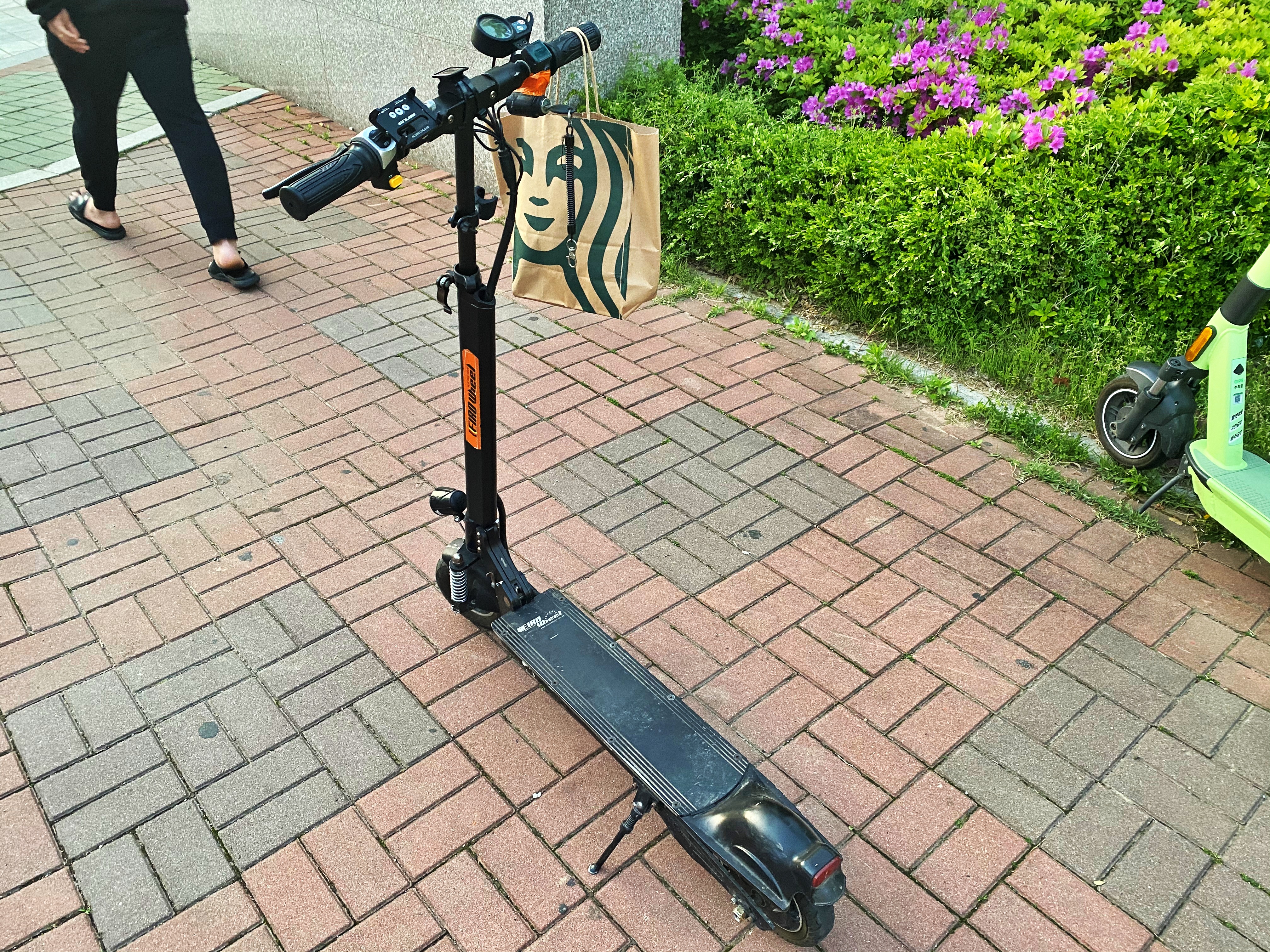 그렇게 주말과 비가 내리던 월요일은 충전기에서 분리해둔 뒤 세워뒀고, 화요일인 오늘 별 생각없이 가지고 나왔더니 킥보드 전원이 안들어오네요. 배터리 전압이 바닥이 났다고 한들 라이트를 켜놓고 살살 굴리면 자력으로 발전하여 불이 들어오곤 합니다만 그렇지도 않습니다.