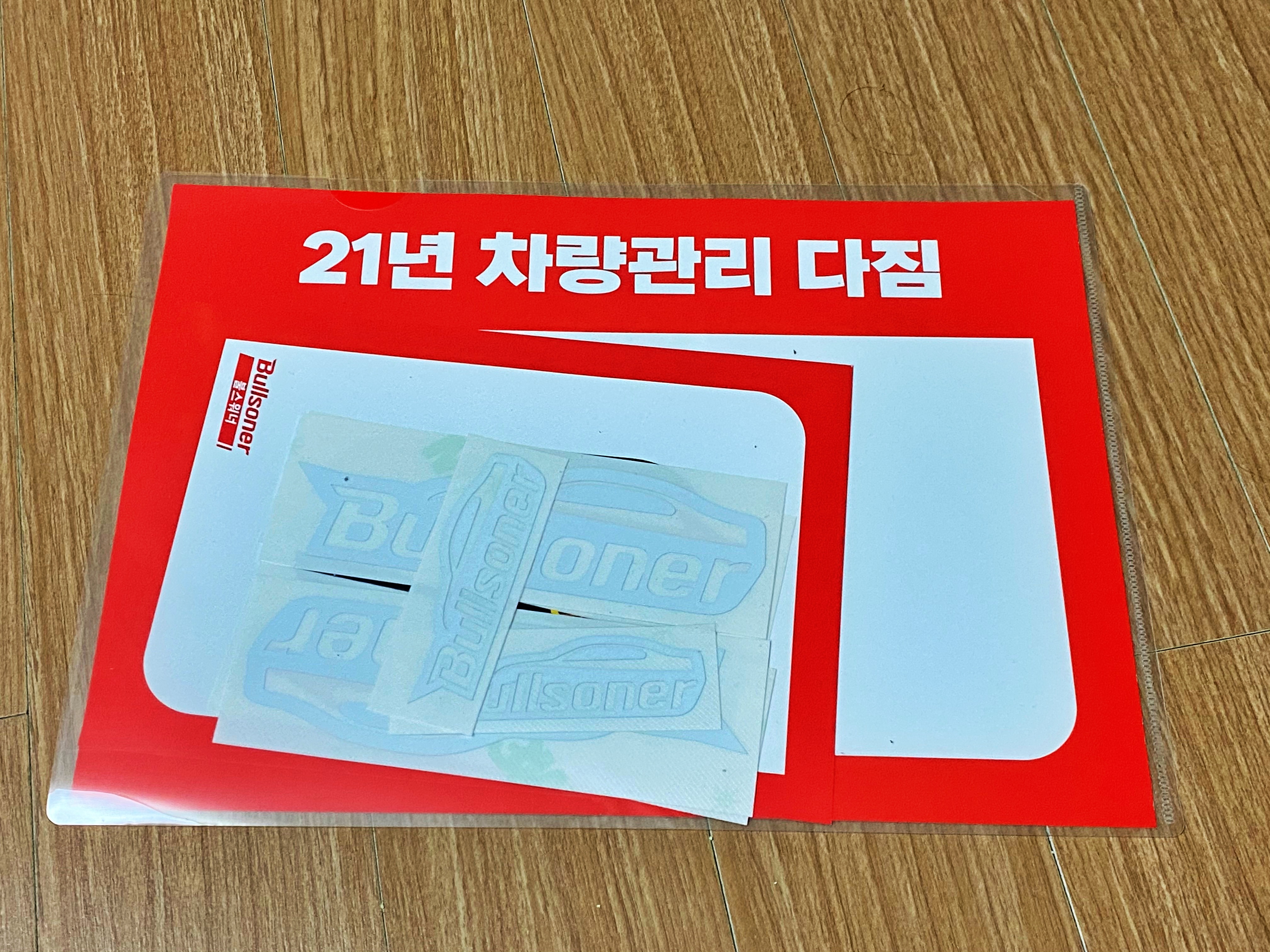 2021년 차량관리 다짐을 적는 용지와, O X 표시가 된 카드가 들어있습니다. 발대식에 사용될 예정이고 불스워너 스티커도 크기별로 두장씩 보내주셨네요. 불스워너 스티커의 부착은 자유라고 합니다만, 세차를 싹 한 다음 붙여주기로 합시다.