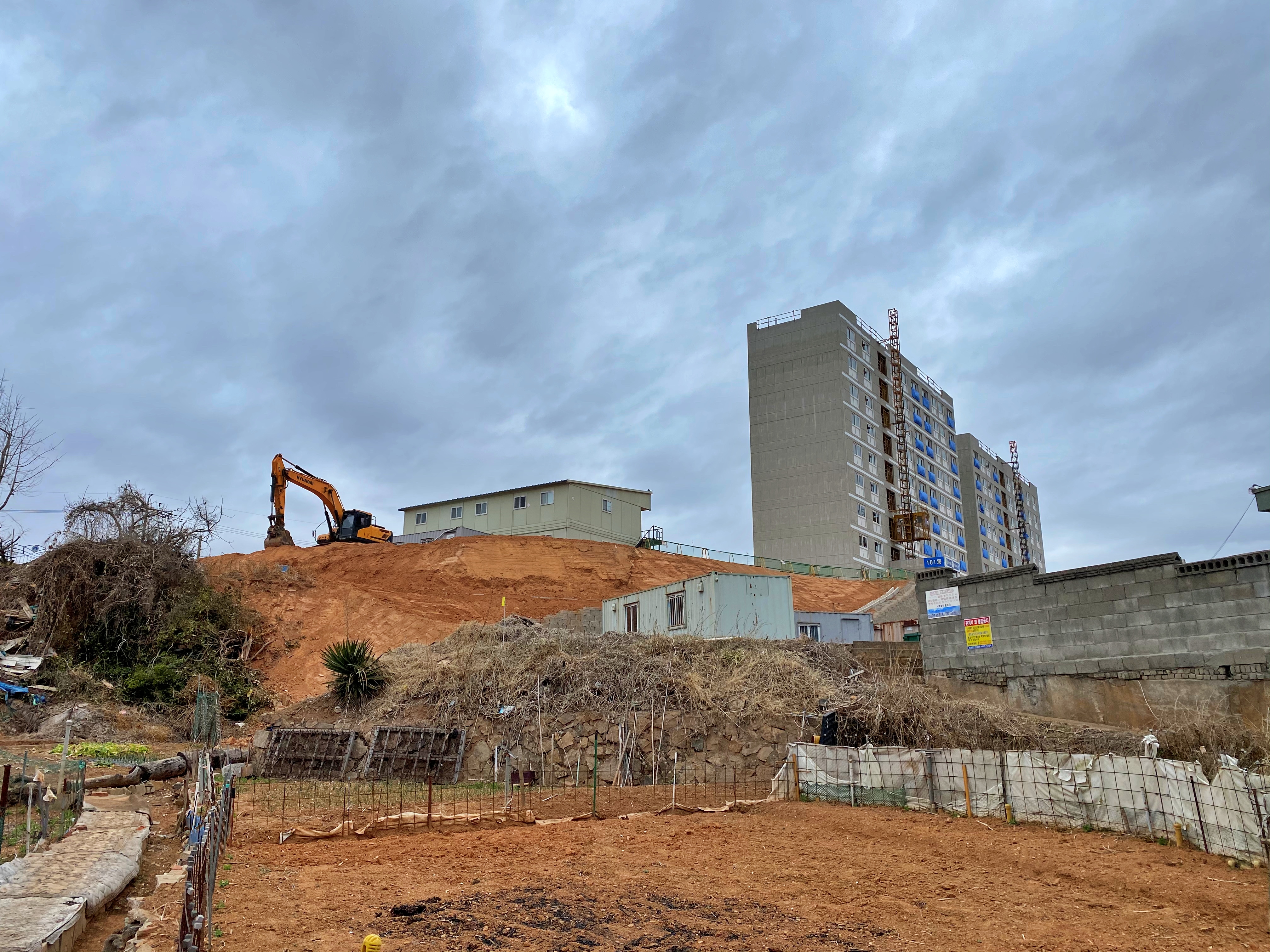 밭을 통해 언덕을 타고 아파트 현장 방향으로 올라갑니다.