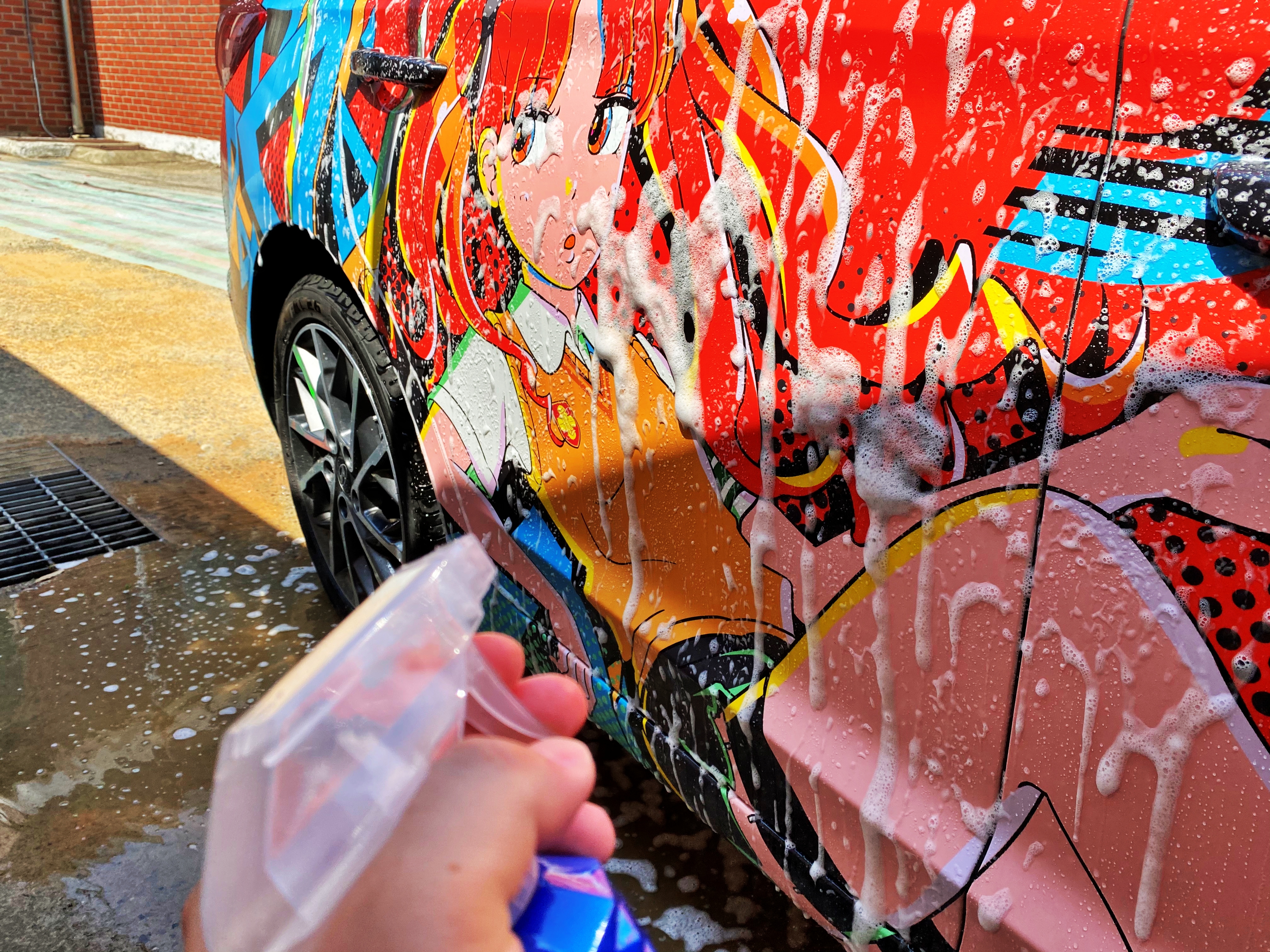 다만 항상 폼을 넉넉하게 뿌리고 미트질을 하는지라 혹시 거품이 부족해서 흠집이 생기지 않을까 하는 우려에서 뿌리는 카샴푸를 넉넉하게 뿌렸습니다. 물론 미트와 차체에 모래 알갱이 같은 이물질이 없다면 큰 우려는 하지 않아도 됩니다만, 아니 무엇보다도 제 차는 실사 풀랩핑차라 흠집 따위에 딱히 연연하지 않아도 됩니다만 그래도 항시 세차를 할 때마다 챙기고 있습니다.