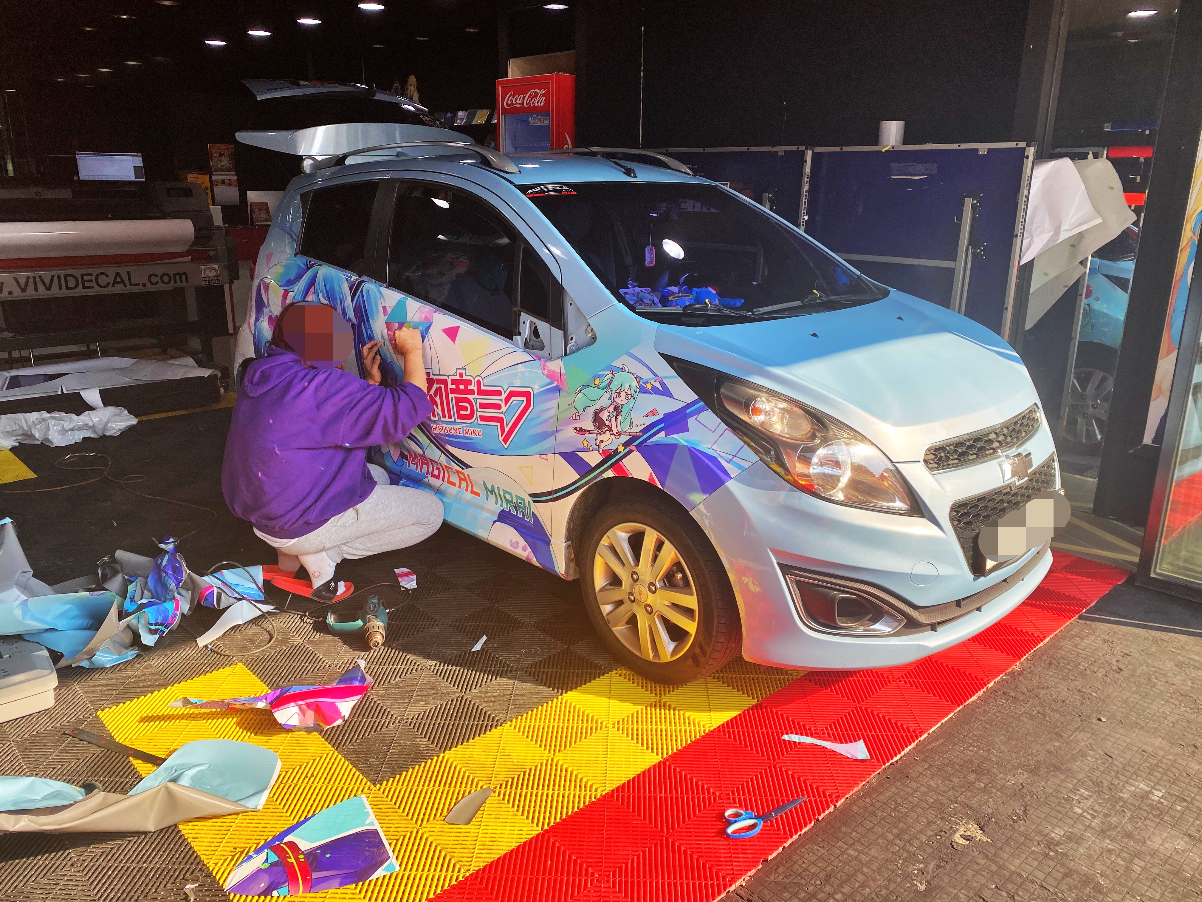 이전에는 말 그대로 데칼처럼 부분적으로 캐릭터만 잘라 붙이는 형태로 부착했다면, 최근 작업되는 차량들은 거의 풀랩핑에 가깝게 붙이는 방식이 대세처럼 자리 잡았습니다. 본넷과 측면을 사실상 다 덮어버리는 형태인데, 그런 경우 차체 색상과 이질감이 생겨버리곤 합니다. 그래도 보색을 잘 맞춰주면 그럭저럭 어울리지만, 그렇지 않은 경우 붕 뜬 느낌이 상당하지요.
