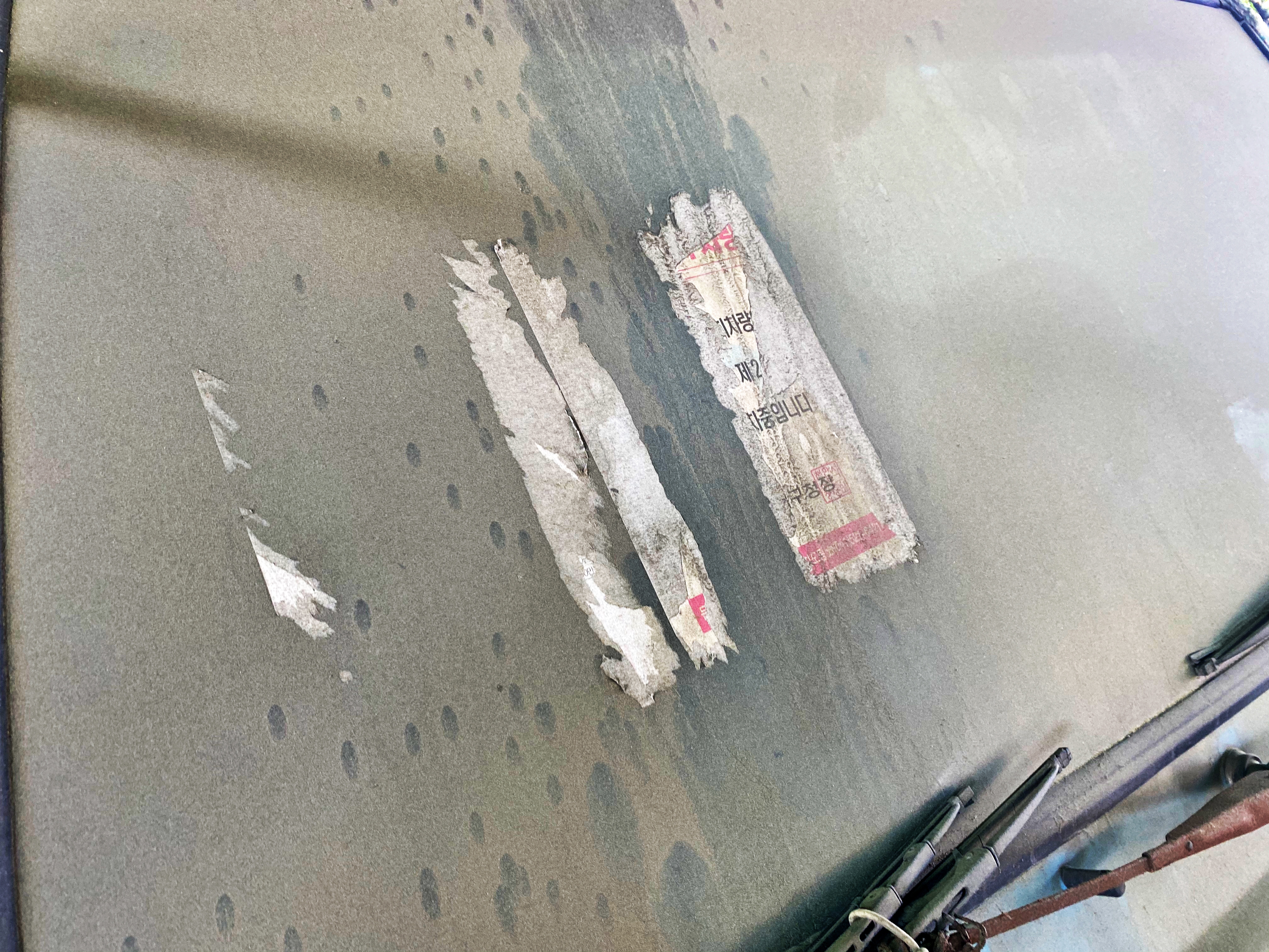 와이퍼에는 폐차장 영업사원이 꼽아두고 간 전단지가 붙어있고, 유리창에는 구청에서 붙여두었던 공고문이 절반 이상 찢어진 상태로 붙어있습니다. 봄에 황사도 불고 도로 주변이라 먼지도 많긴 합니다만, 먼지가 겹겹이 쌓여있는 모습을 보니 오랜시간 방치되었음을 알 수 있습니다.