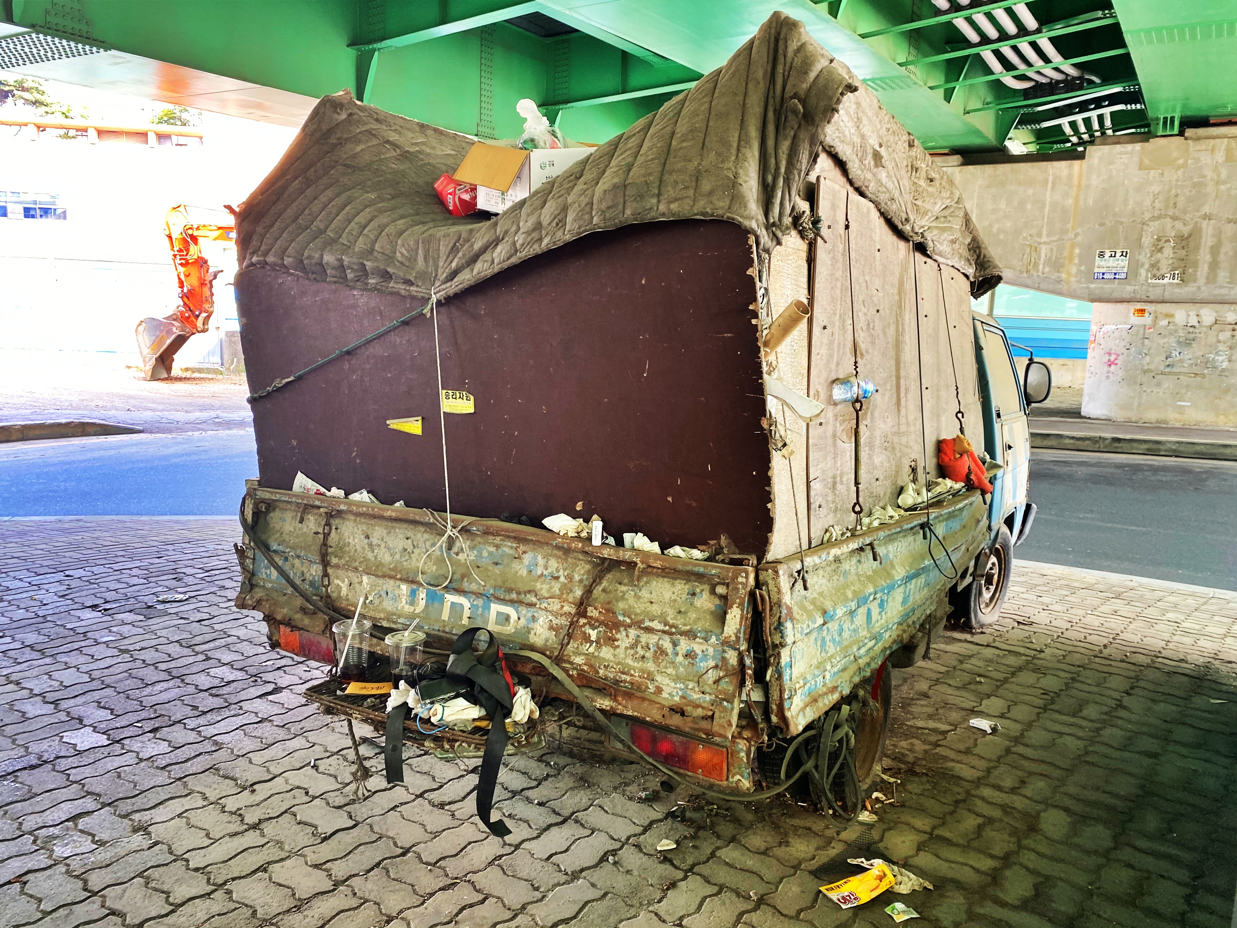 합판으로 벽을 만들고 그 안에 무언가를 적재하고 낡은 이불로 덮어두었습니다만, 그 위로도 누군가가 쓰레기를 올려두고 갔습니다. 뒷 번호판 주위로도 쓰레기거 버려져 있고, 주변으로도 지나가는 사람들이 버린 쓰레기로 가득합니다. 도시미관상 영 좋지 않은지라 시급한 처리가 필요해보입니다.