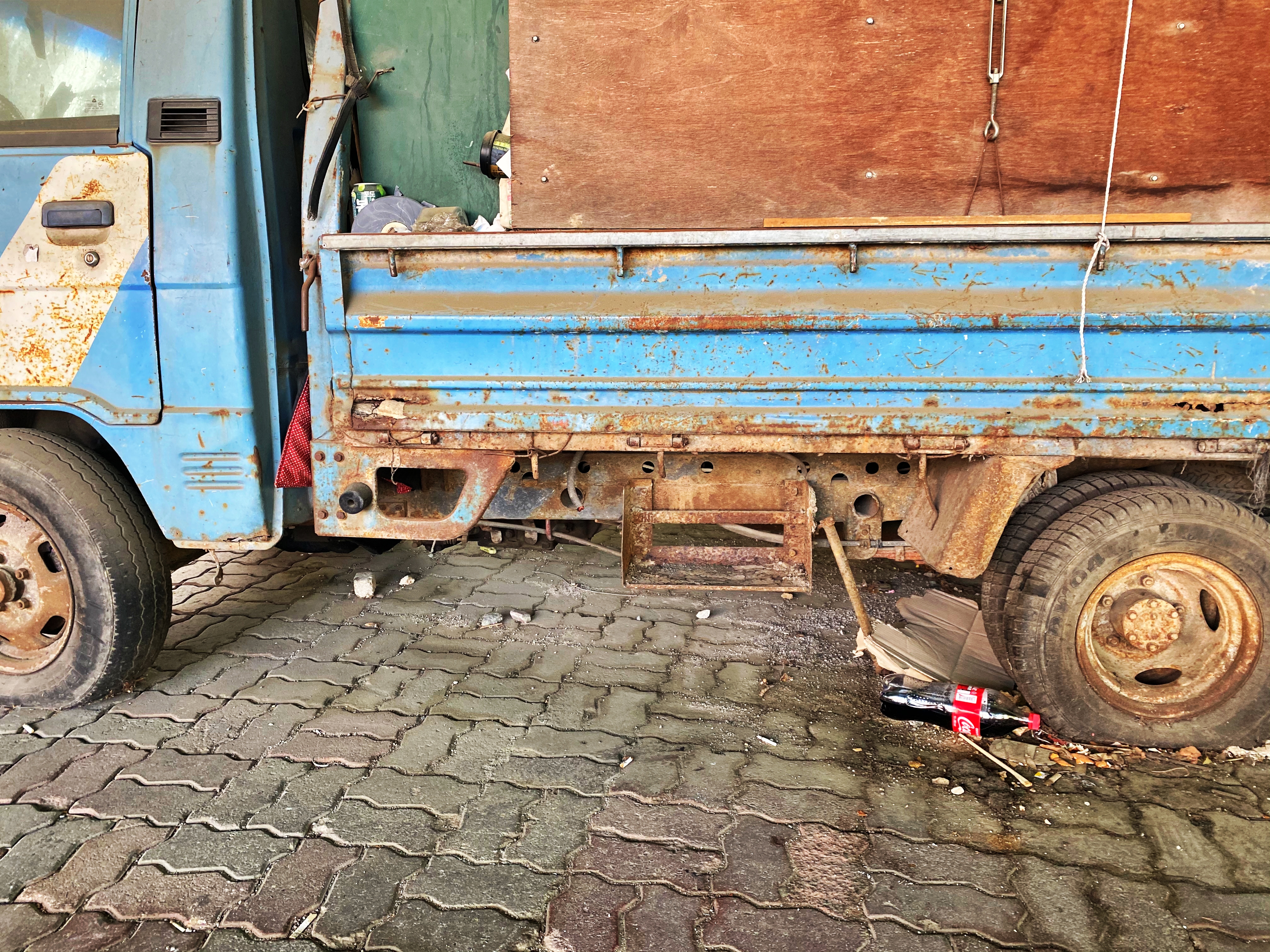 상대적으로 깔끔한 우측 사이드미러의 거울은 뉴포터용으로 보입니다. 지금은 그저 주변으로 쓰레기가 쌓여있고 먼지를 뒤집어 쓴 오래된 트럭이지만, 비교적 근래까지 차량을 고쳐가며 운행했다는 이야기로 보입니다.