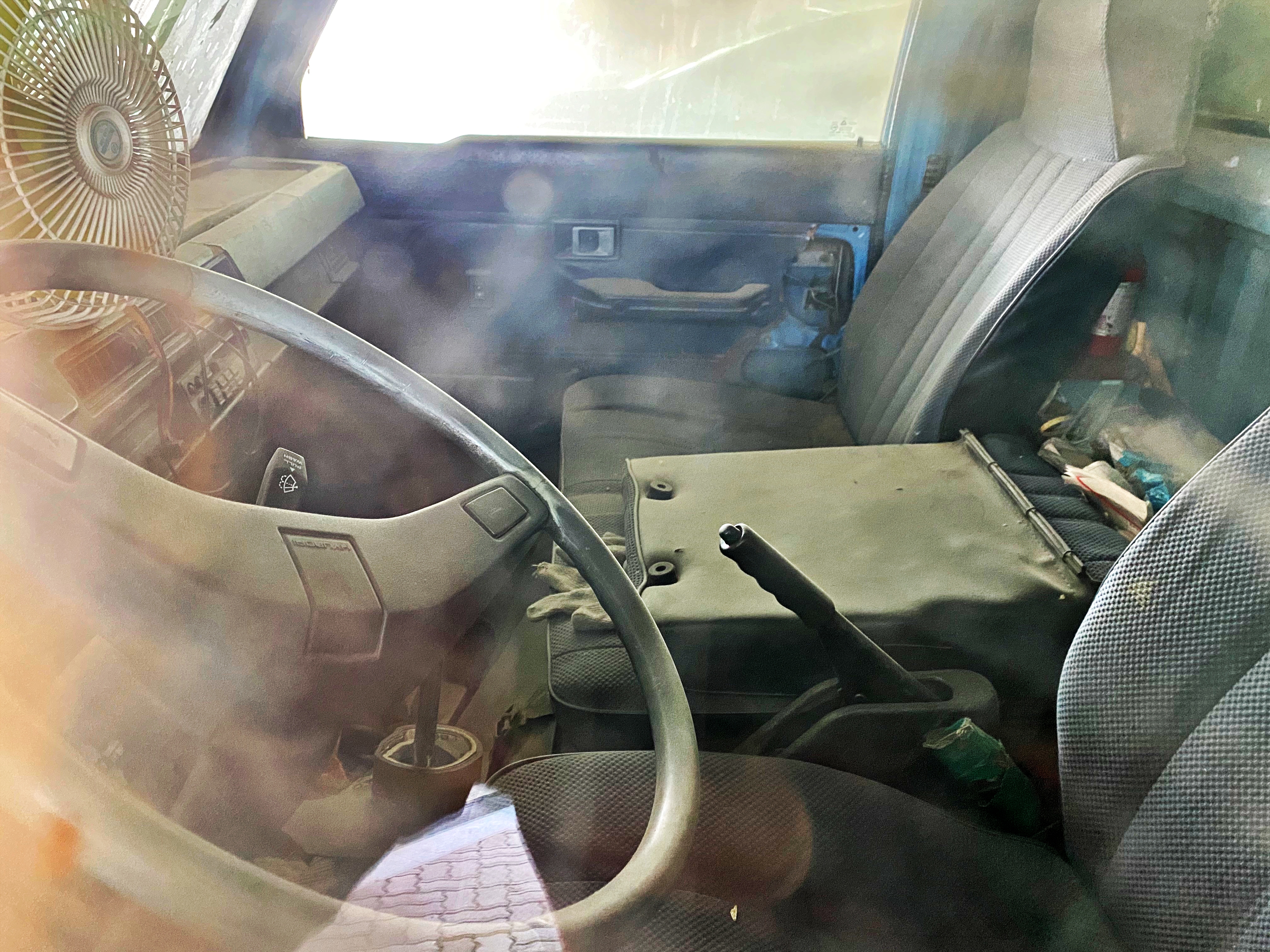 도어트림이 일부 뜯겨나간 부분을 제외하면 그럭저럭 잘 보존되어 있습니다. 90년대 스타일의 차량용 선풍기도 보이고요. 년식변경 이전 모델은 핸들 뒤에 기어봉이 있는 칼럼 쉬프트 타입의 기어가 적용되었지만, 90년형부터 일반적인 형태인 플로어 쉬프트 타입의 기어가 적용되었습니다.