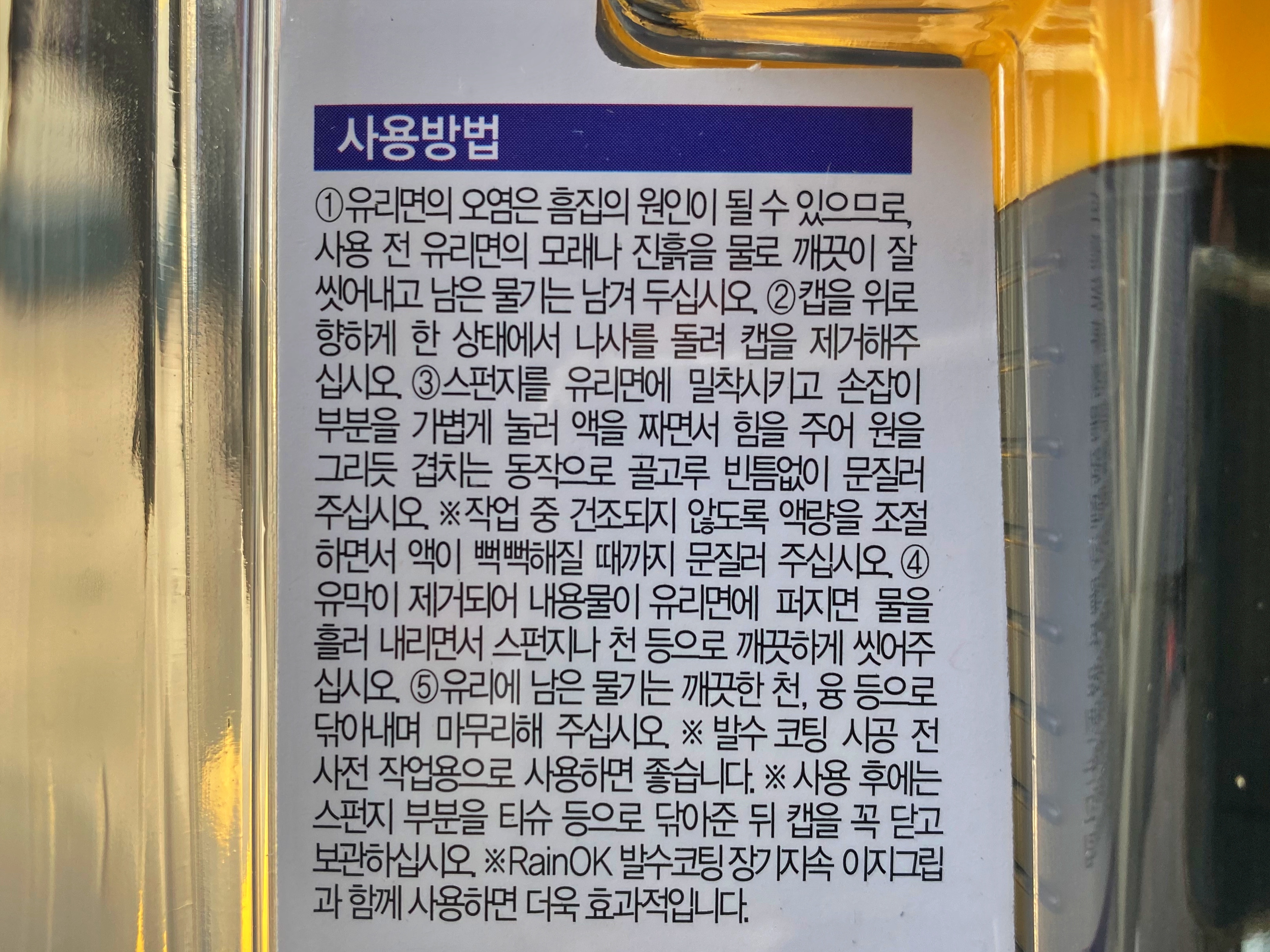 복잡하지만 숙지했습니다. 물부터 뿌려서 이물질을 제거하고 캡을 제거한 뒤 용액을 짜며 유리면에 밀착시키고 문질러서 시공하면 된다고 합니다. 꼼꼼히 원을 그리며 유리창을 유막제거제로 가득 채우면 된다는 얘기네요. 사용법을 정독했으니 이제 본격적인 시공에 들어가기로 합니다.