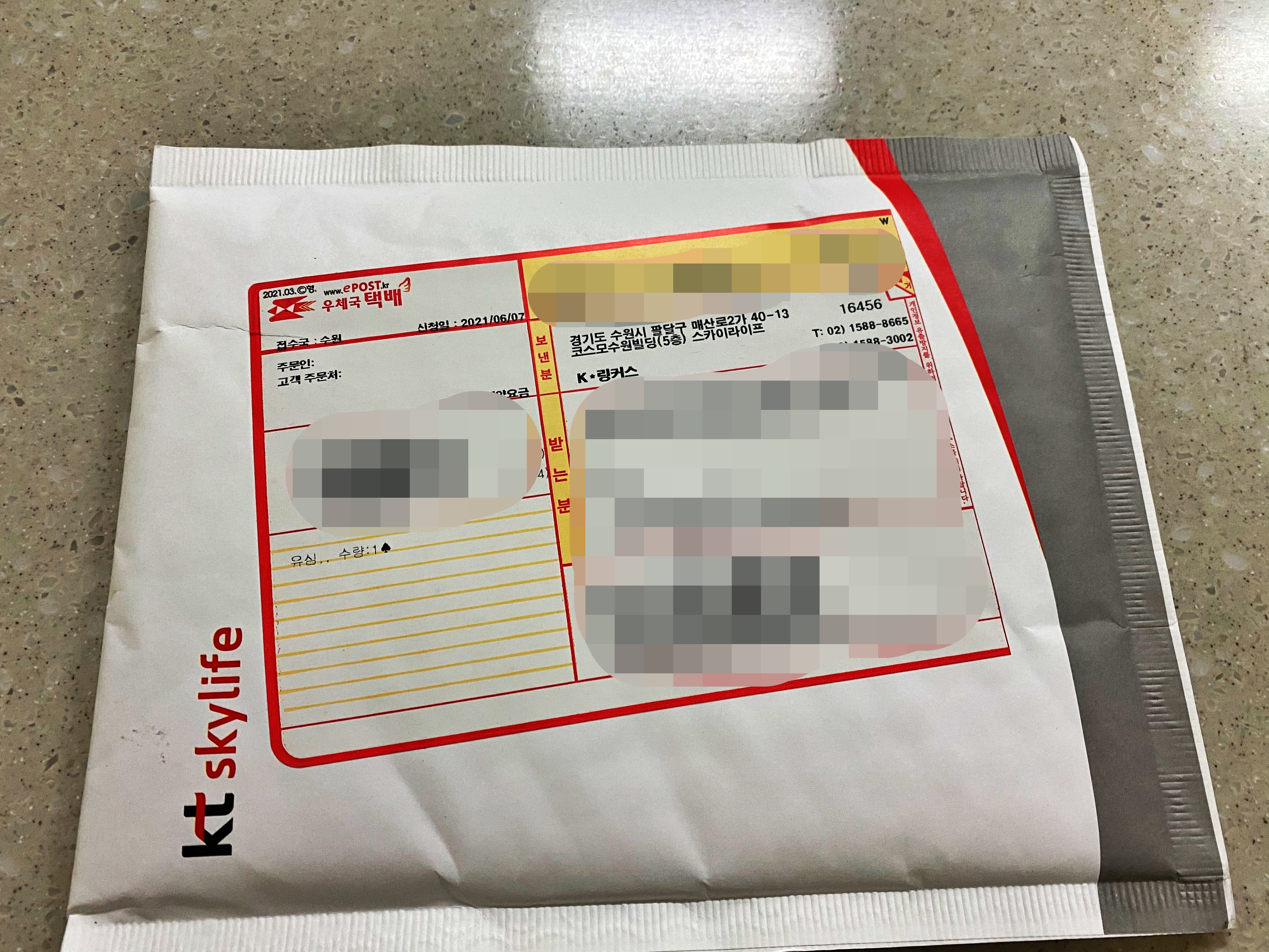 KT스카이라이프 로고가 선명한 봉투에 담겨 왔습니다. 다만 발신자 이름은 KT링커스네요. KT링커스는 KT의 공중전화를 관리하는 자회사입니다만, 계열사의 상품을 배송하는 하청업무까지 진행하고 있다고 합니다. 사실상 계열사의 모든 물류 업무를 담당하며, 요즘은 전기차 충전기 유지보수 사업에도 손을 댄 듯 합니다. 비롯하여 생각 이상으로 많은 업무를 처리하고 있더군요.