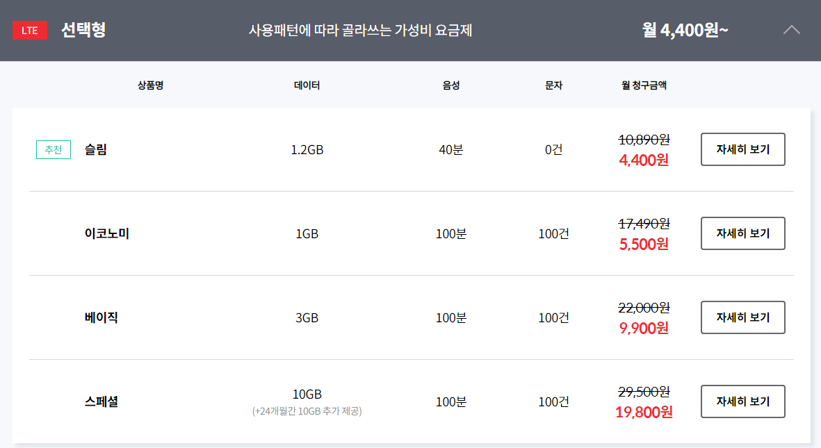 스카이라이프 알뜰폰의 스페셜 요금제로 개통했습니다.