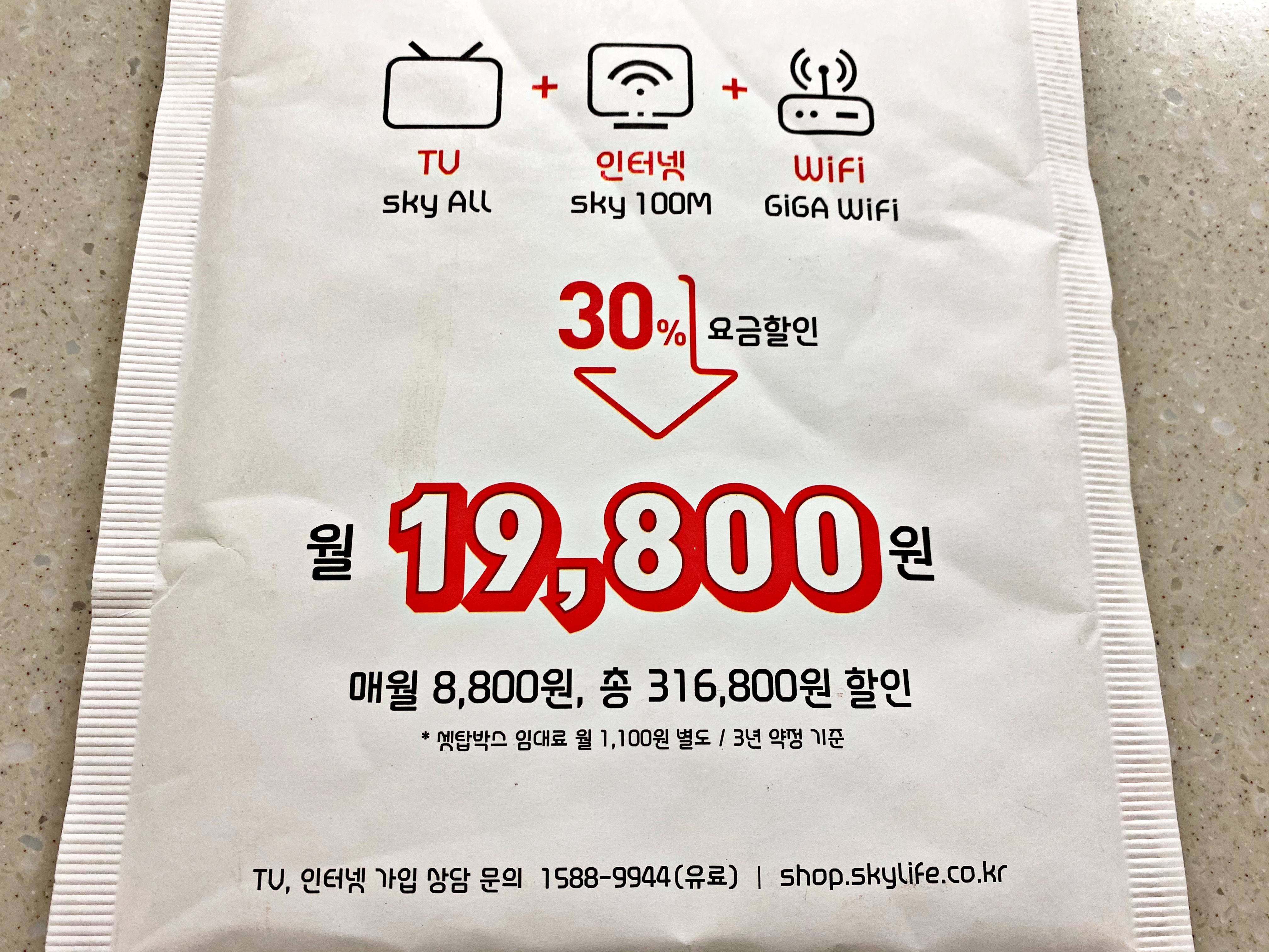 TV+인터넷+와이파이 다 해서 19,800원. 이미 가입했습니다만 일부 지역에서만 설치가 가능한 몇몇 케이블방송국의 상품이 아닌 전국단위로 가입이 가능한 상품 중 가장 저렴합니다. 역시 극한의 가성비만 따지는 도태거지인 저도 내내 사은품과 요금을 따져도 가장 저렴했기에 스카이라이프 TV와 인터넷을 선택했습니다.