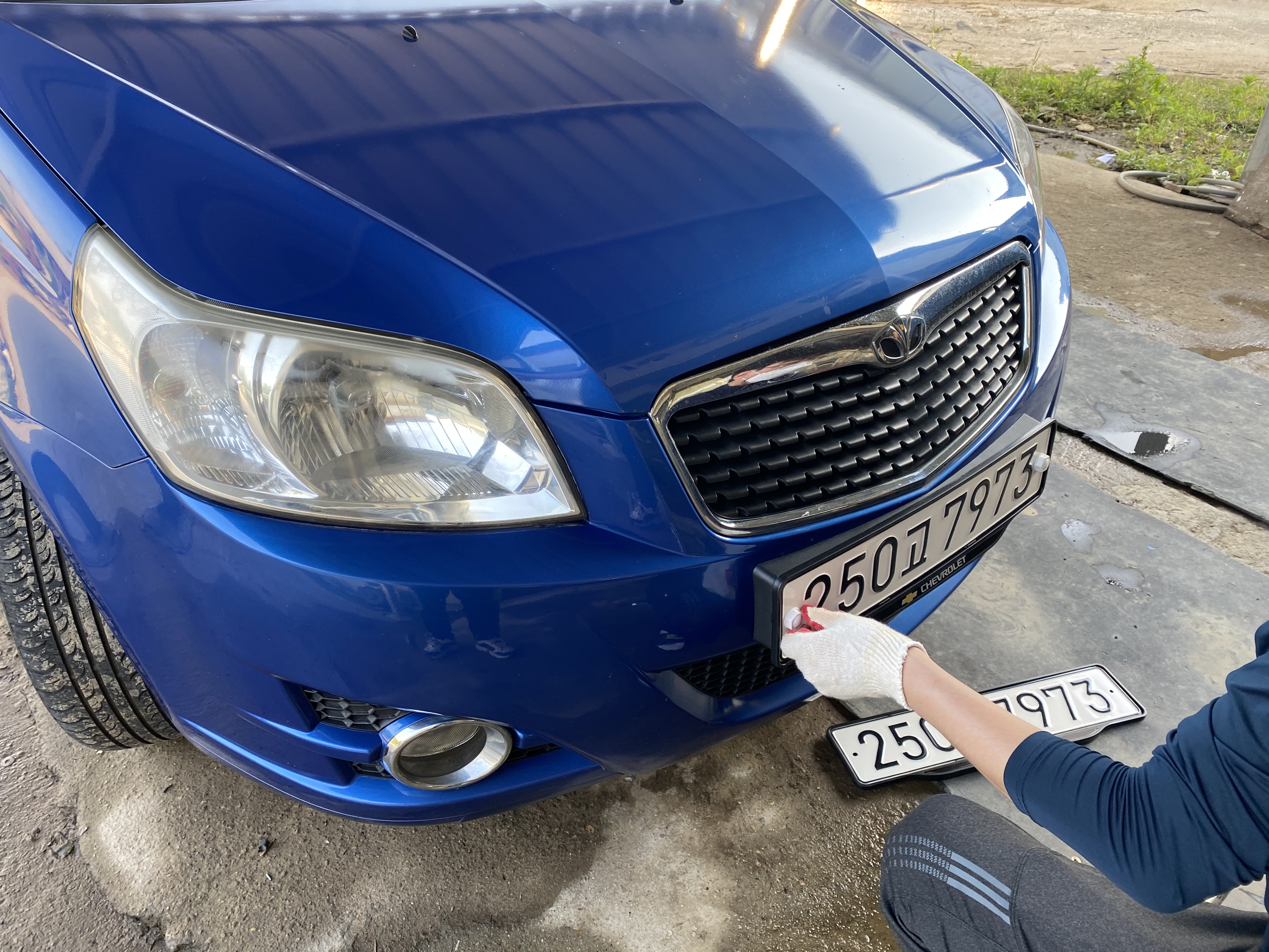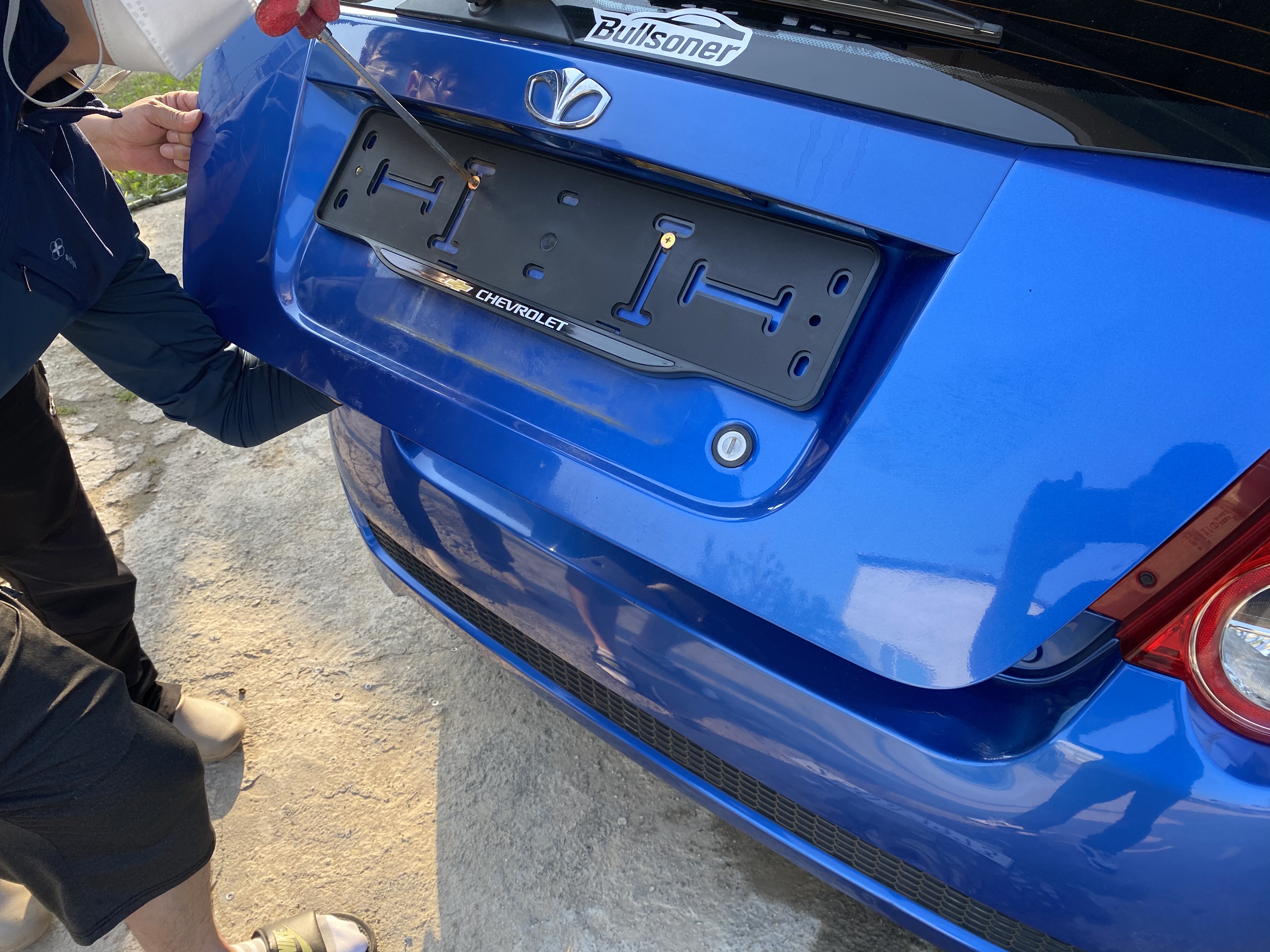 앞은 뭐 쉽습니다. 파란색 전기차용 플레이트를 달아달라고 했습니다만 한참 찾으시더니 없다고 하시더군요. 그래서 쉐보레 플레이트를 장착하기로 합니다. 제 차는 DAEWOO인데 CHEVROLET 플레이트가 장착되는 상황입니다.