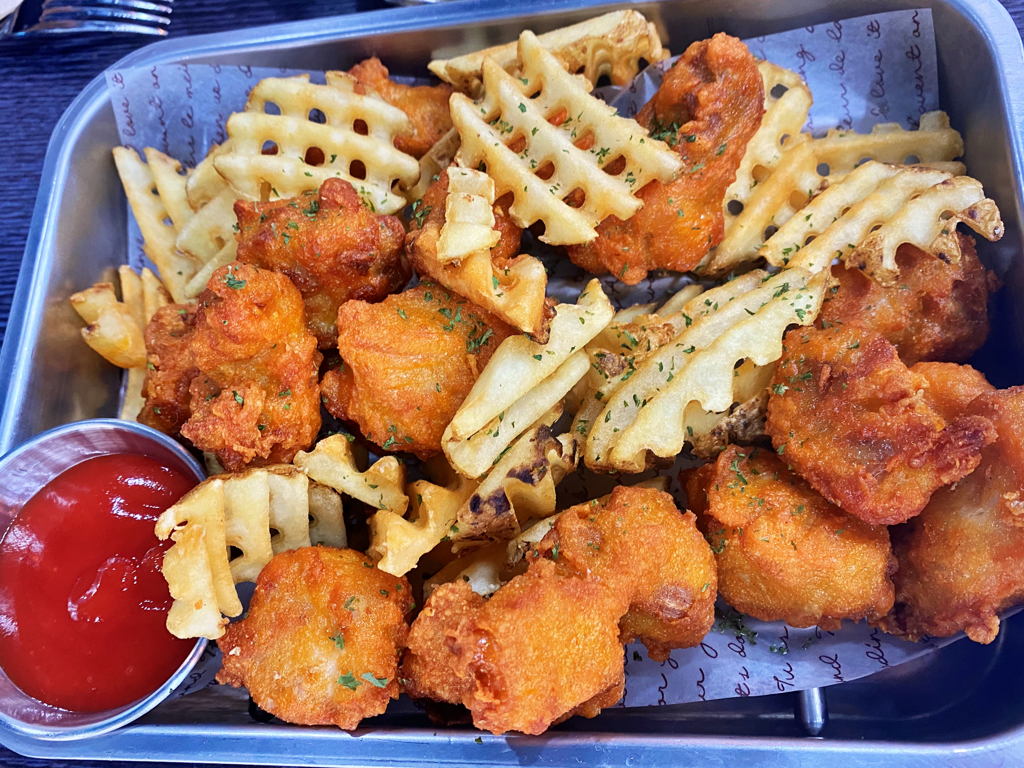 전형적인 술안주. 바삭하게 튀겨진 감자튀김은 평범했습니다. 치킨도 뭐 조금 짭조름했지 평범한 맛이라고 하더군요. 다만 어느정도 크기가 있는 치킨은 빠지지 않았습니다만, 감자튀김은 먹다 보니 아래로 빠져버려 조금 불편하게 느껴졌습니다.