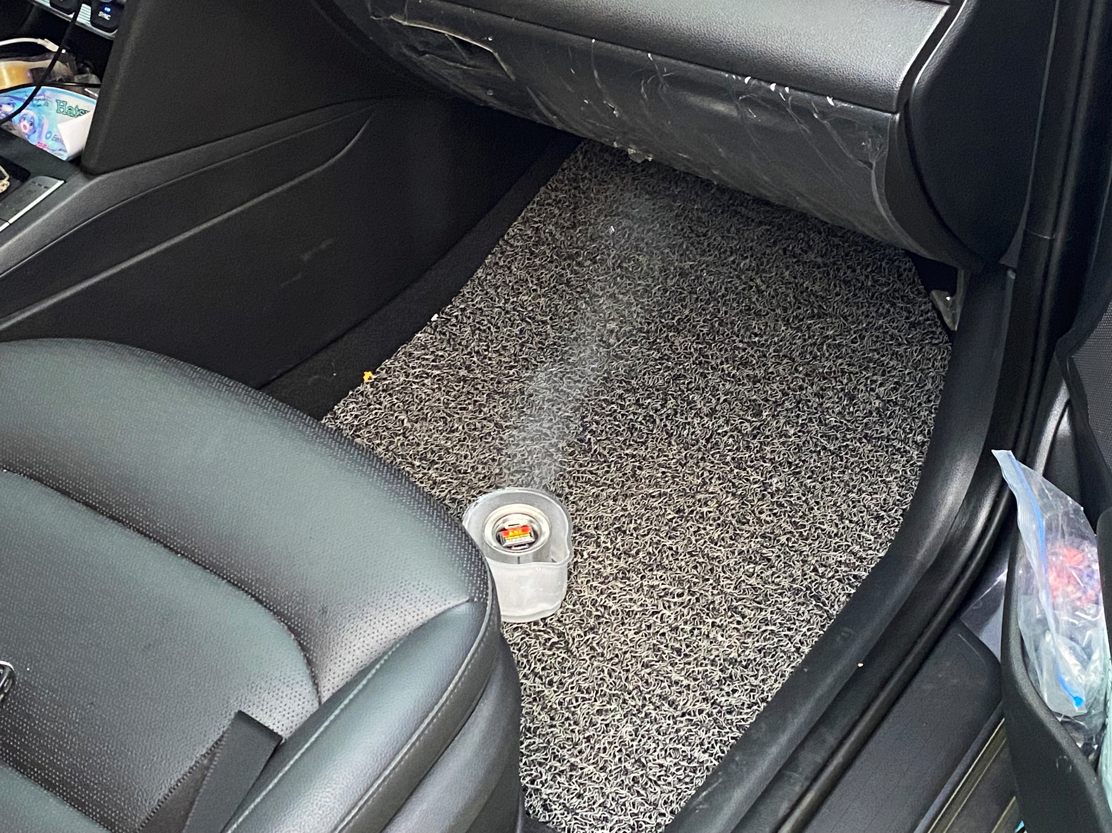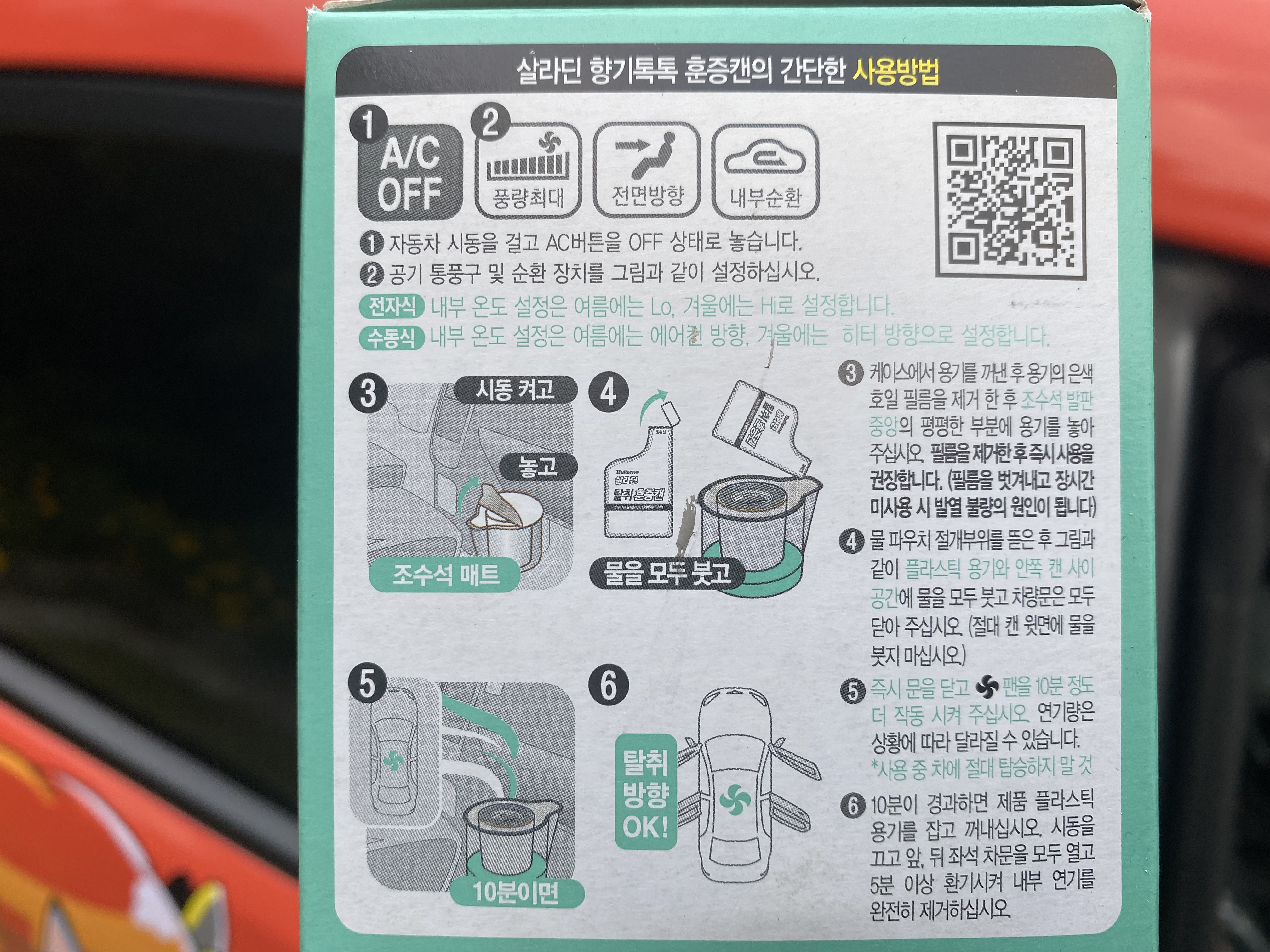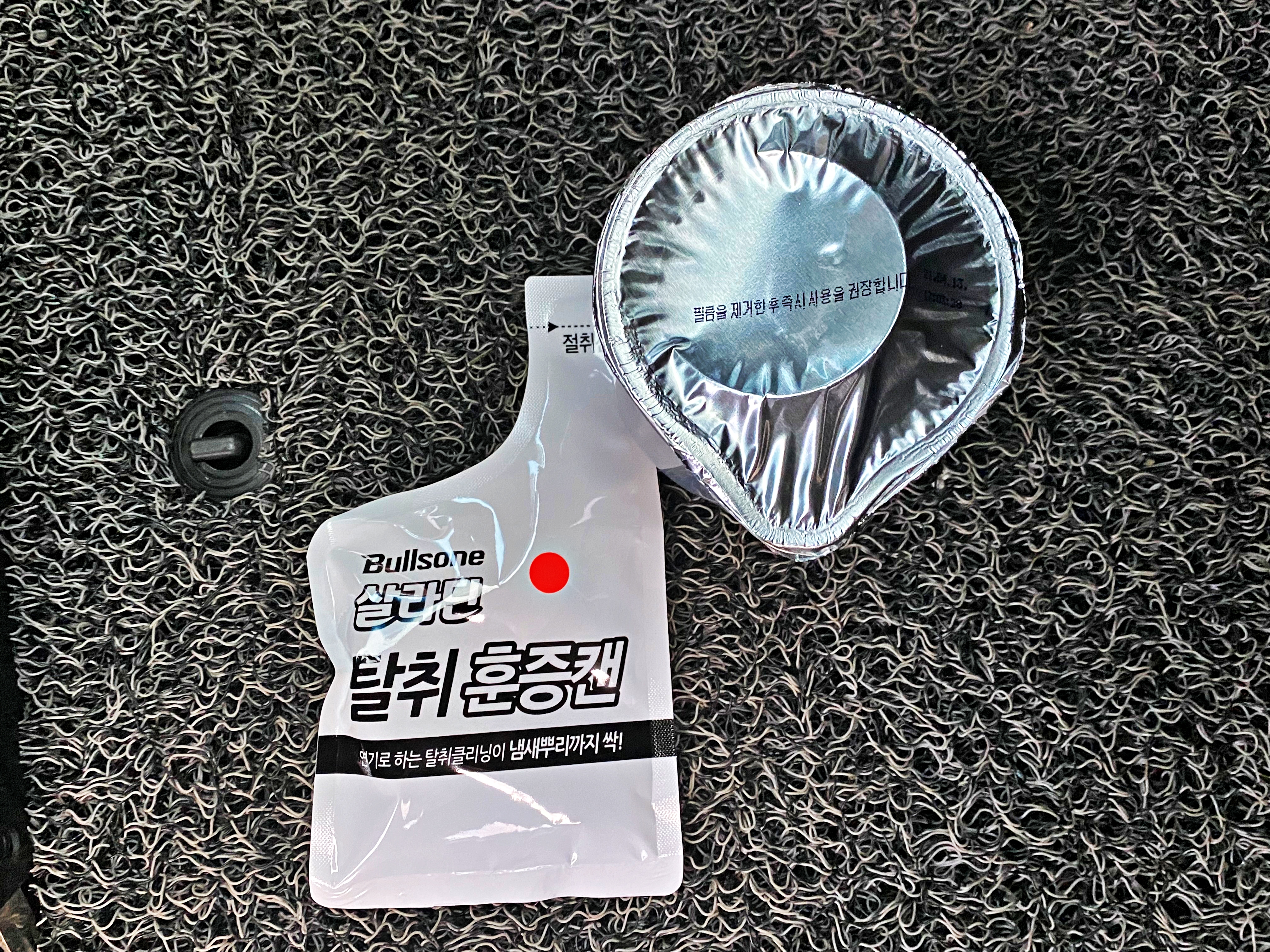 초등학생도 이해가 가능한 수준입니다. 시동을 걸고 에어컨은 전면에 내부순환 송풍으로 둡니다. 이후 조수석 매트 위에 살라딘 본체를 올려놓고 필름을 벗겨낸 뒤 물을 부어주면 연기가 피어오르기 시작합니다. 그 상태로 10분을 놔둔 뒤 연기가 모두 빠져나가도록 환기를 하면 된다고 하네요.