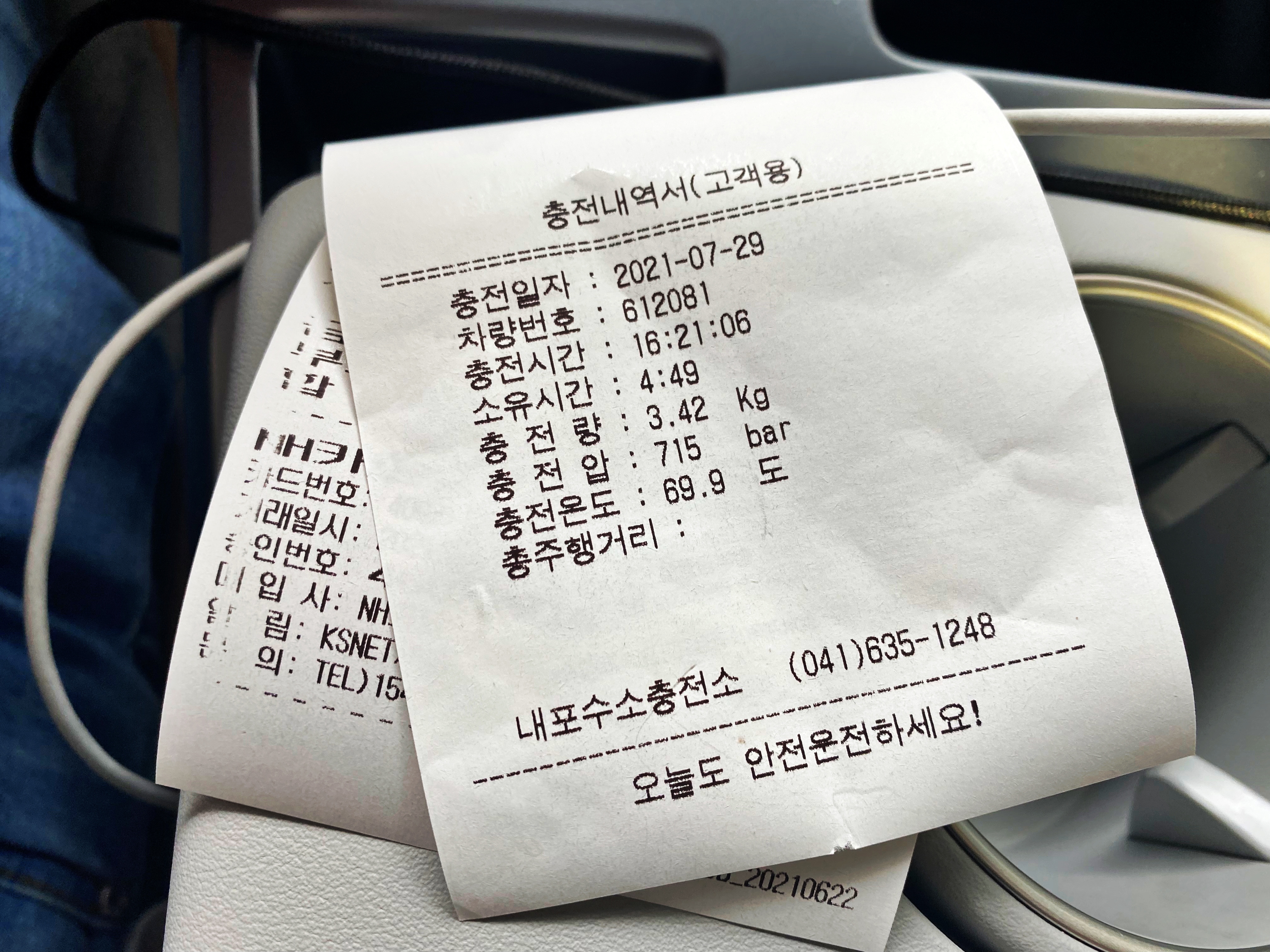너그럽게 기다립니다. 전기차라면 충전에 꽤 오랜 시간이 소요됩니다만, 수소차 충전은 길어봐야 5분 내외로 끝나니 말이죠. 충전소 직원은 사무실에 들어가 있고, 앞 차 차주는 차 안에 들어가 있습니다. 수소차는 충전시에 문을 열면 안된다 하더군요. 뭐 폭발의 위험성 때문일지는 모르겠습니다만, 원칙은 내리는게 맞는데 더운 여름이고 코로나 탓에 차 안에서 충전을 기다리는게 대부분인듯 보입니다.