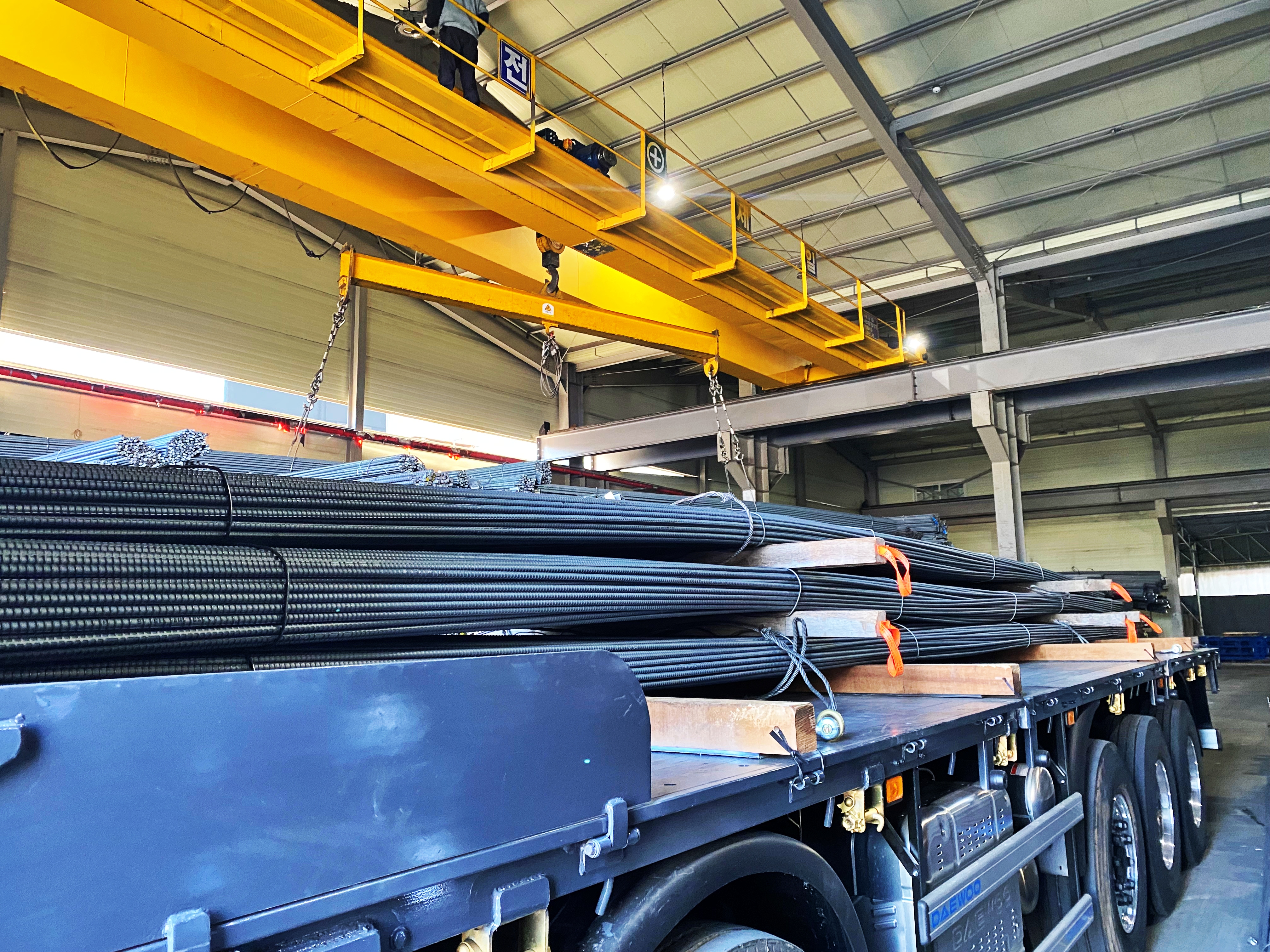철근입니다. 철근 가공공장이나 공사현장 혹은 동네에 하나 둘 보이는 작은 판매점으로 배송됩니다. 천장크레인에 달려있는 저 마그네틱으로 철근을 붙여 들어올린 뒤 차량의 적재함 위에 올려줍니다. 보통 철근의 굵기나 길이같은 규격에 따라 3~4층까지 쌓이는 경우도 있고, 2층까지 쌓이는 경우도 있습니다.