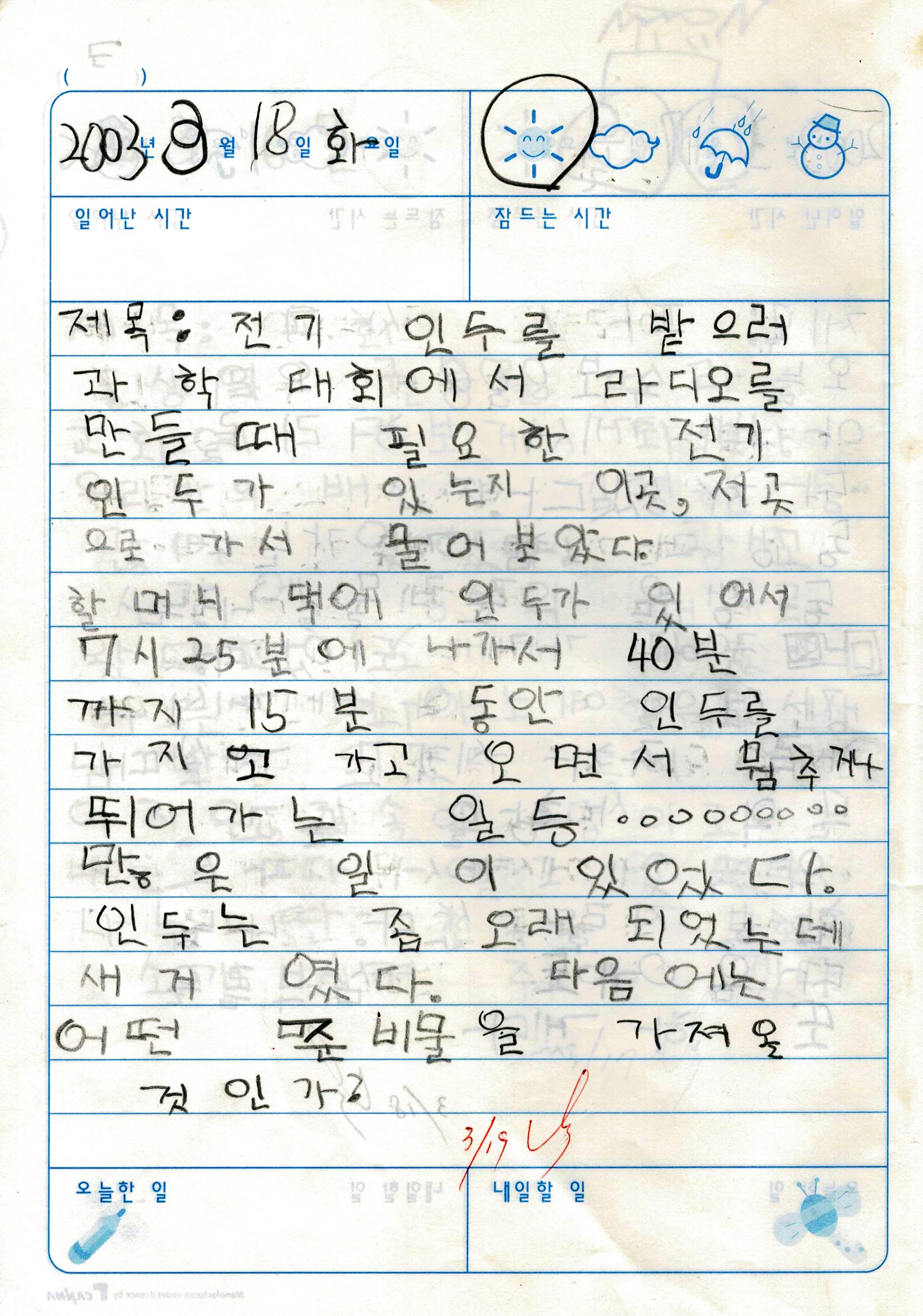 오늘은 2003년 3월 18일의 일기를 가져왔습니다. 당시 학교에서 진행되던 과학경진대회 라디오 만들기에 흥미가 생겨 참가를 결정했고, 준비물로 인두기가 있어 인두기를 가지러 갔다는 내용입니다.