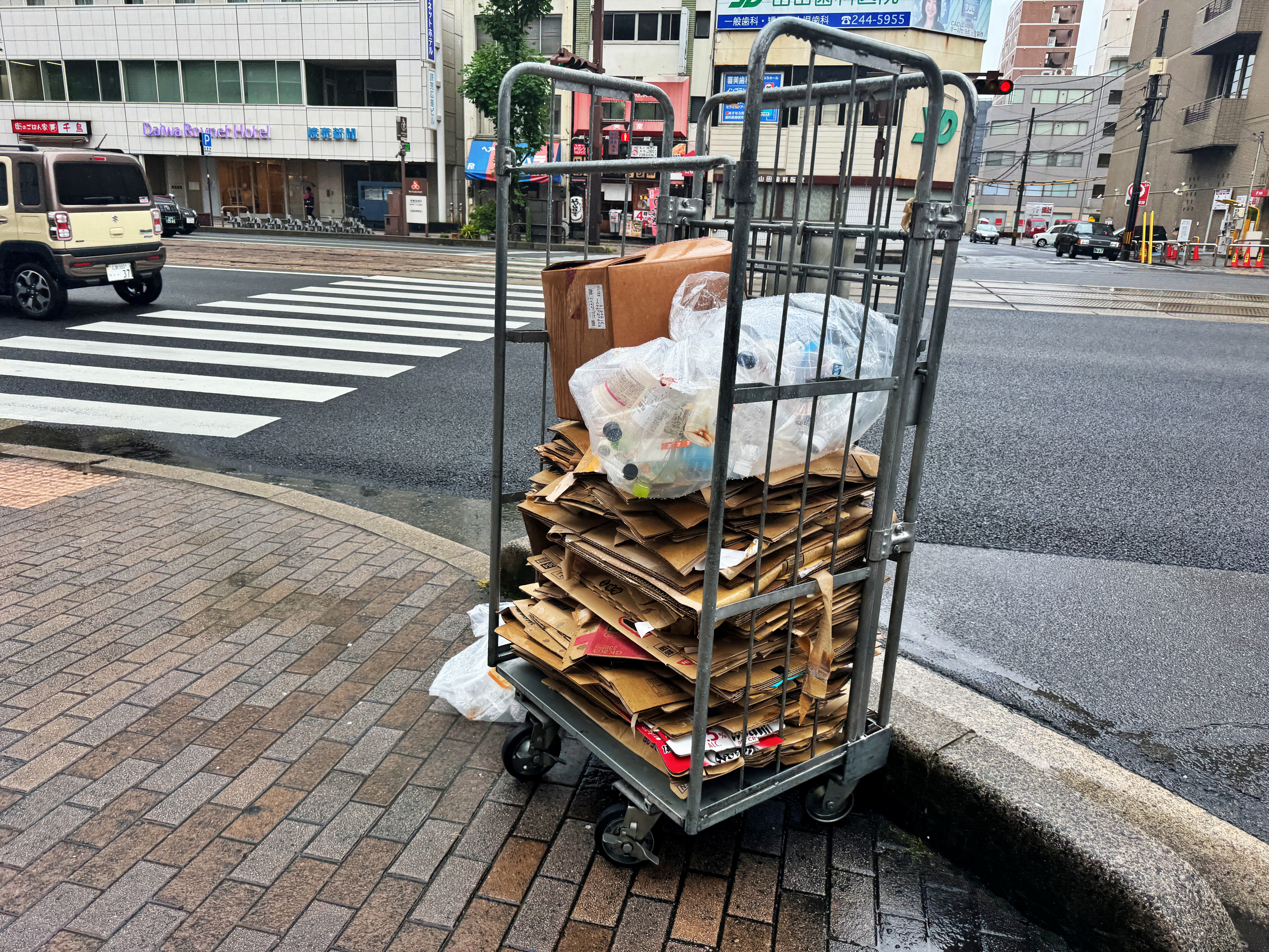 다른 도시에선 쉽게 볼 수 없었는데 히로시마에서는 이렇게 내놓은 박스들을 꽤 많이 봤습니다. 번화가의 영업을 마친 식당에서 내놓은 박스들도 봤고요. 이건 편의점에서 내놓은 박스로 보입니다. 사실상 한국은 누구라도 의지만 있다면 폐지를 수거하여 고물상에 팔아 이익을 취할 수 있는 민간의 영역으로 여겨지지만 일본에서는 공공의 영역에서 처리한다고 하네요. 지자체에 등록된 사람만이 수거 할 수 있다고 합니다.