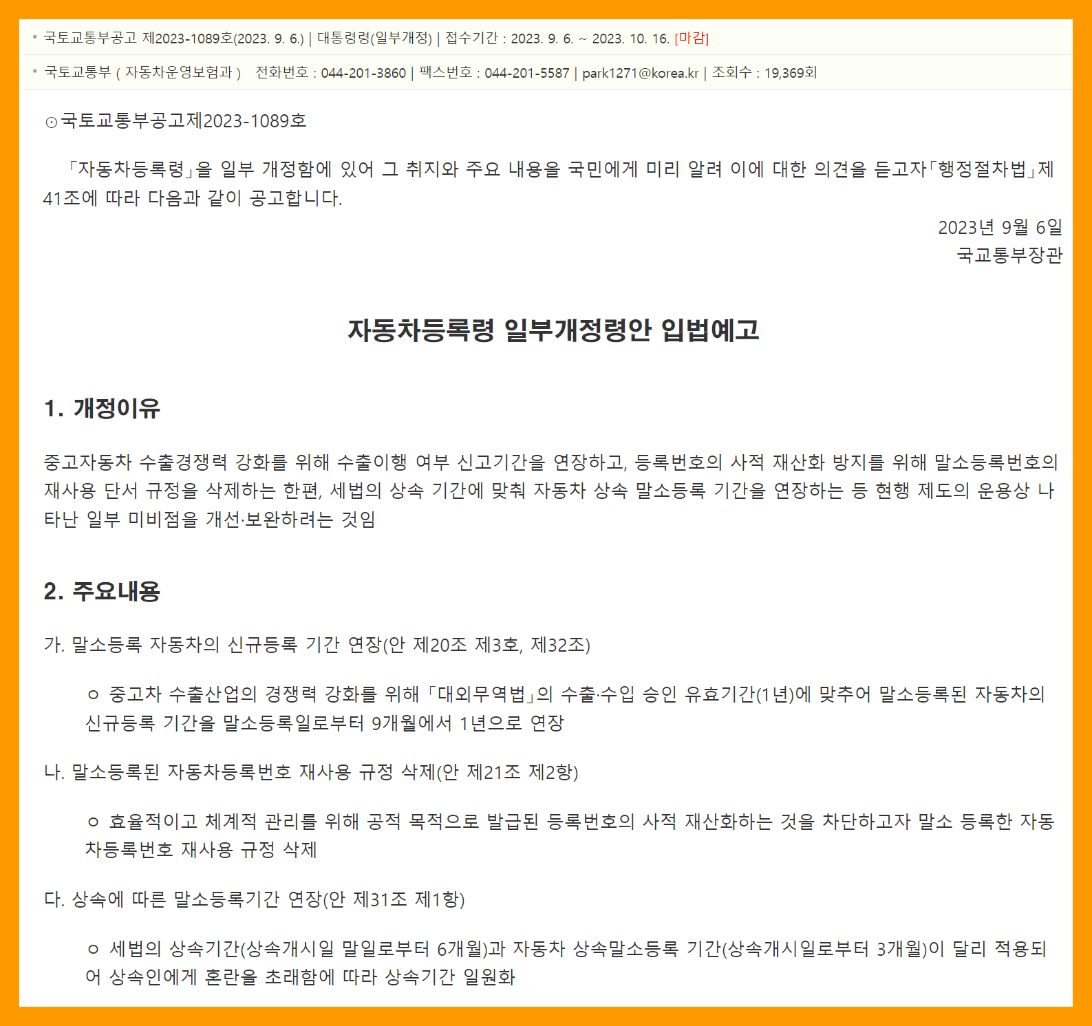 지난해 가을 국토교통부는 국가자원인 자동차 등록번호의 사유화를 막겠다는 취지에서 21조 2항을 삭제하는 내용이 담긴 대통령령인 자동차등록령 개정안을 입법예고했었습니다. 그러니 잠시 골드번호 차량 가격들이 떨어지더니만 지금은 다시 오른 듯 보이더군요.