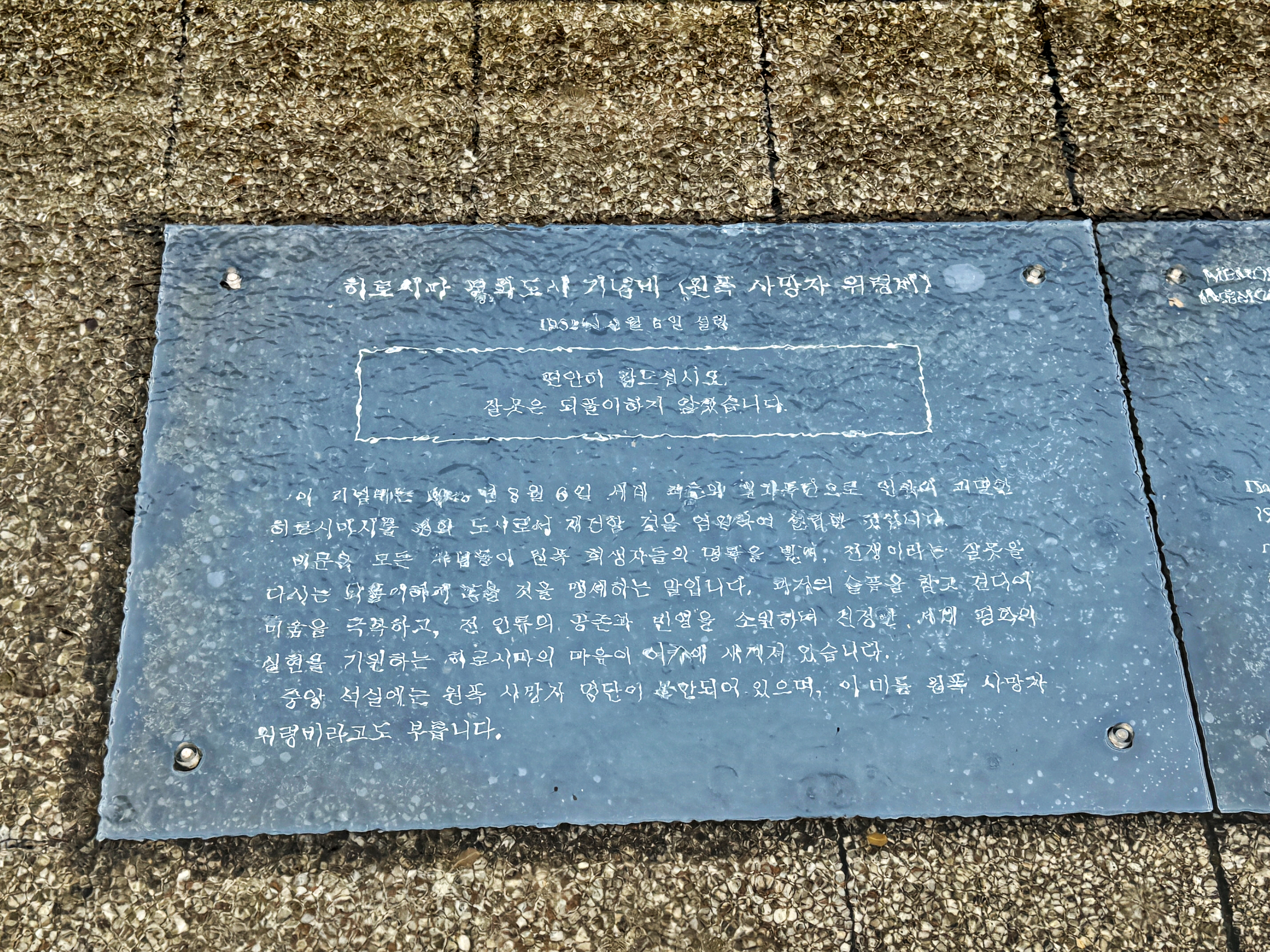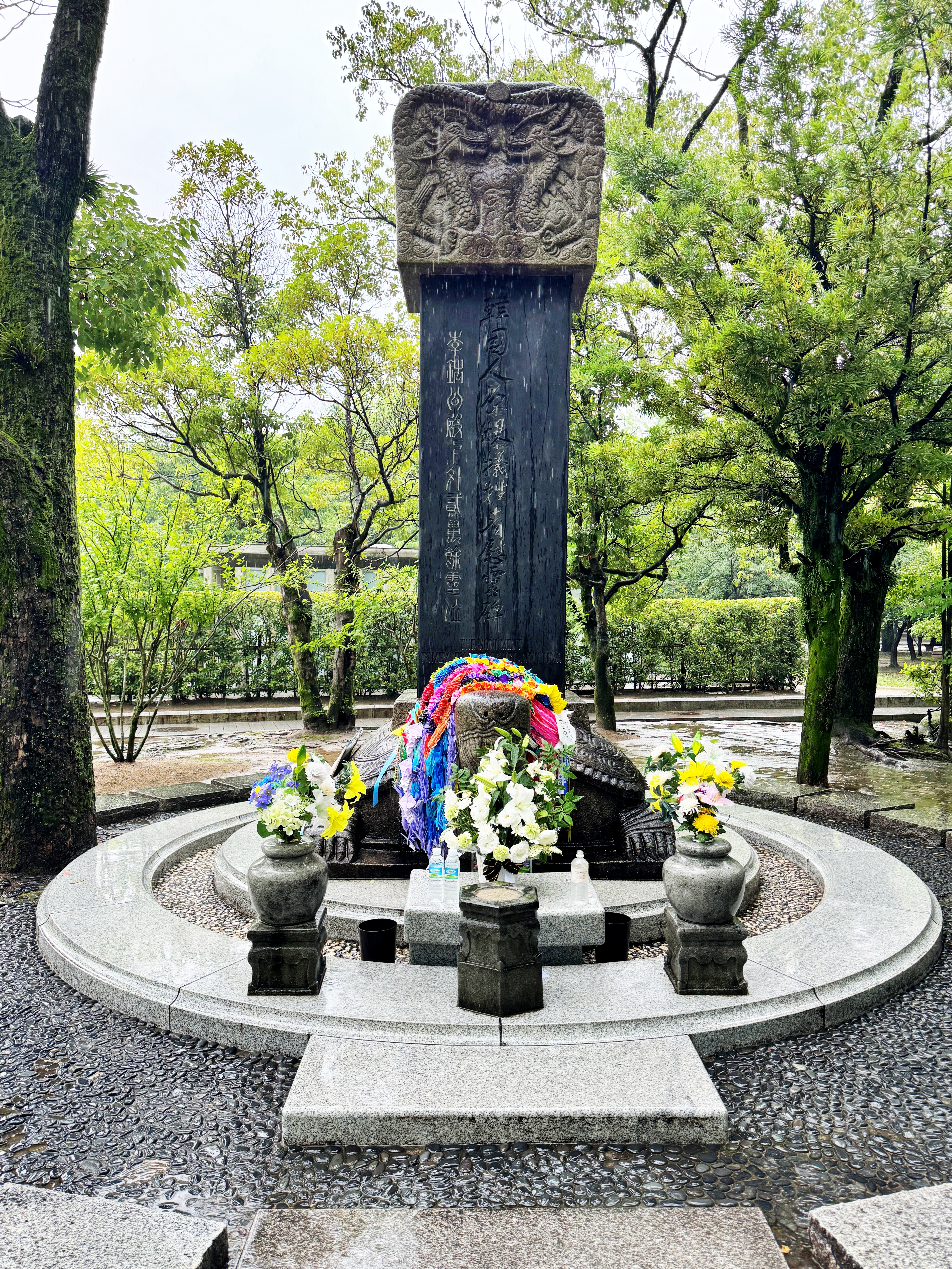 나가사키도 마찬가지고 시대적으로 많은 한국인들이 일본 본토에서 활동하고 있었습니다. 그런고로 나가사키에도 한국인 희생자를 기리는 위령비가 존재했고 히로시마에도 존재합니다. 예전에 나가사키 위령비에 갔을 때 한국인들이 놓고 간 한국 생수와 소주 그리고 사탕과 같은 물건들을 많이 봤던 것으로 기억하는데 비가 내려서 그런지 히로시마의 위령비에서 그런 한국의 물건들은 그리 많이 볼 순 없었습니다.