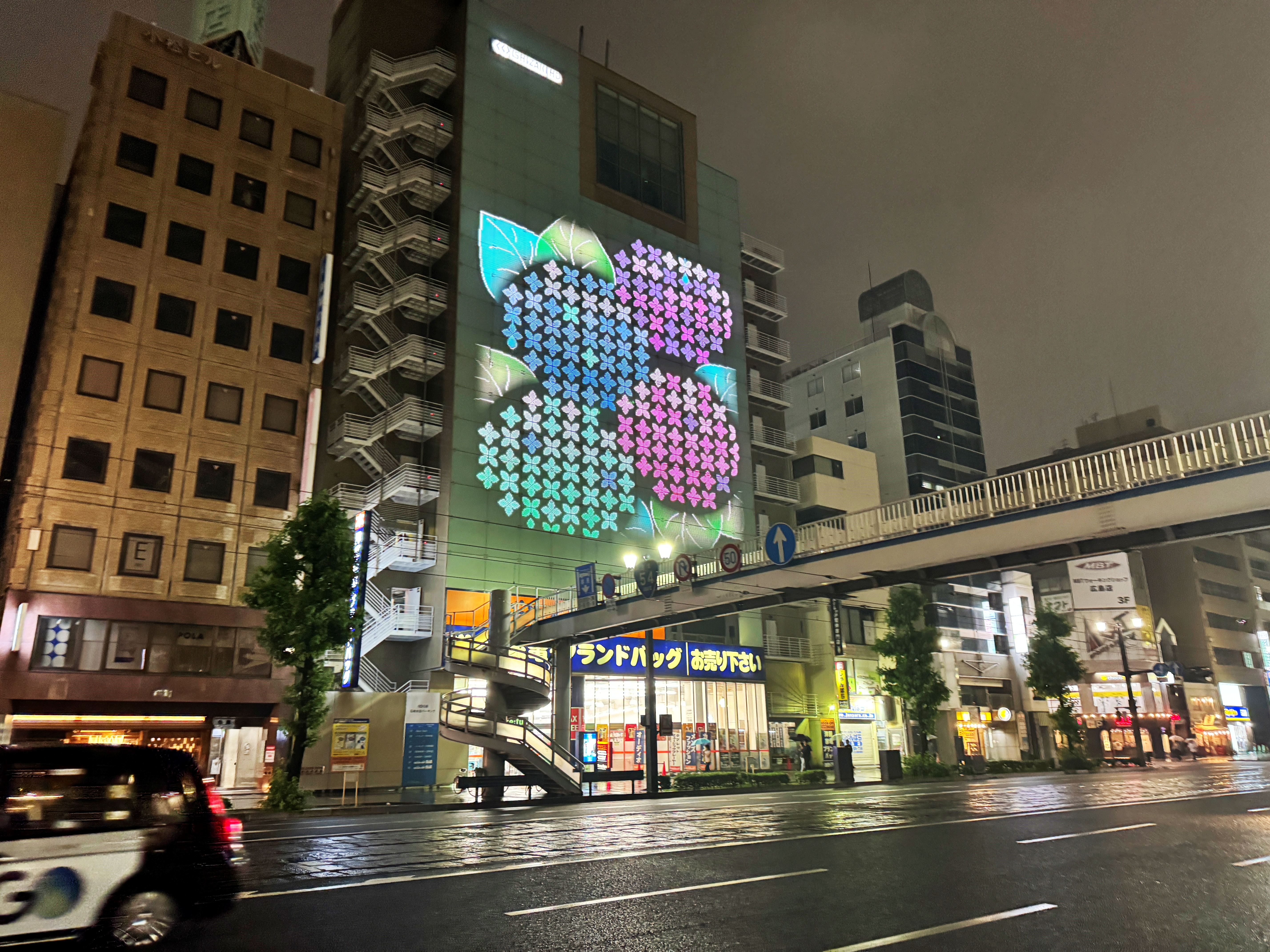 해가 저무니 평범했던 건물이 화려해졌습니다. 이런걸 미디어파사드라고 한다고 하네요. 일단 호텔에 들어가서 잠시 쉬다가 다시 나왔습니다. 꼬치에 술이나 한 잔 하러 가자고 하시네요. 그래도 히로시마의 번화가는 호텔에서 걸어다닐만한 거리입니다.