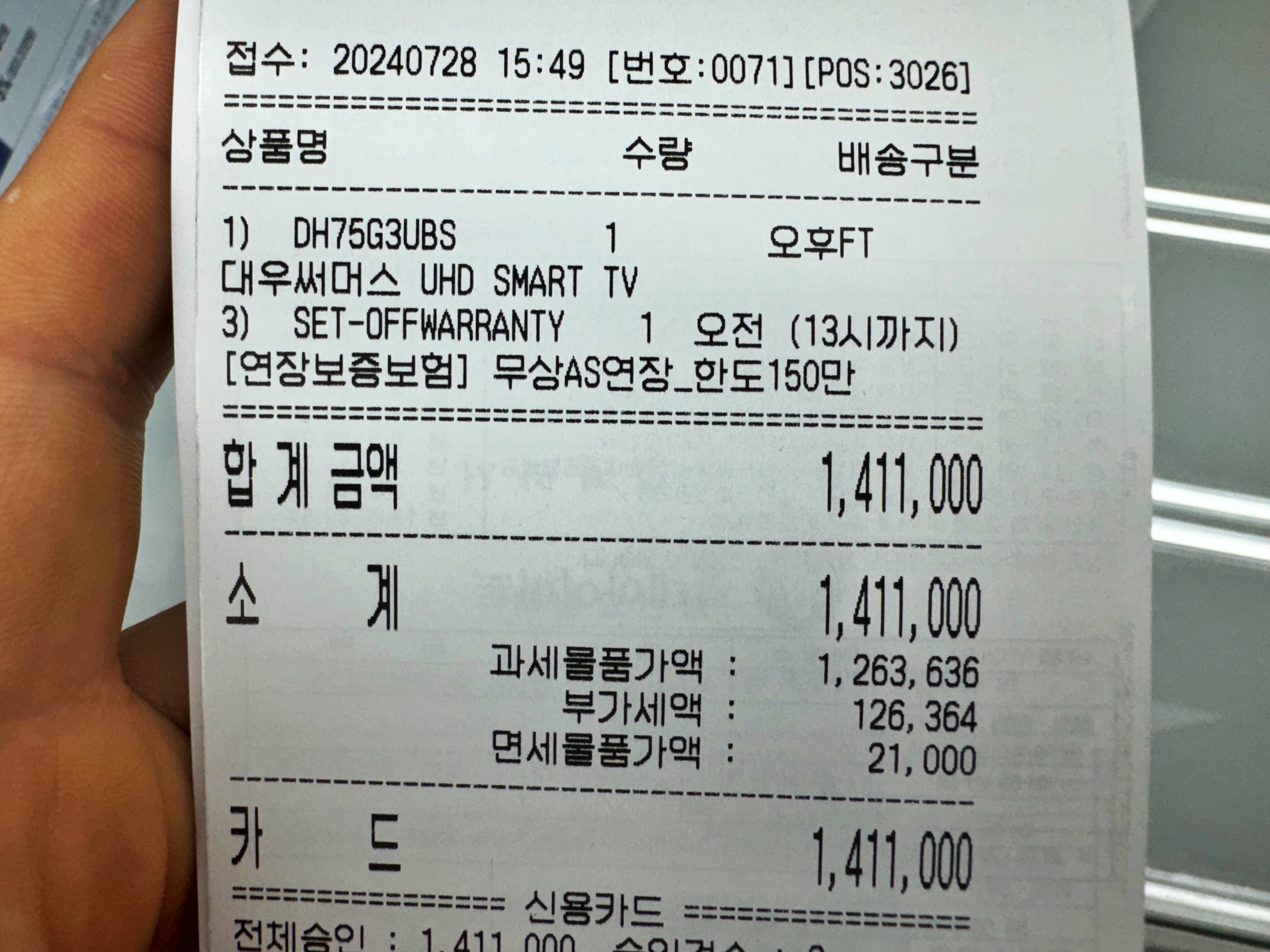 워런티 연장에 벽걸이 설치비까지 포함하여 1,411,000원을 결제했습니다.
