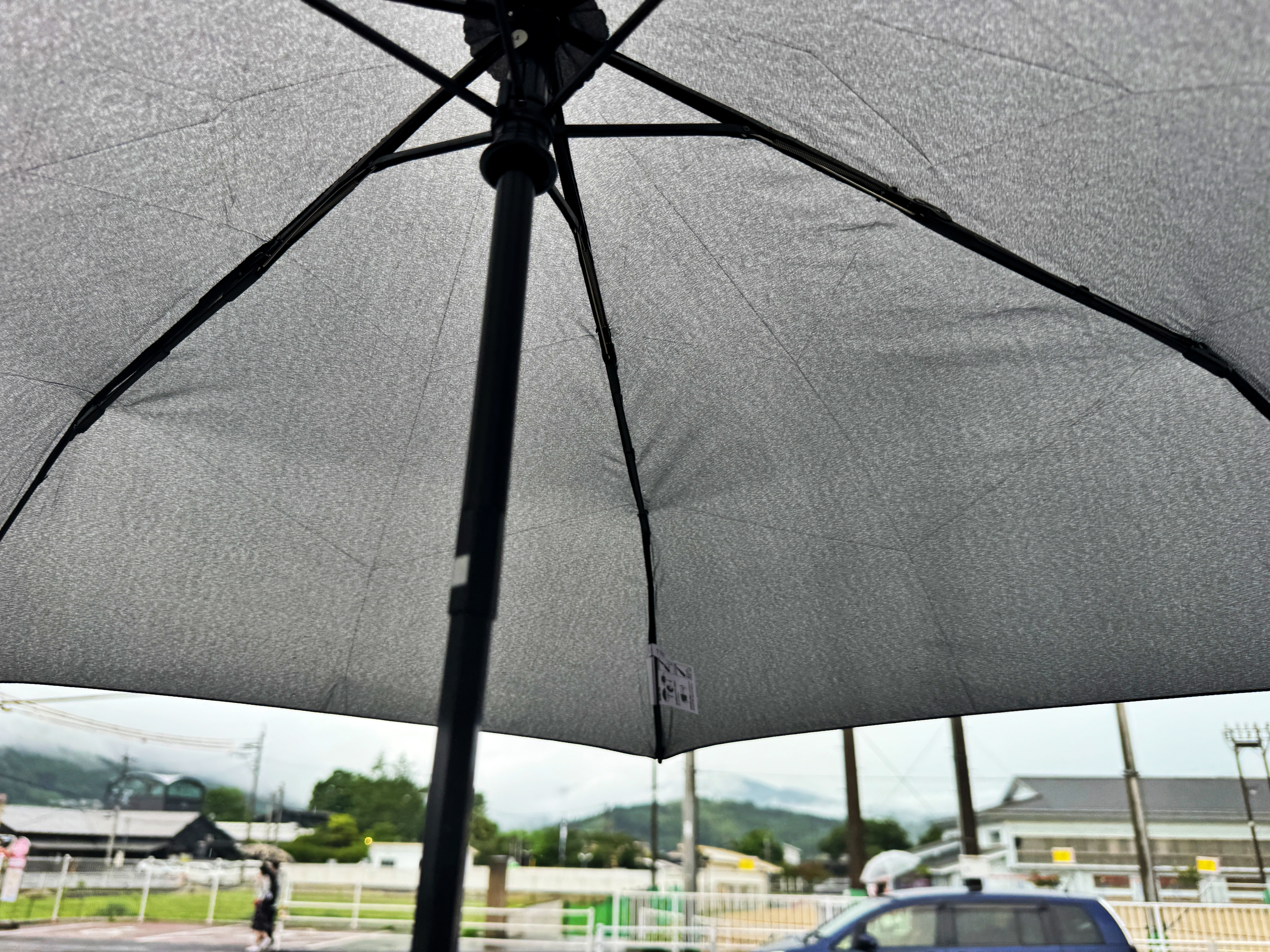 이 접이식 우산을 들고 유후인을 향해 걸어갑니다.