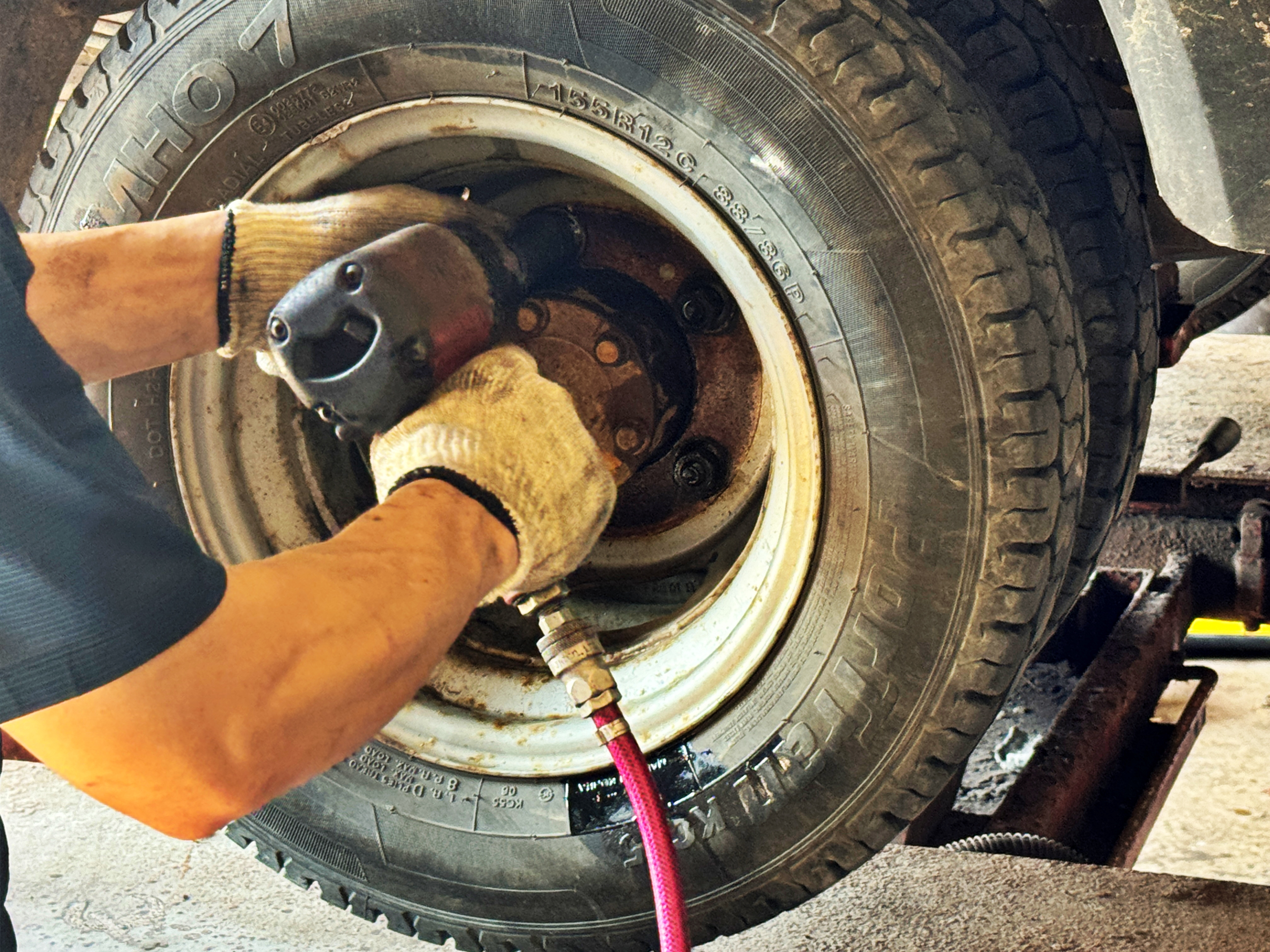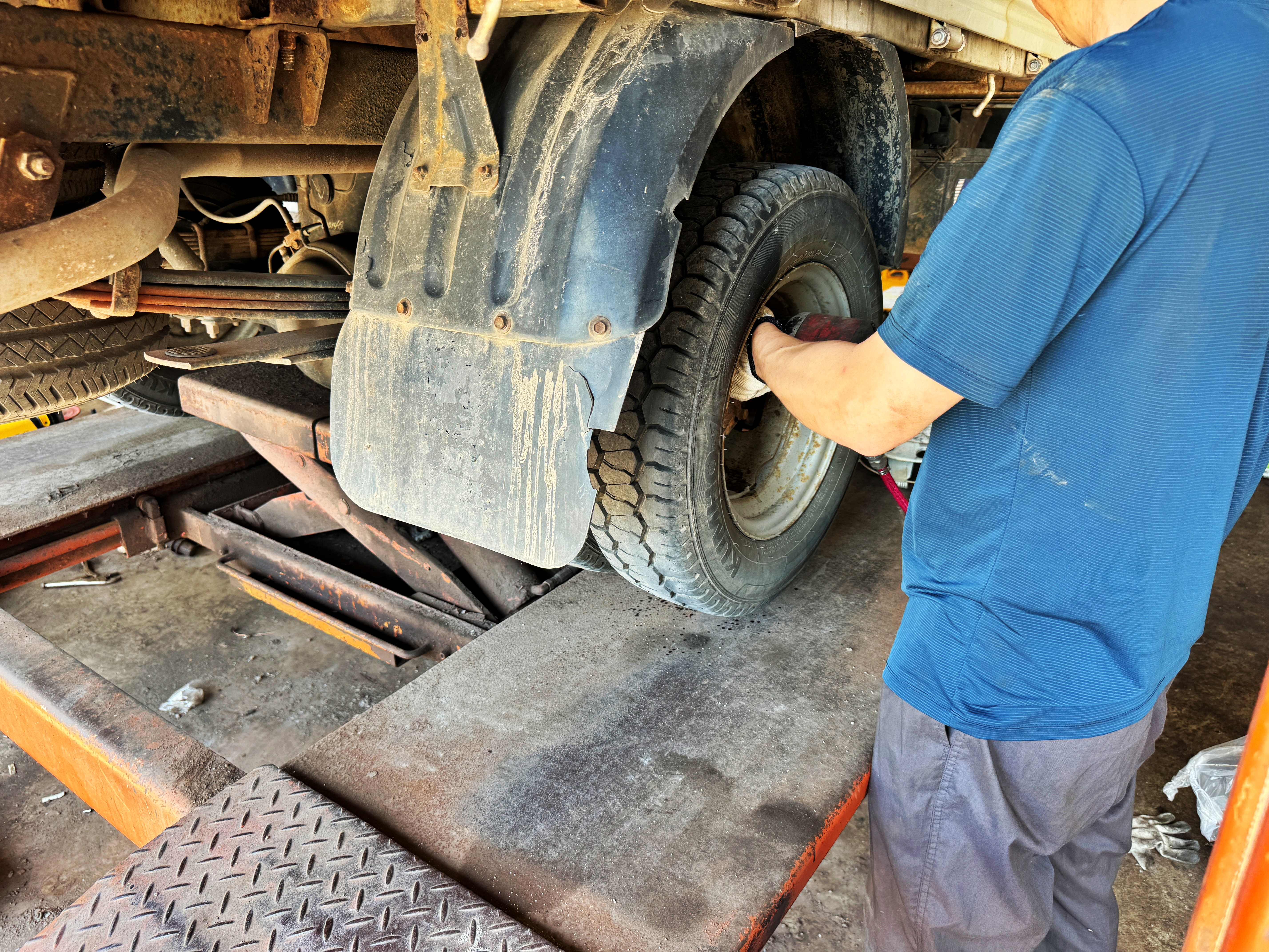 일단 우측부터 매우 능숙하게 휠캡을 탈거하고 너트를 풀고 휠타이어를 분리하며 빠른 작업이 진행됩니다. 어느 카센터를 가더라도 수입차나 고급차를 전문적으로 만지는 곳이 아닌 이상 최소 하루에 한 대 이상은 입고되는 흔하디 흔한 차가 1톤 트럭이니 다들 능숙하게 하실 겁니다.