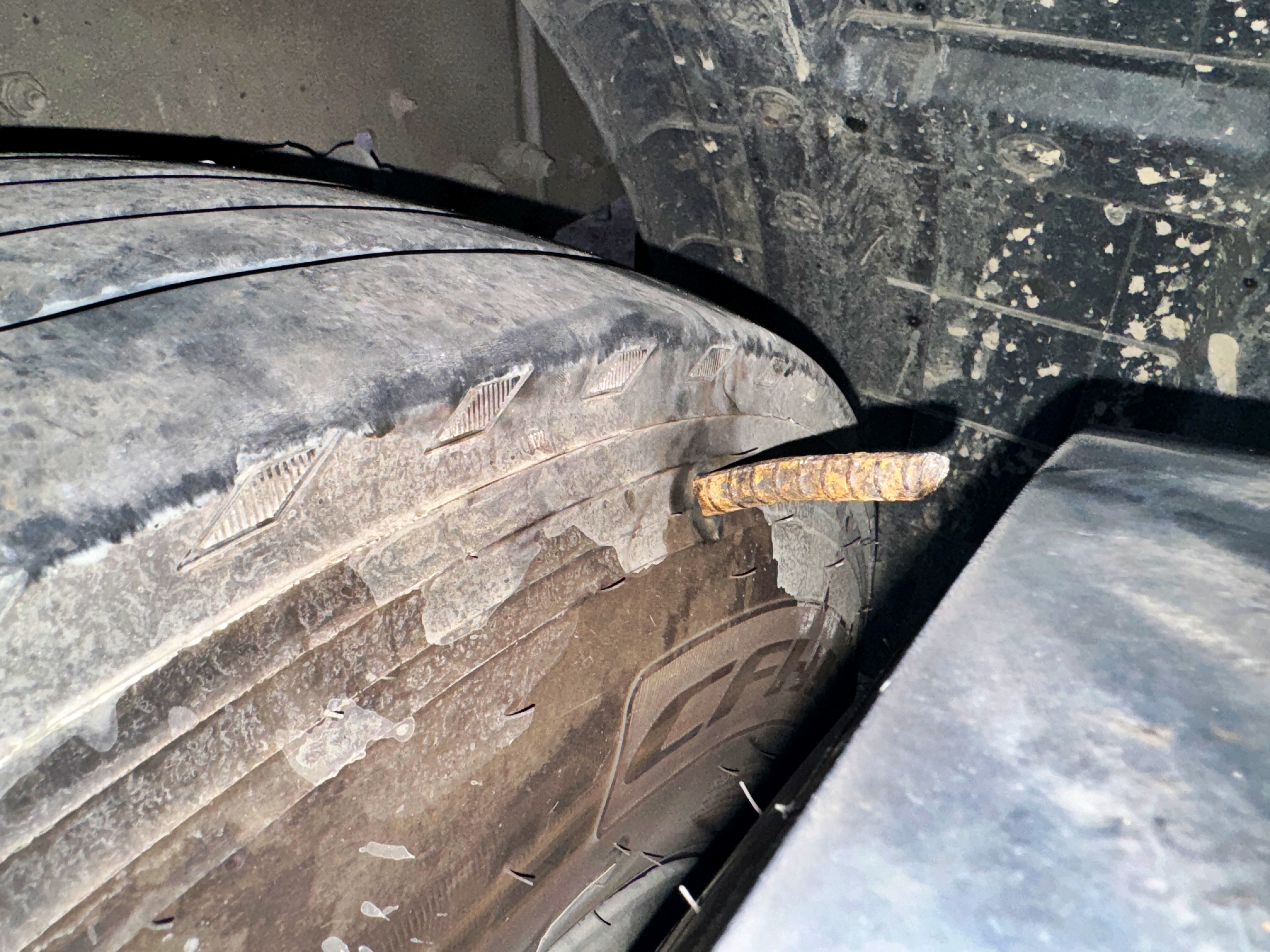 타이어를 탈착 하고도 쉽사리 빠지지 않습니다. 바깥에서 보이는 철근의 길이보다 타이어 안쪽에 박혀있는 철근의 길이가 더 깁니다. 이게 대체 어떻게 박혀있는지, 그나마 다행으로 하나만 건드리고 말았는지 보면 볼수록 미스터리 그 자체입니다.