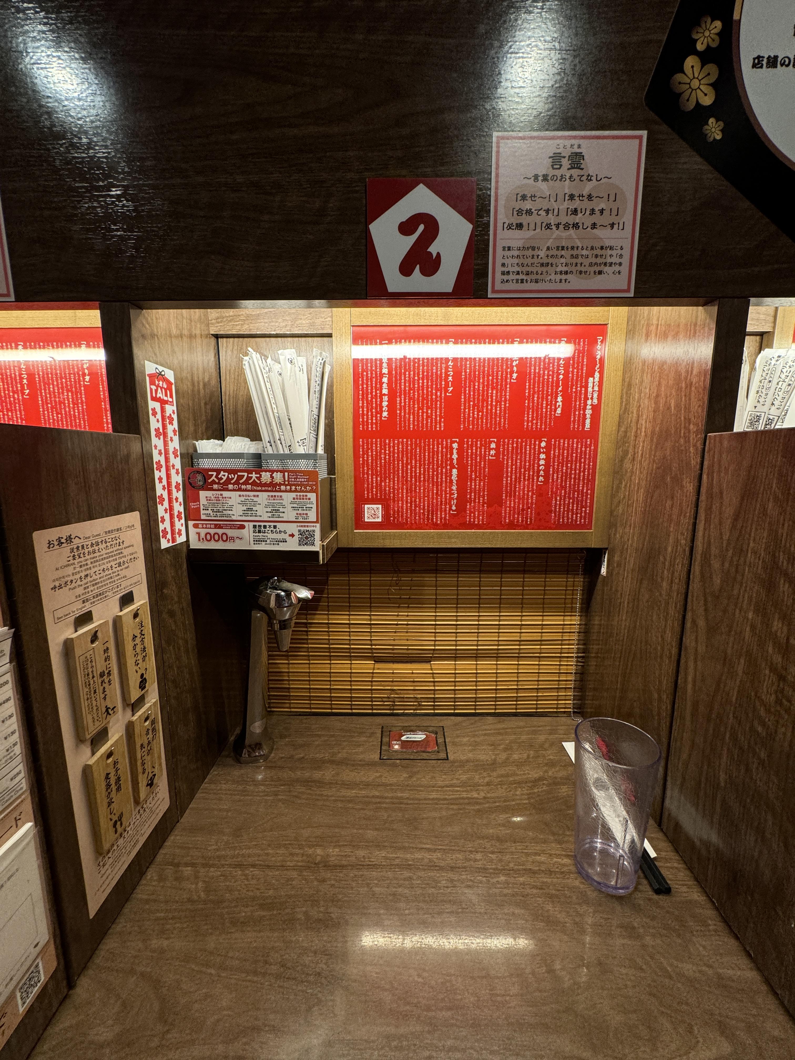 착석하여 주문표와 티켓을 발 너머의 직원에게 건네줍니다. 그리고 기다립니다.