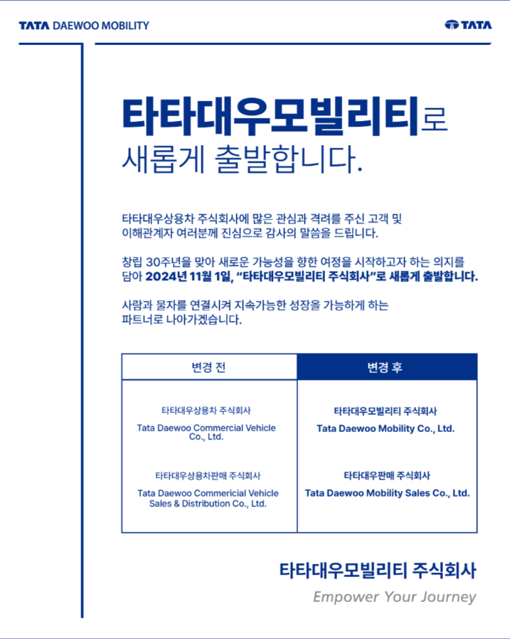 아 그리고 타타대우상용차의 새 사명이 확정된듯 보입니다. 다행히 대우를 떼어내지 않고 기존 사명에서 '상용차(commercial vehicle)' 대신 '모빌리티(mobility)'를 넣는 방향으로 바뀌나 봅니다.