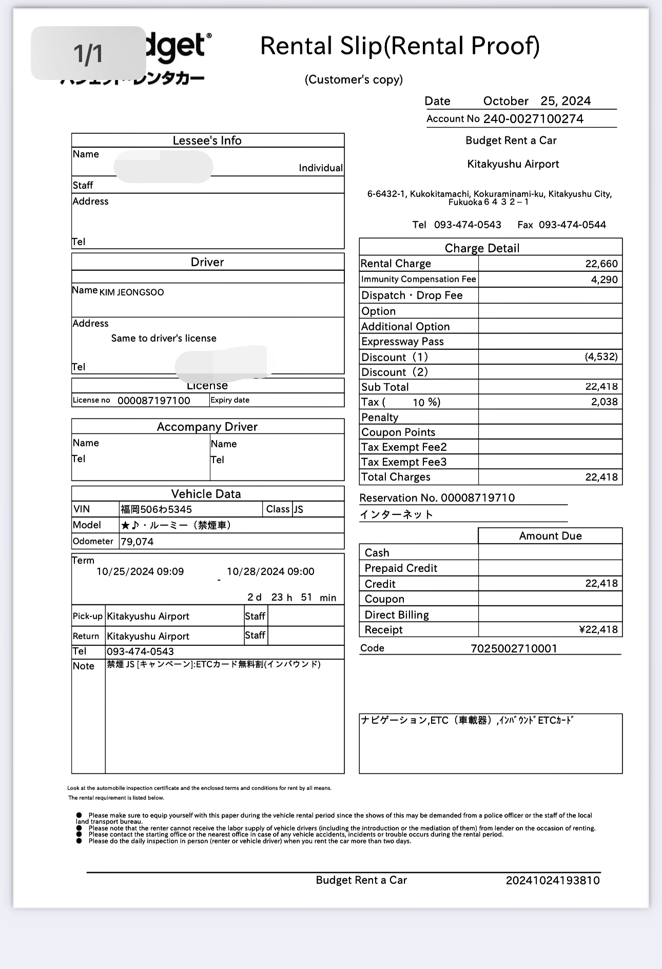 혼자 타는데 경차면 족합니다만, 경차가 모두 매진되어 소형차를 대여했습니다. 보험 보장도 추가하고 이거 저거 넣고 하니 22,418엔이나 나오네요. 거기에 KEP까지 추가하니 3만 엔 가까운 돈이 나왔습니다. 먼 거리를 다녀야 하는 상황이 아니라면 도심에서 혼자 타고 다니기에 확실히 렌터카는 가성비가 떨어집니다.