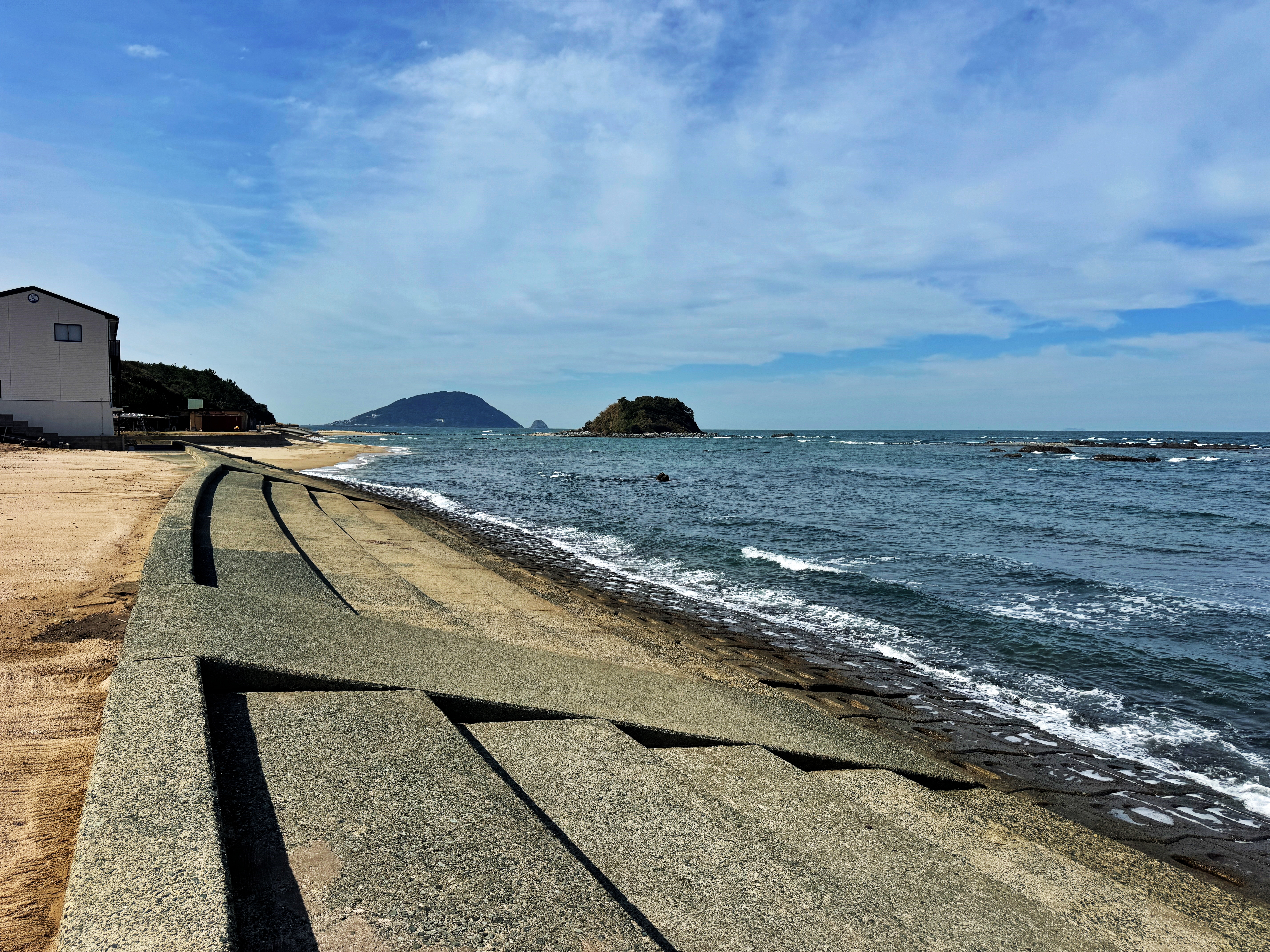 이 일대는 시카노시마 북쪽의 카츠마 해수욕장(舞能ノ浜)입니다. 해수욕장과 바로 맞닿아 있어 여름철이라면 해수욕도 함께 즐길 수 있었겠지요. 그렇게 바닷물을 좋아하지 않는 사람인지라 혼자 와서 바닷물에 빠질 생각 자체를 하진 않겠습니다만, 아마 한여름에 온다면 시끌벅적 했을 겁니다.