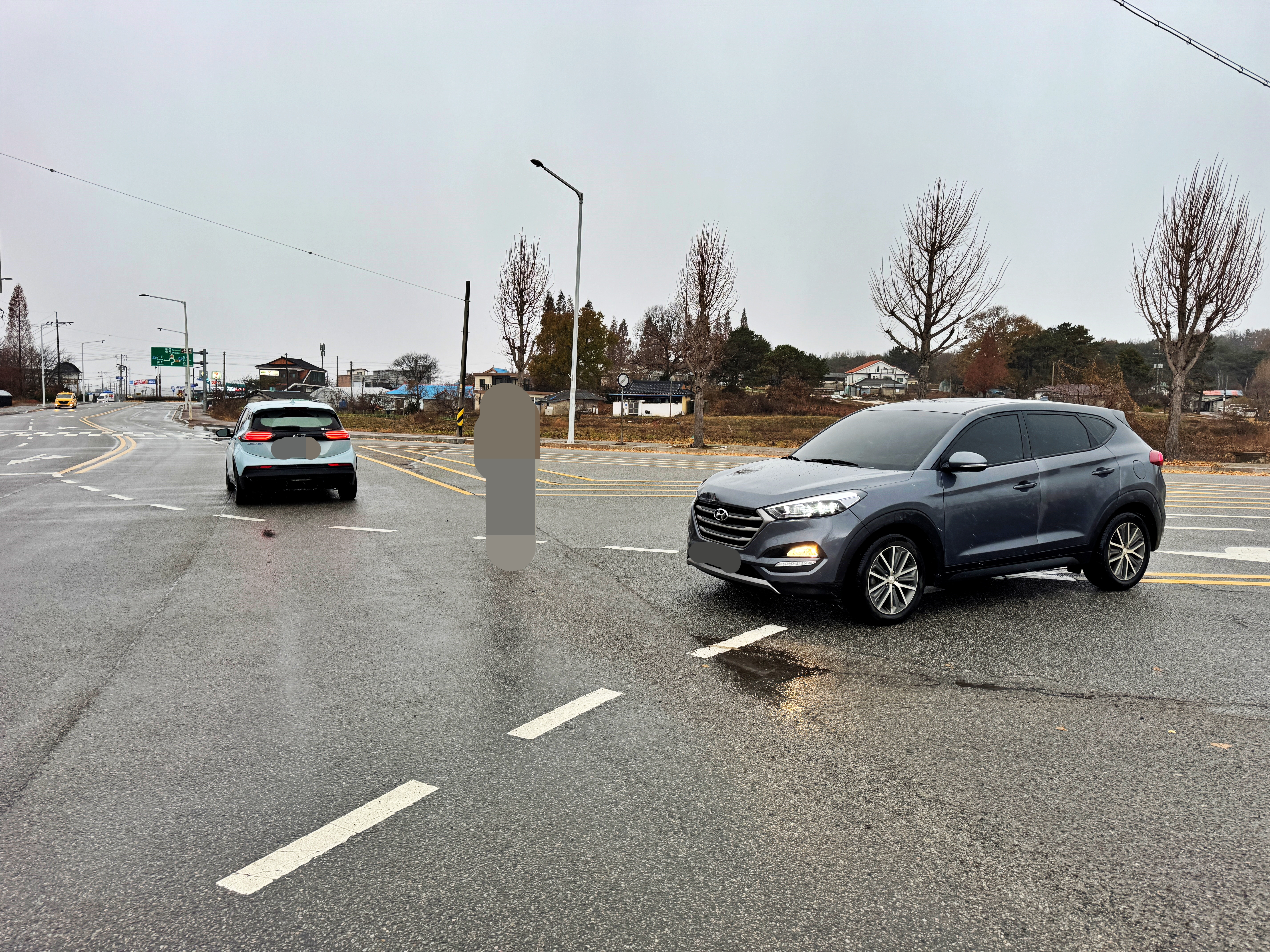 제각기 좌회전을 기다리는 차들이 서있는 모습을 확인하고 직진했는데, 상대 차량이 갑자기 움직이네요. 갑자기 투싼이 움직이는 모습을 보고 경적을 누르며 속도를 줄였지만 경적과 함께 충돌하고 말았습니다.