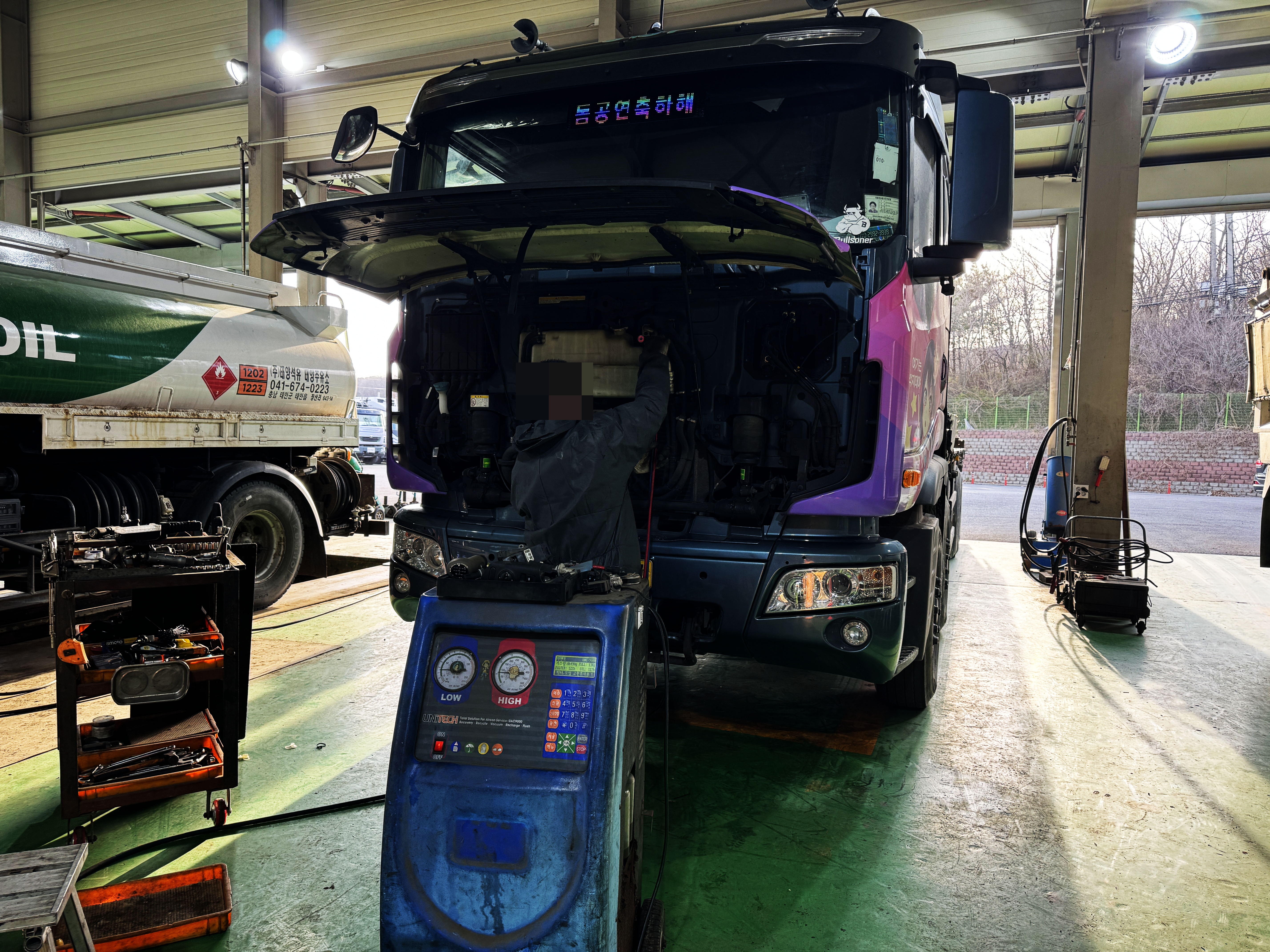 애초에 일반 스캐너로 타타대우의 고장코드를 읽을 수 없기에 스캐너가 있는 정비소를 가거나 이렇게 공식 센터로 들어와야 합니다. 대충 DPF 등이 깜빡거린다는 이야기를 하고 차를 바로 정비고에 입고시킵니다.