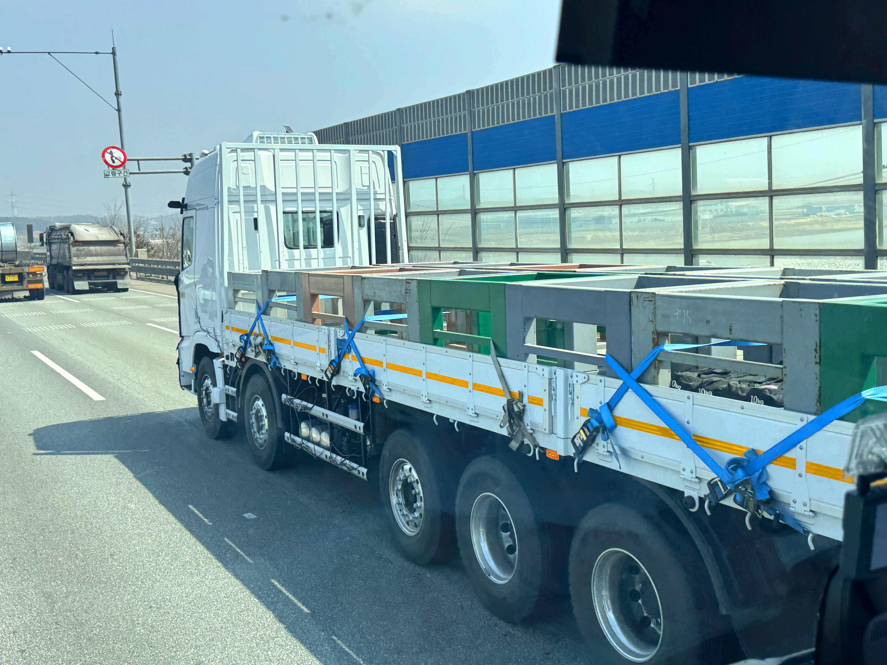 지난번에 본 차량과 달리 이번에 본 차량은 25톤 중축에 하이탑이 적용되었고 소문만 무성했던 전자식 사이드미러. 흔히 말하는 미러캠이 적용된 차량이었네요. 1축과 2축 사이에 무슨 센서가 또 하나 생기는 모양인데 가까이에서 차량을 볼 수 있어 흥미로웠습니다.