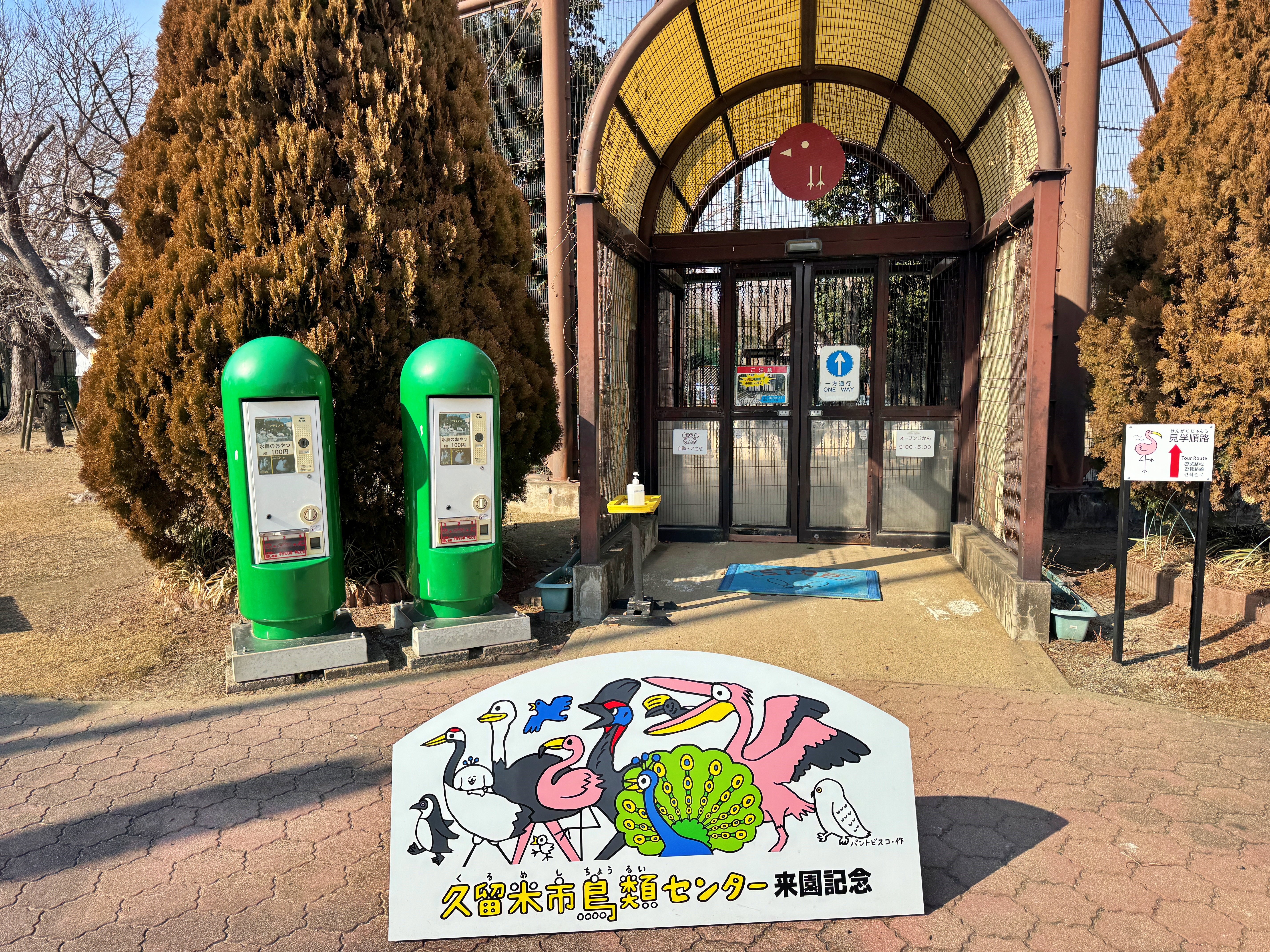 구루메시 조류센터 내원기념이라 적힌 팻말과 함께 홍학과 오리들이 살고 있는 우리 안으로 들어갈 수 있습니다. 직접 모이를 줄 수도 있다고 하네요. 모이는 옆에 보이는 녹색 자판기에서 판매하고 있었습니다.