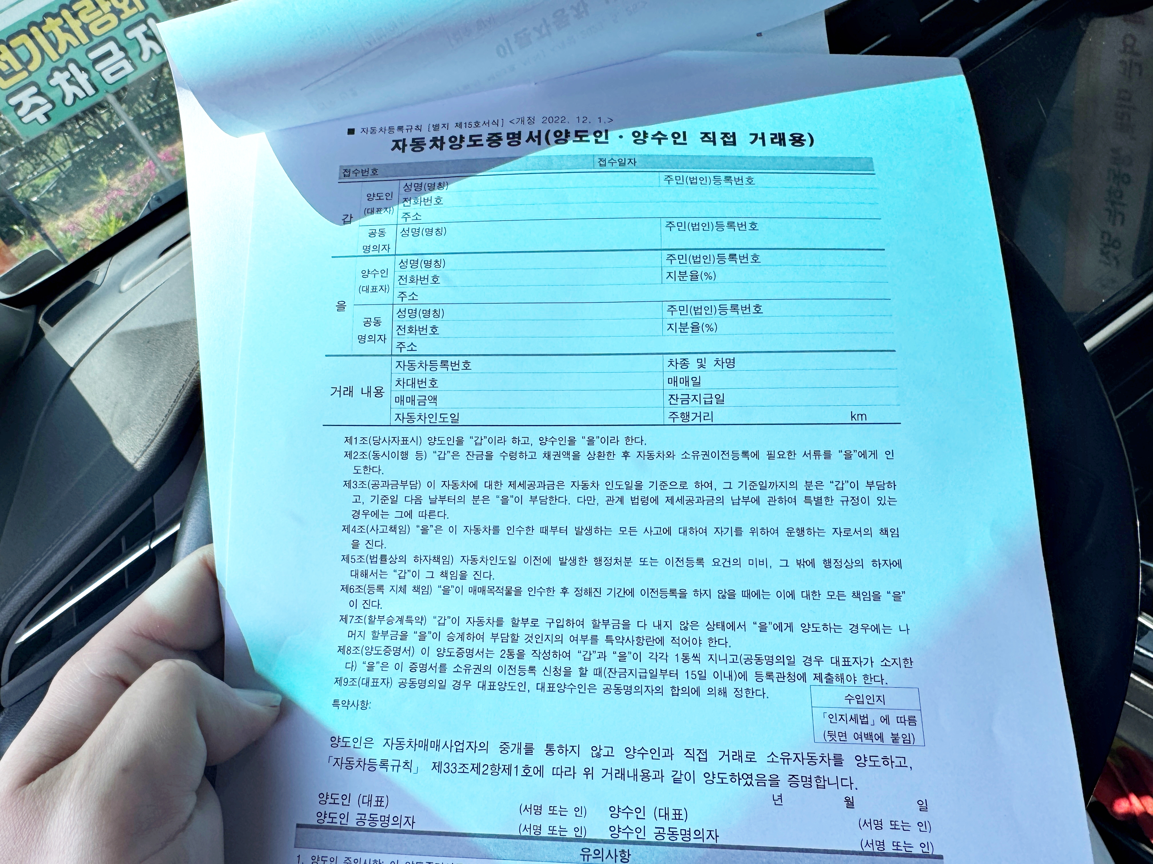 자동차 이전시 작성하는 것과 동일한 자동차양도증명서입니다.