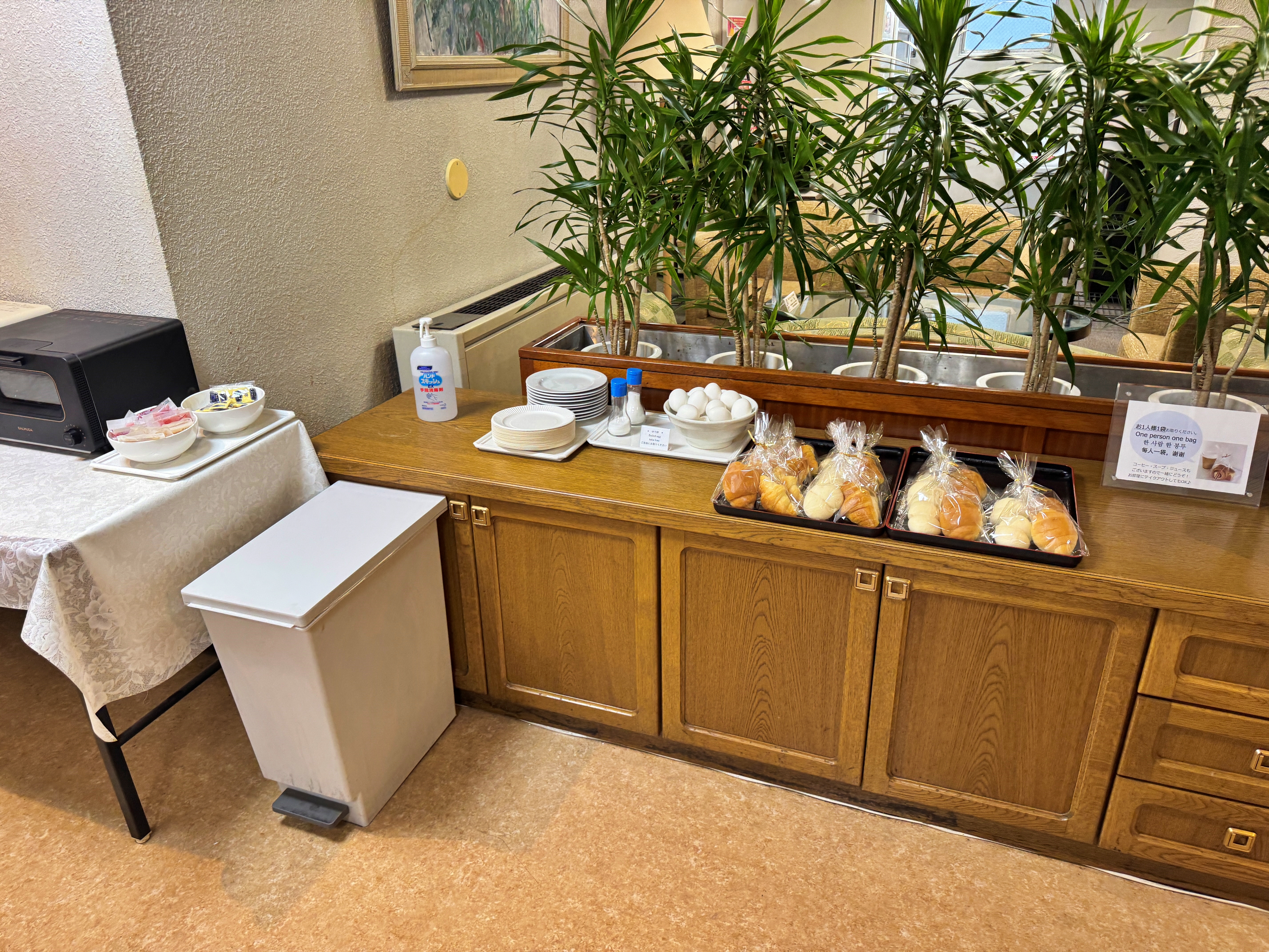 모닝빵이 나오는군요. 봉지에 들어있는 빵의 종류는 모두 같습니다. 두개 주워다 먹어도 상관은 없지만, 일단 하나만 들고 옵니다. 옆에 삶은 계란도 있고 사과잼과 딸기잼도 있습니다. 취향껏 가지고 가면 되겠습니다.