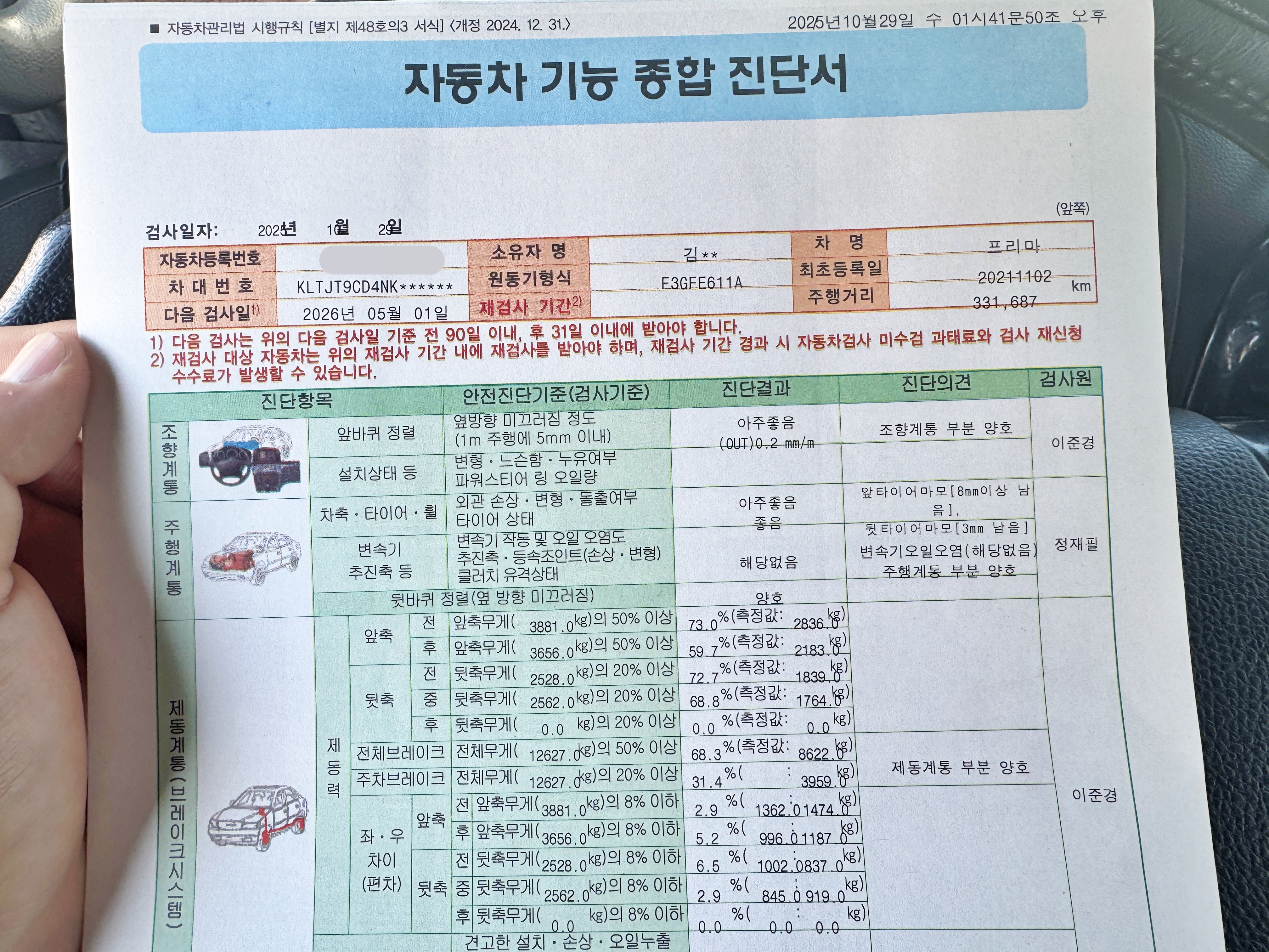 10월에 최초등록된 포터와 11월 2일에 최초등록된 큰 차의 검사가 항상 겹칩니다만, 포터는 1년에 한 번 종합검사만 받으면 되고 영업용 번호판을 달고 있는 이 프리마는 6개월에 한 번 종합검사와 정기검사를 번갈아가며 받아야 하기에 봄가을로 검사를 받게 됩니다.
